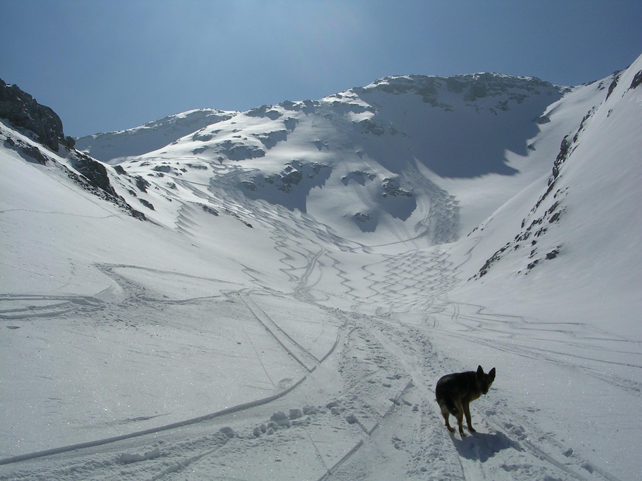 Dann eine traumhafte Pulver-Abfahrt Richtung Blühnbachtal (500 Hm bzw. soweit man will) und zurück zum Marterlkopf.
