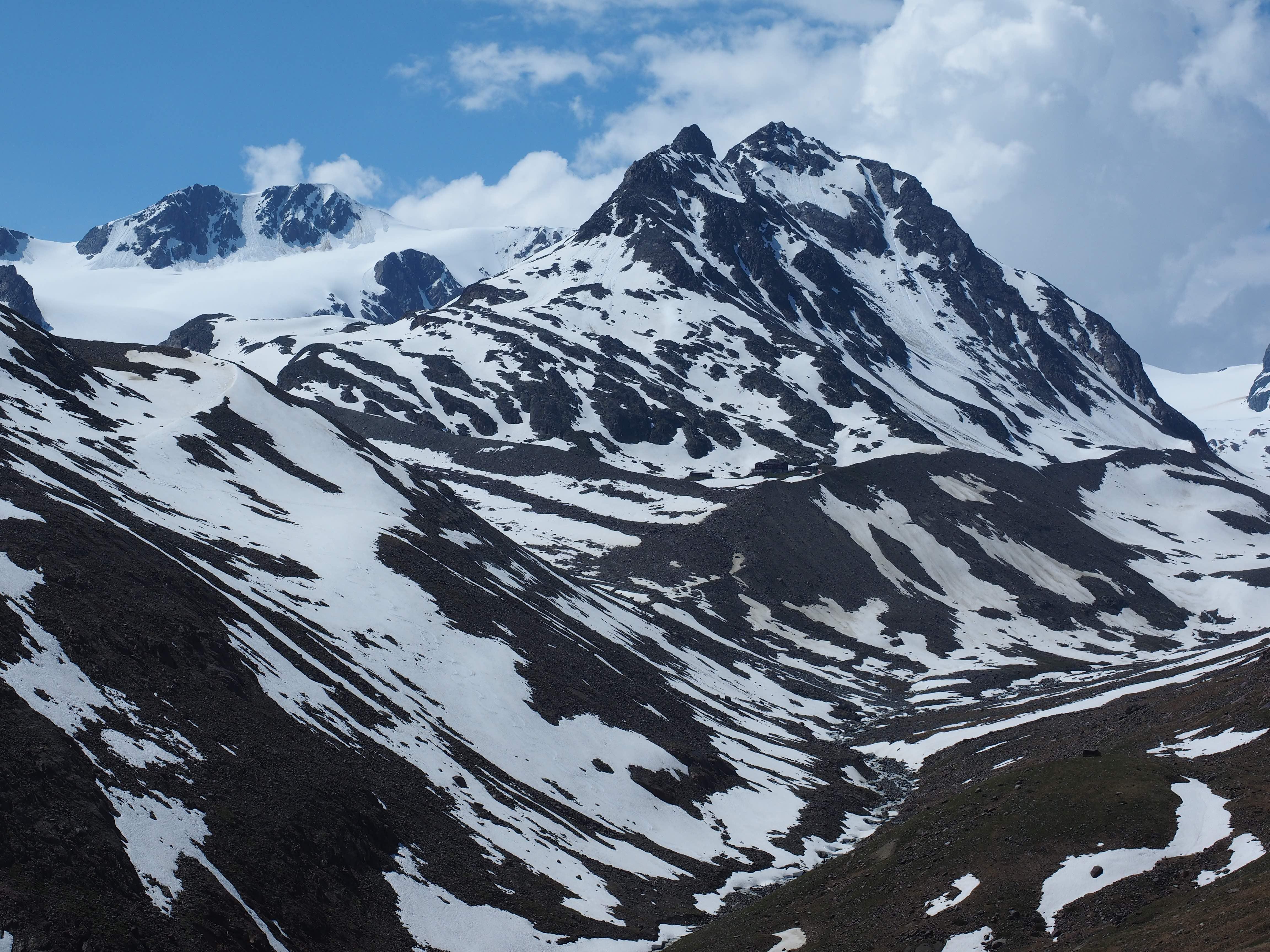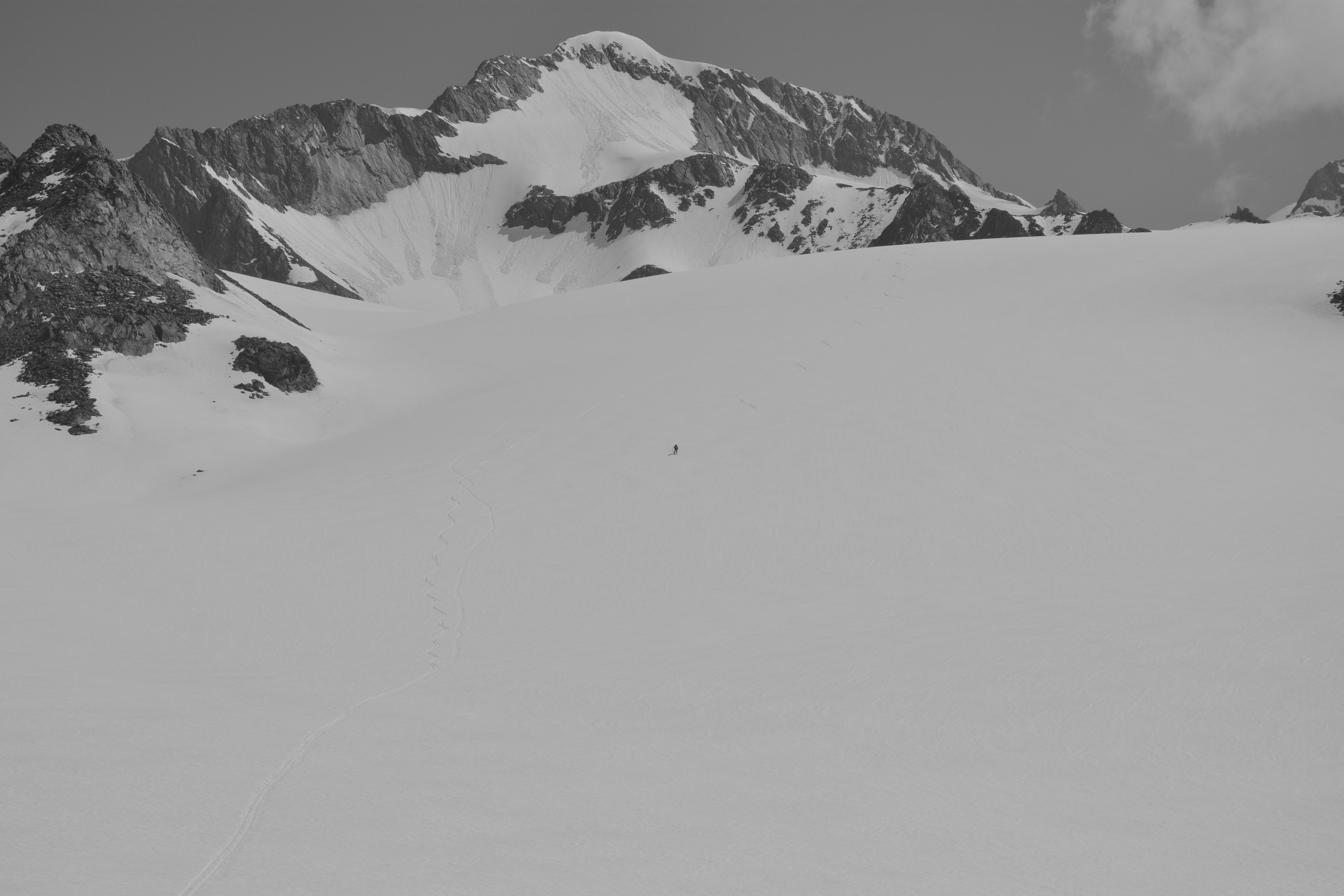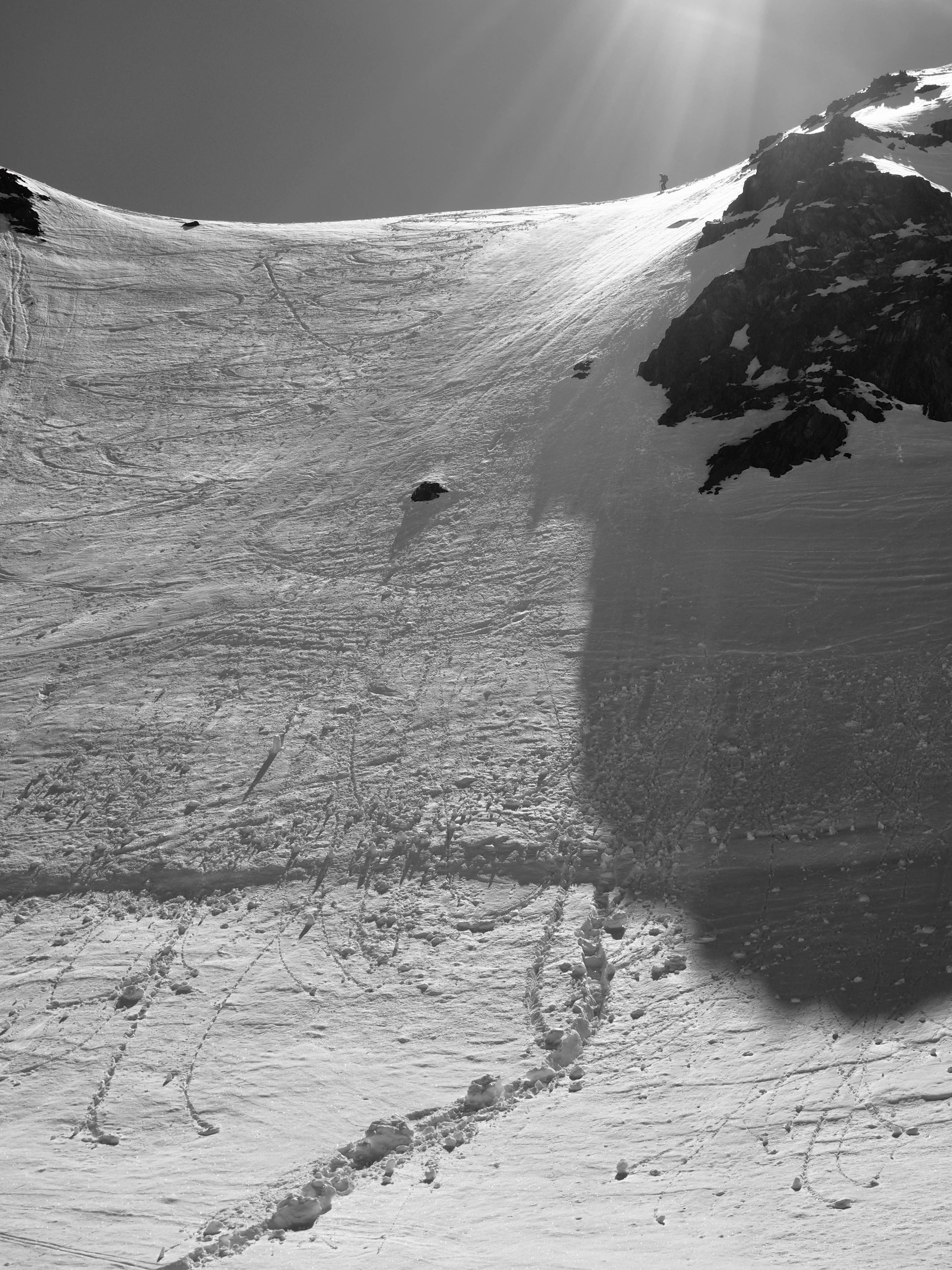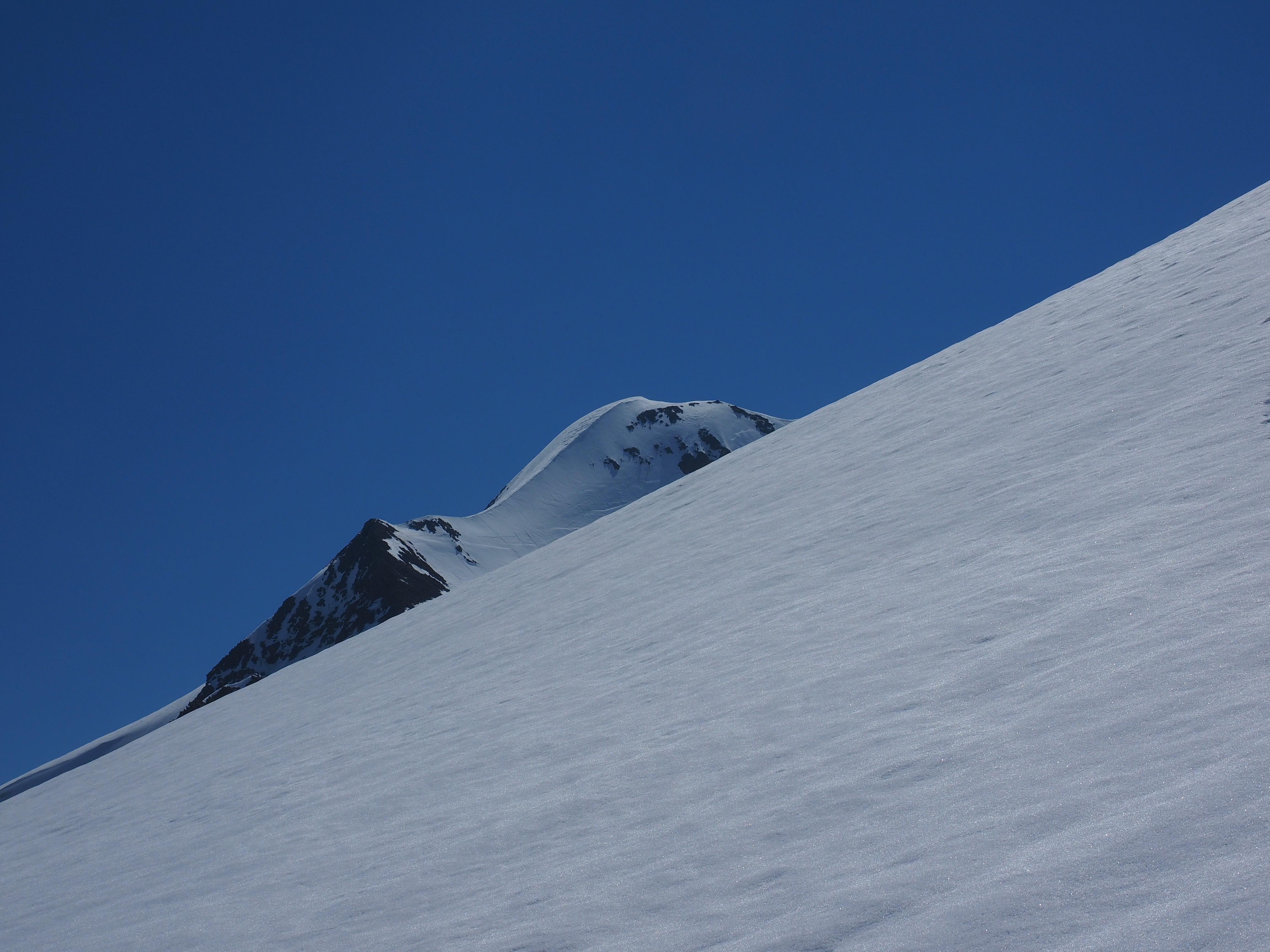 Schnee: Westflanke hart und griffig, sehr gut zu fahren, dann Firn bis ca. 3200, unterhalb bereits (10:00) sulzig, trotz klarer Nacht sind die Temperaturen bereits zu hoch.