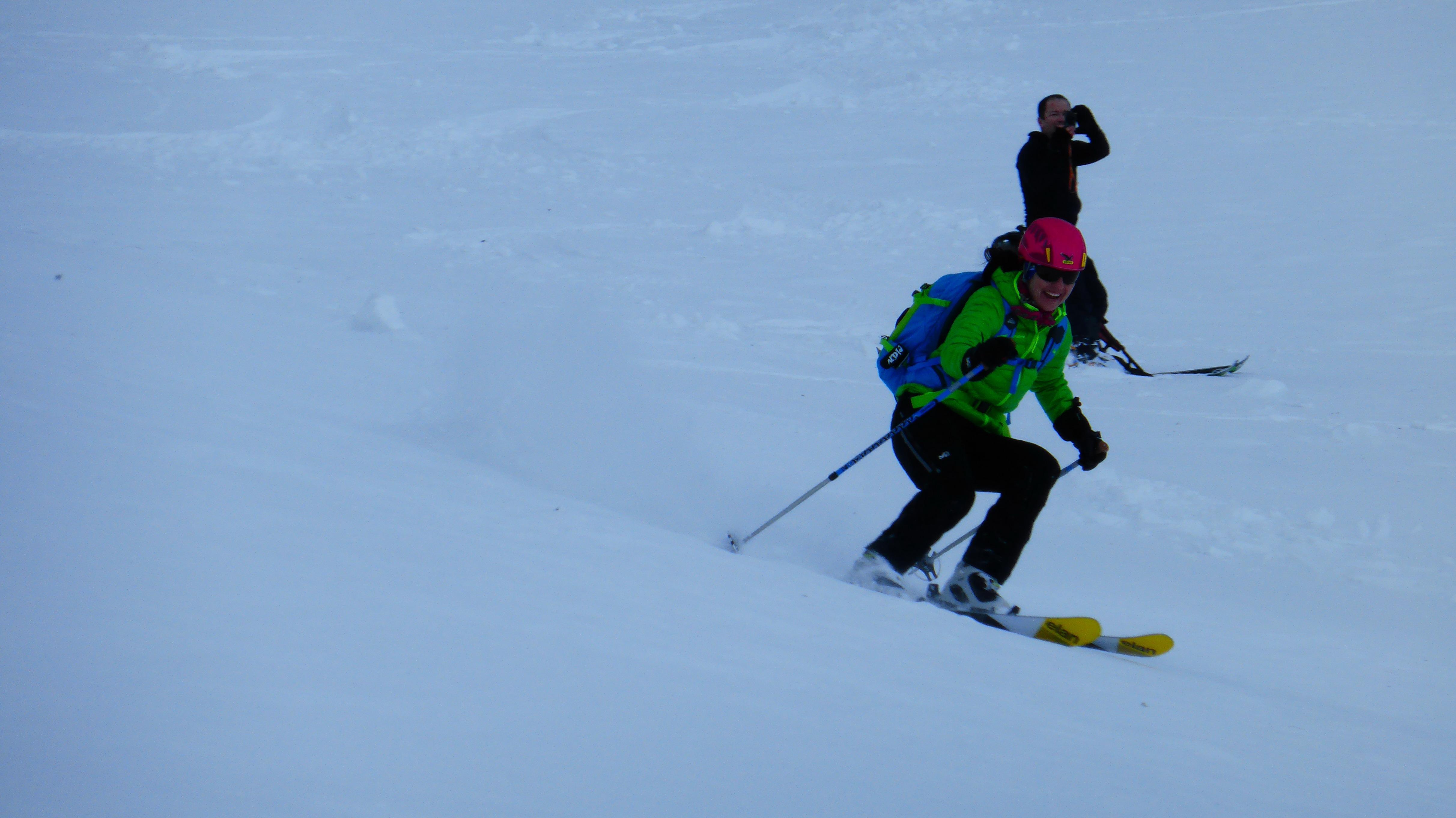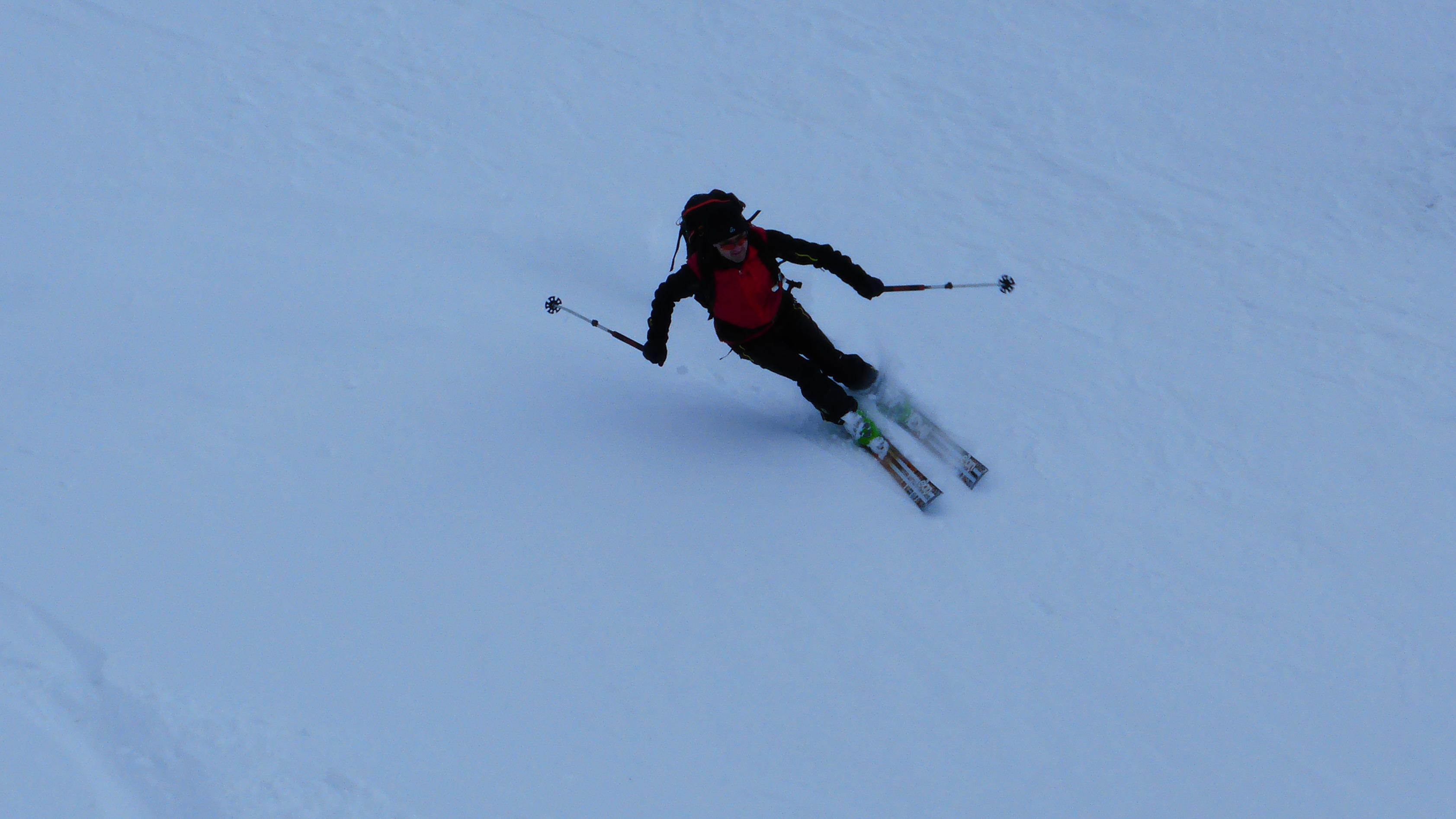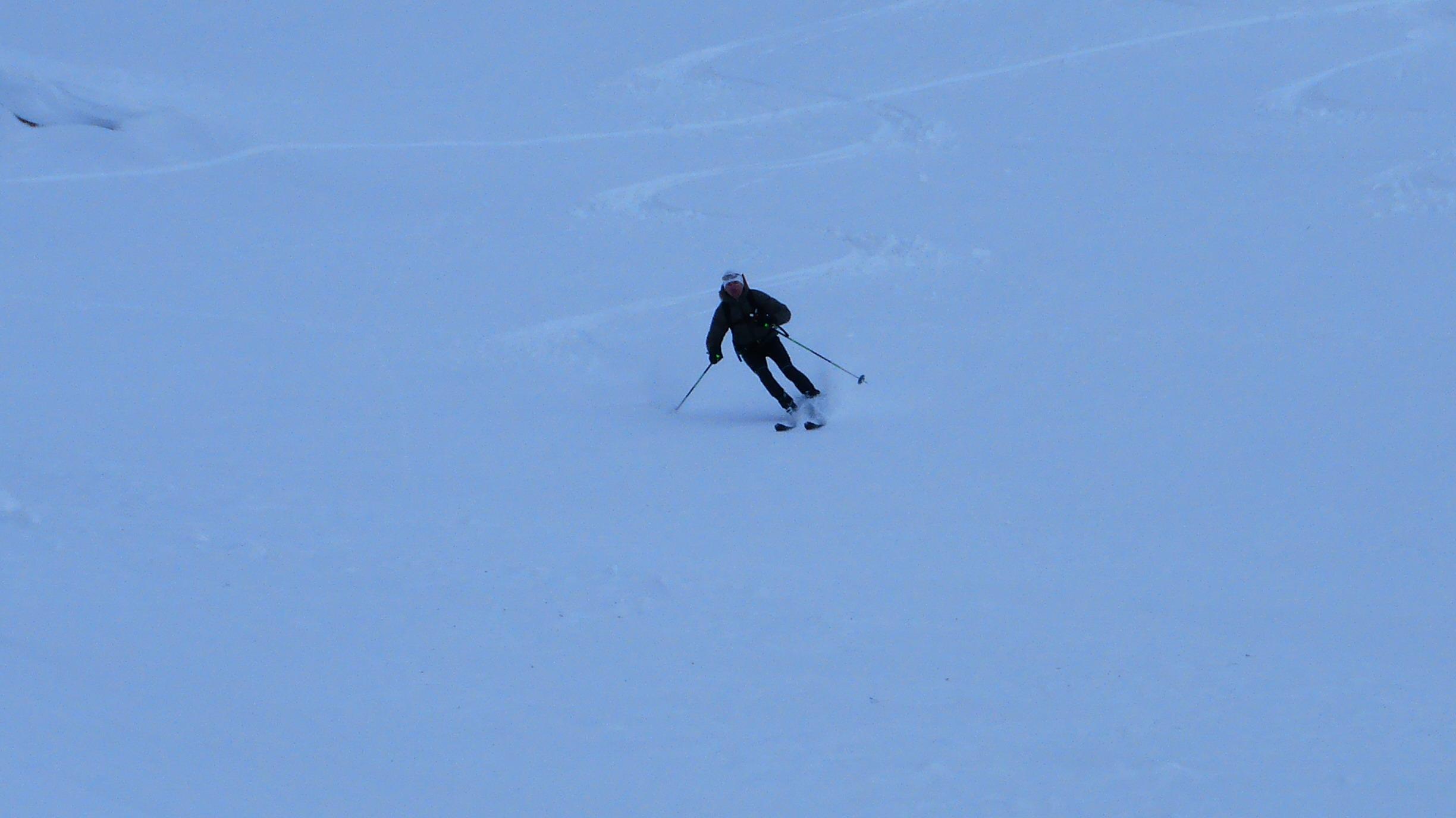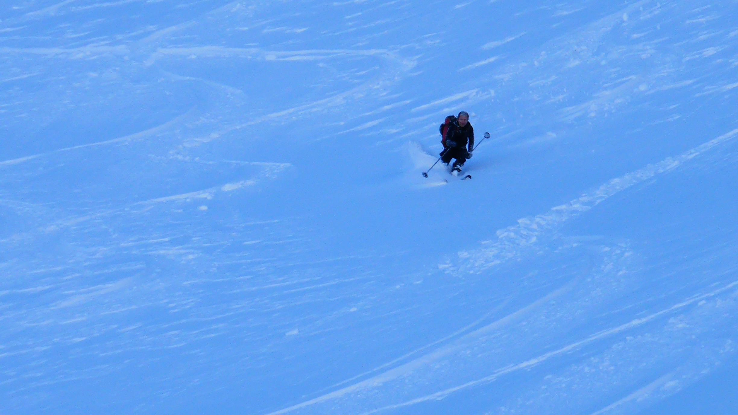 ...Schnee schattseitig noch pulvrig, sonnseitig bereits leicht firnig...am späteren Nachmittag dann teils schon etwas schneidig...