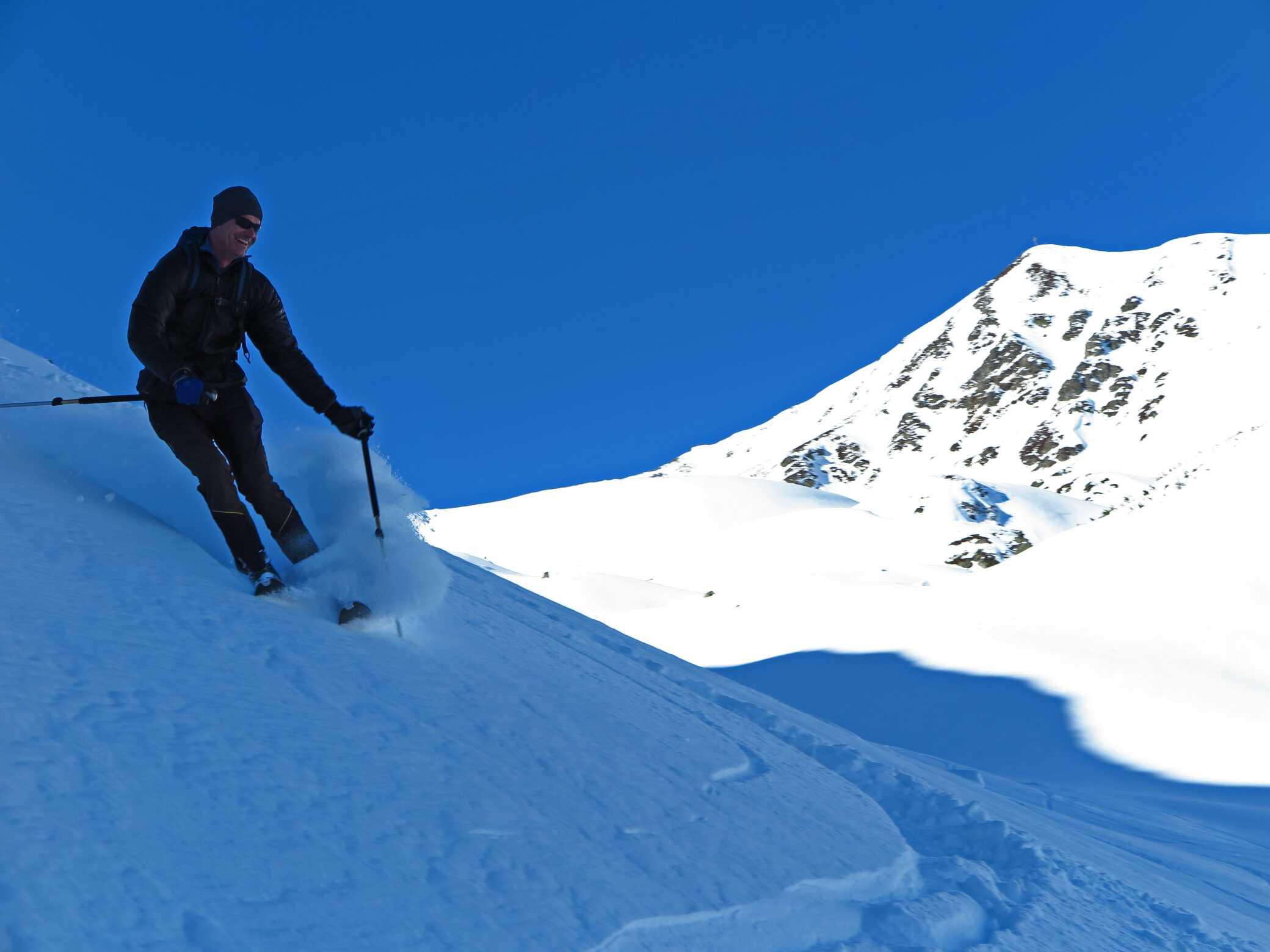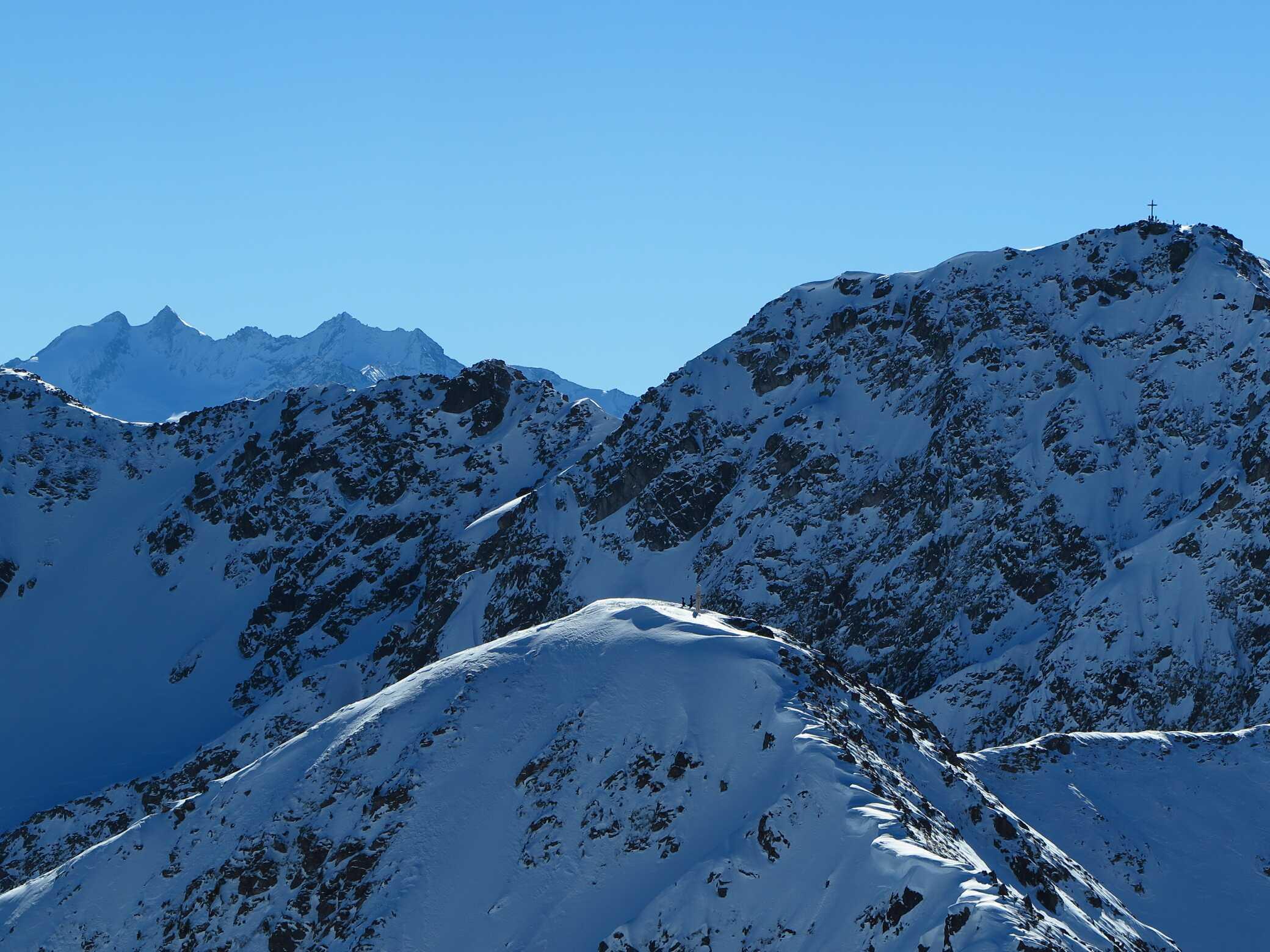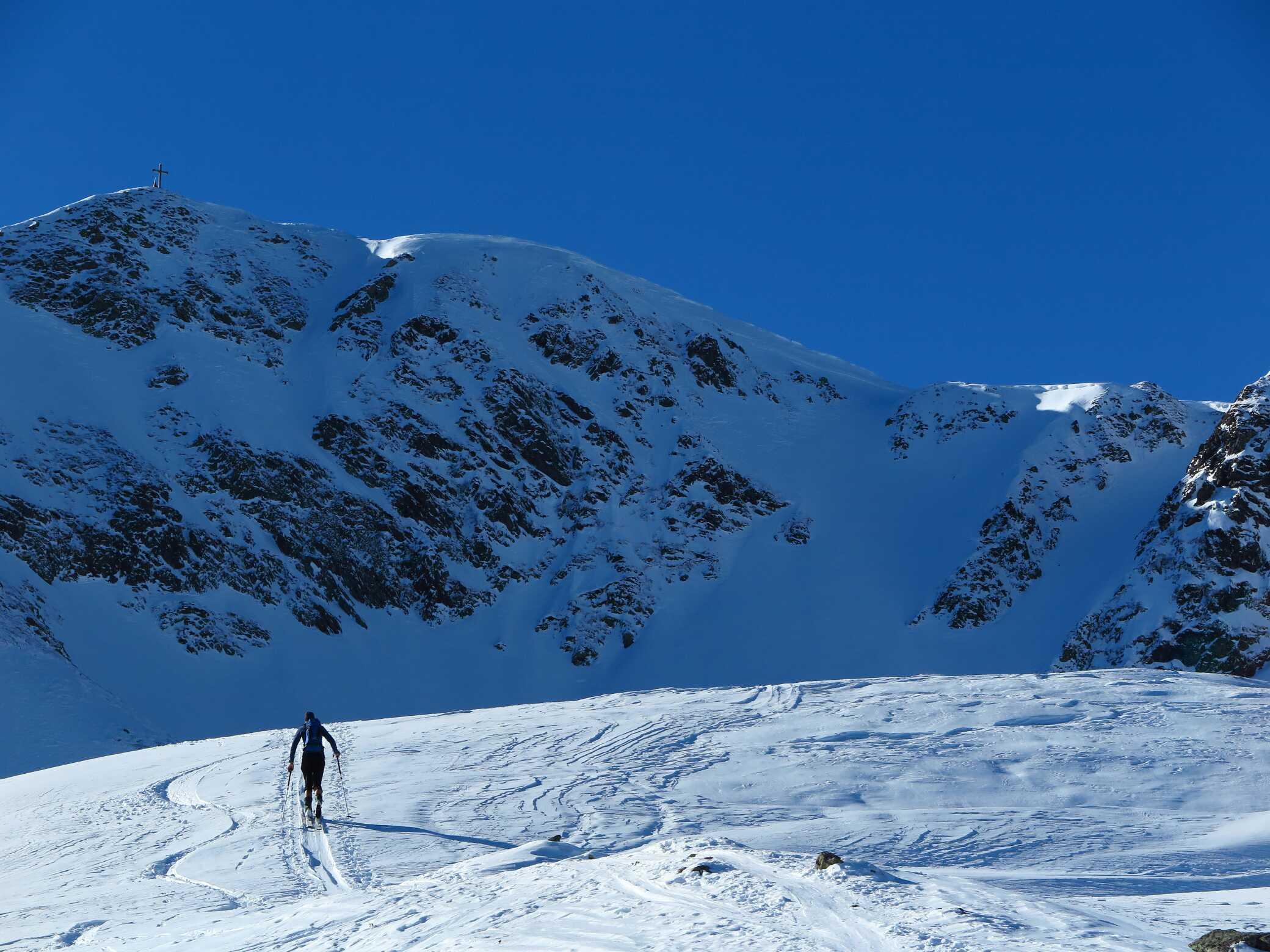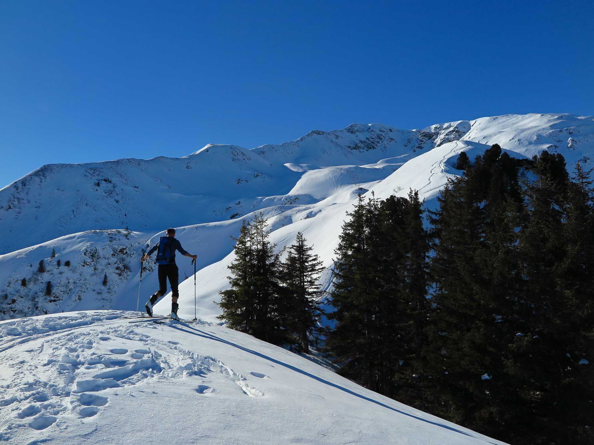 Schneelage: Am Morgen in besonnten Hängen noch ein Harschdeckel drauf, der im Tagesverlauf aufweichte. Auf der gesamten Tour genug Schnee und keine Bodenkontakte. Abfahrt über anfangs S-seitigen Gipfelhang im Firn und Pappschnee, in den schattigen Hängen der O-Abfahrt dann durchwegs guter Pulverschnee. Im Tal auf der LL-Loipe zurück zum PP.