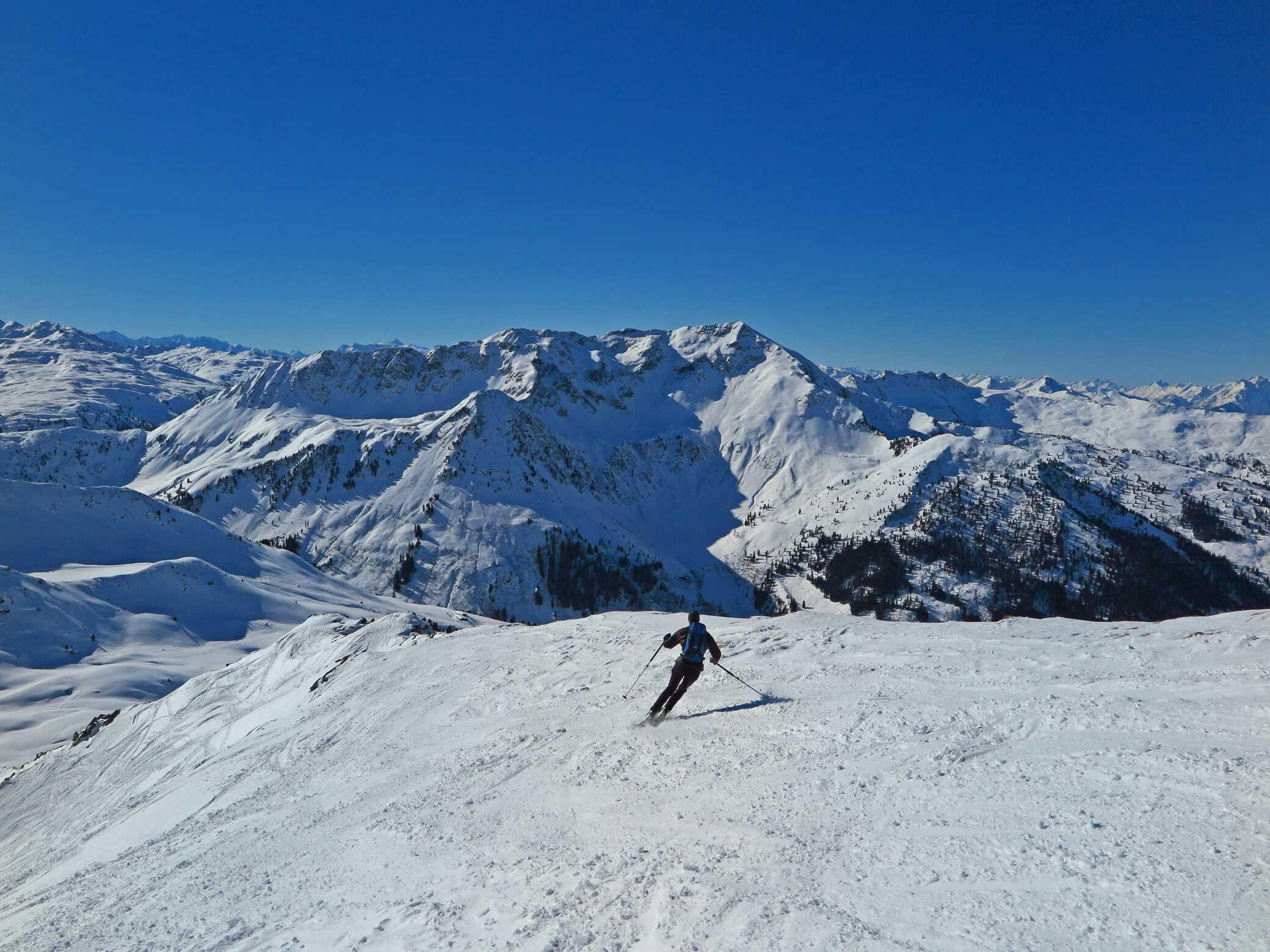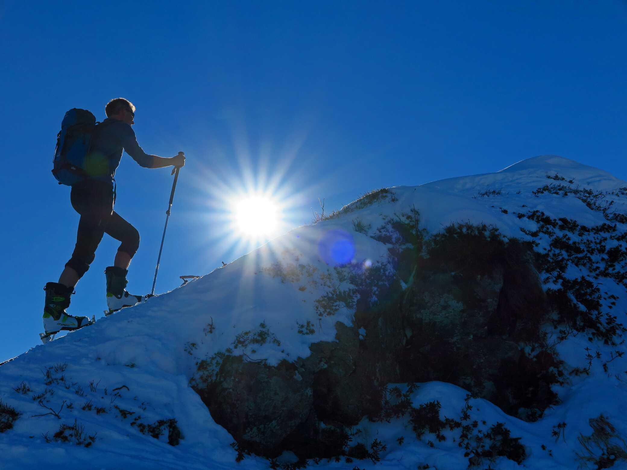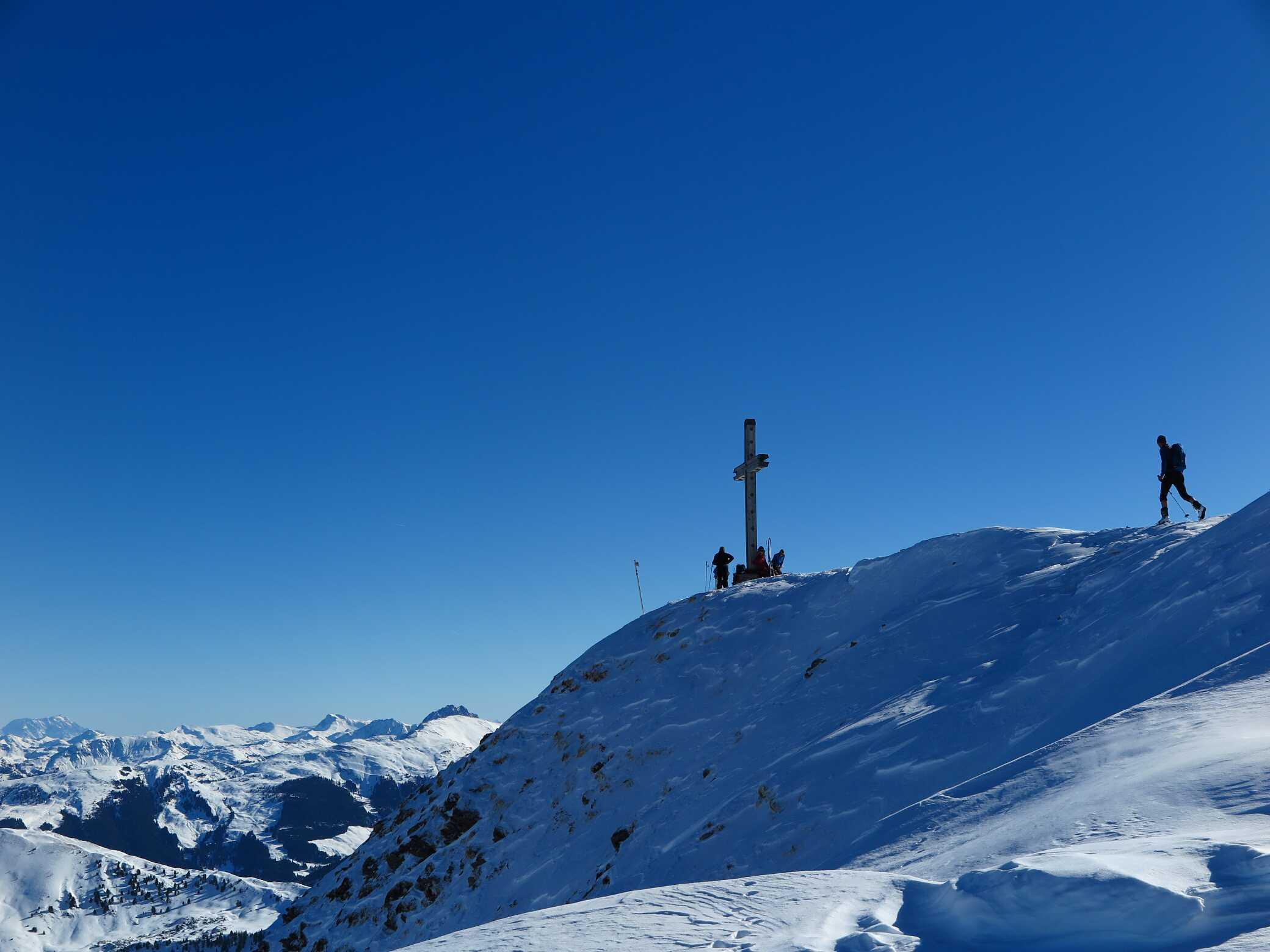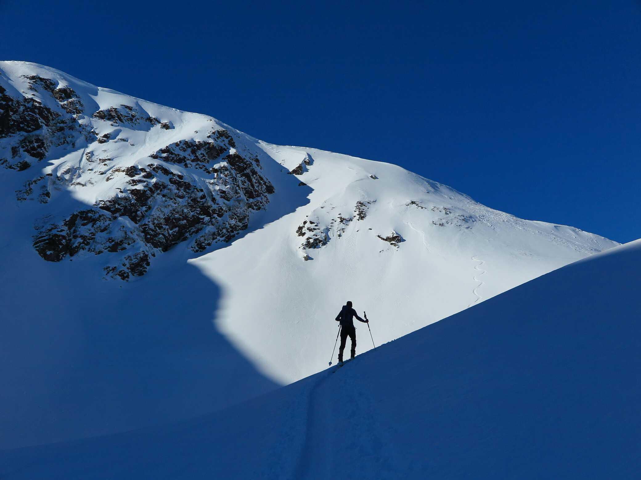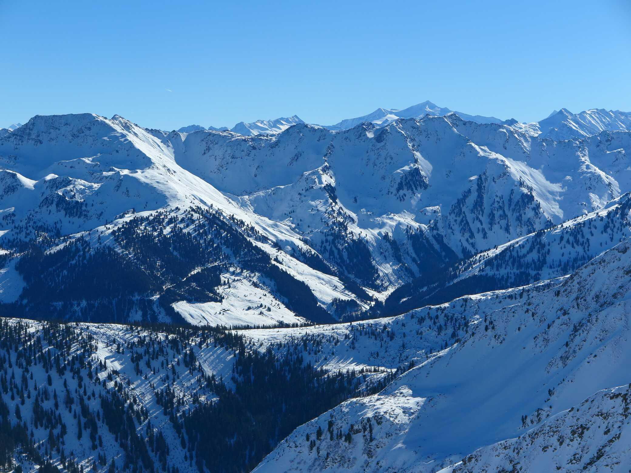 Schneelage: Am Morgen in besonnten Hängen noch ein Harschdeckel drauf, der im Tagesverlauf aufweichte. Auf der gesamten Tour genug Schnee und keine Bodenkontakte. Abfahrt über anfangs S-seitigen Gipfelhang im Firn und Pappschnee, in den schattigen Hängen der O-Abfahrt dann durchwegs guter Pulverschnee. Im Tal auf der LL-Loipe zurück zum PP.