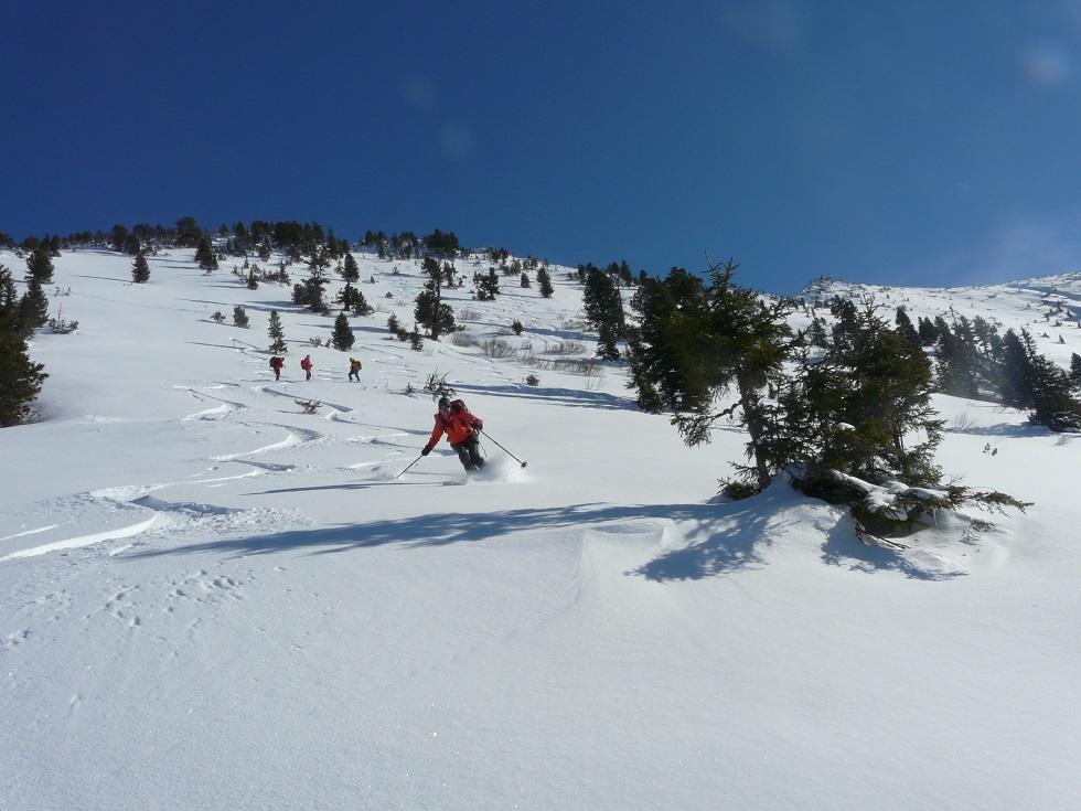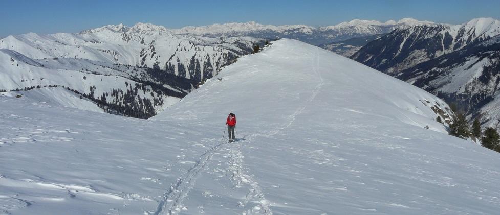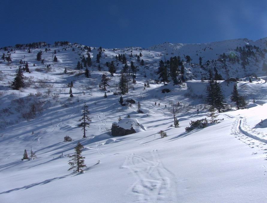 Derzeit ist die NW Abfahrt (wir sind zwischen Tanzbodenkogel und Ahornkogl eingefahren) trotz hier fehlender Bindung zum Untergrund gut machbar, nach den angekündigten Wind- und Neuschneebedingungen ist von dieser Abfahrt unbedingt abzuraten!