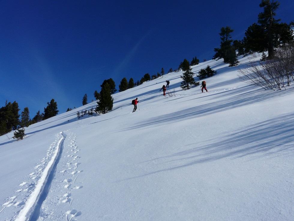 Ausgangspunkt Christerbauer in Donnersbachwald, im Tal -14°, anfangs kurze Forststraße, dann Hohlweg, nach Querung der Straße rauf ins Gelände der Ahornkoglalm und der Spur nach Richtung Unterer Tanzboden. Hier zweigen wir ab und spuren die mittelsteilen Hänge zum Kamm kurz vorm Ahornkogl. Über diesen zum Tanzbodenkogel.