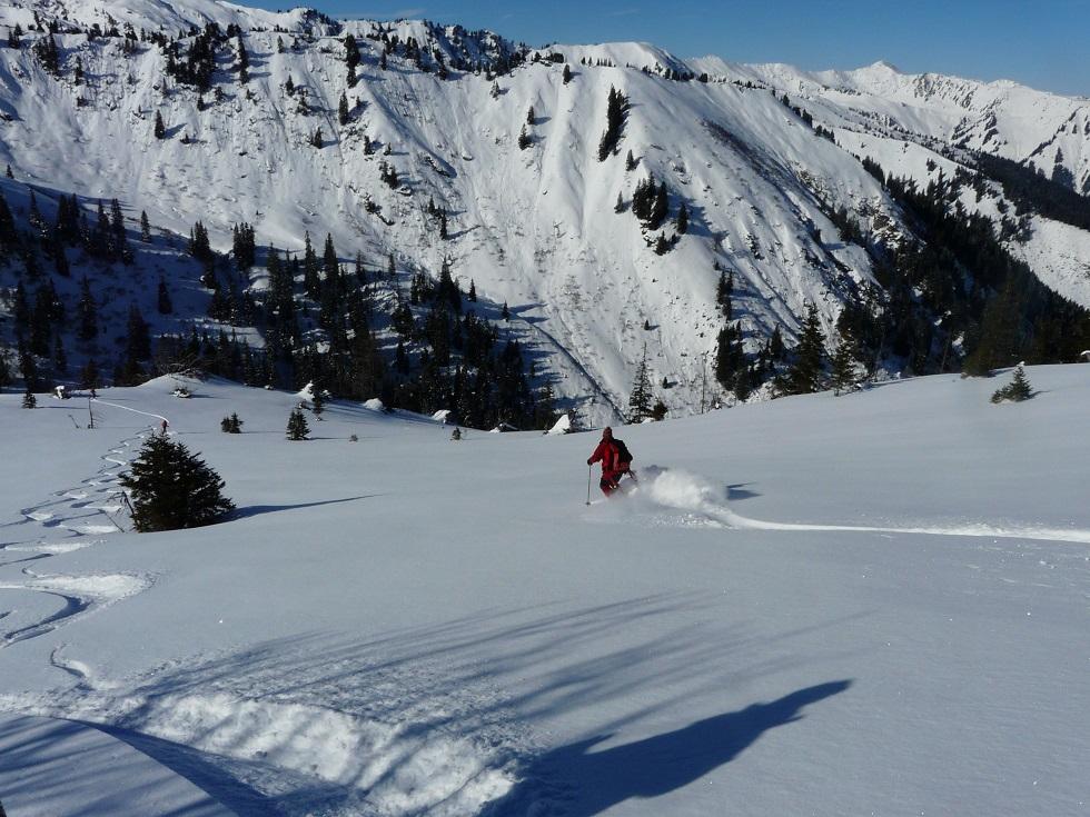 Bis auf das kurze windbearbeitete Kammstück vom Ahornkogl zum Tanzbodenkogel herrlicher lockerer Pulver, wir begegnen lediglich 2 Tourengehern, die vom Unteren Tanzboden kommen. In größerer Entfernung sind Tourengeher auf der Wolfnalmspitze und bei einer Variante am Finsterkarspitz zu beobachten.