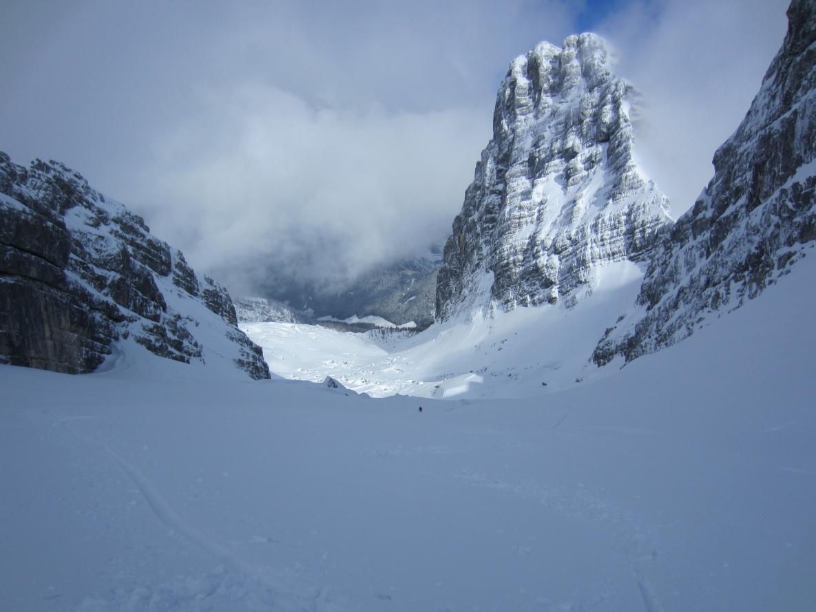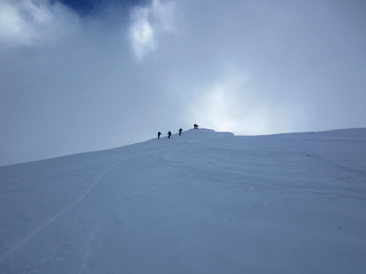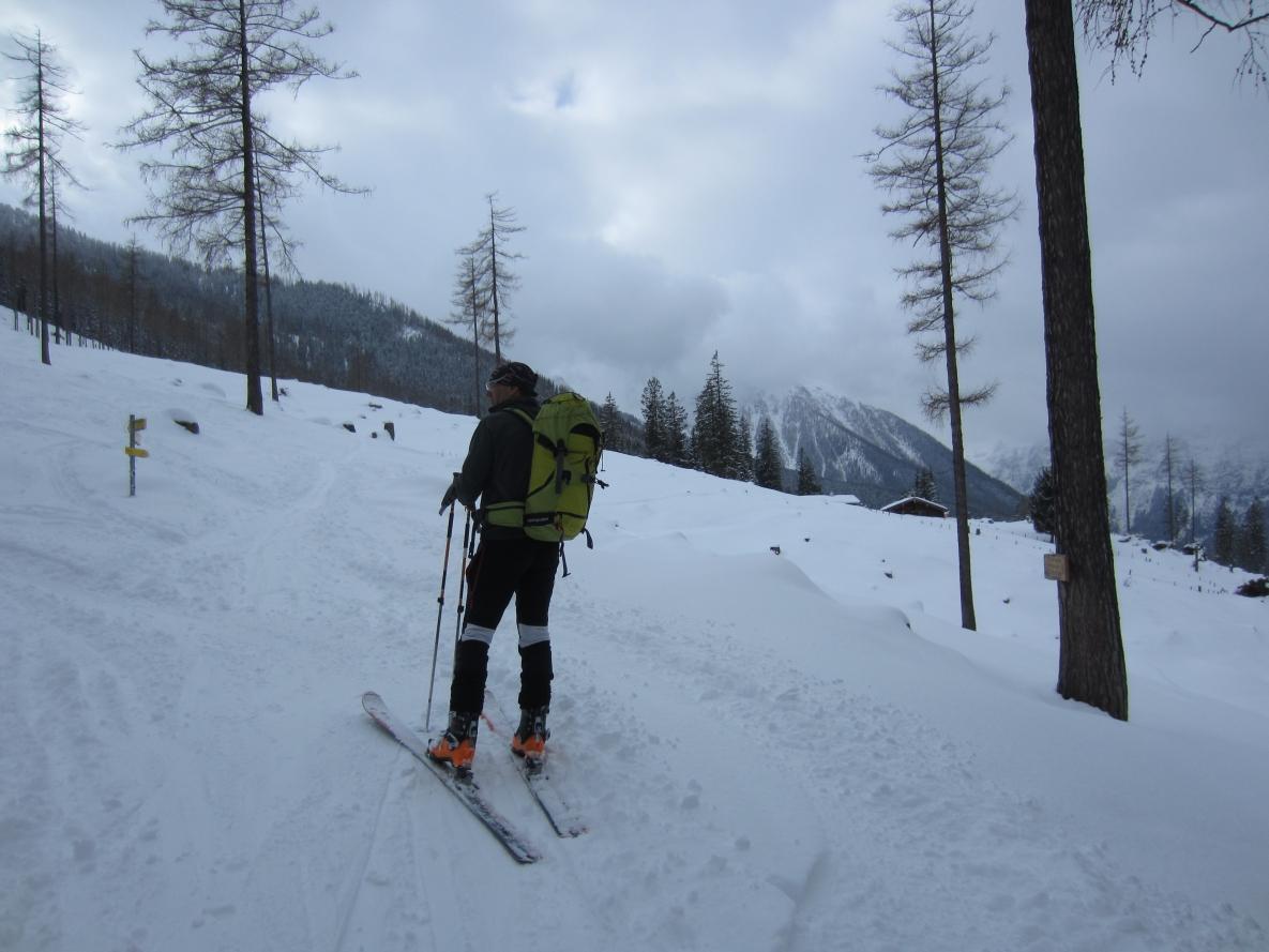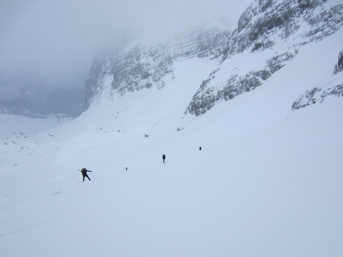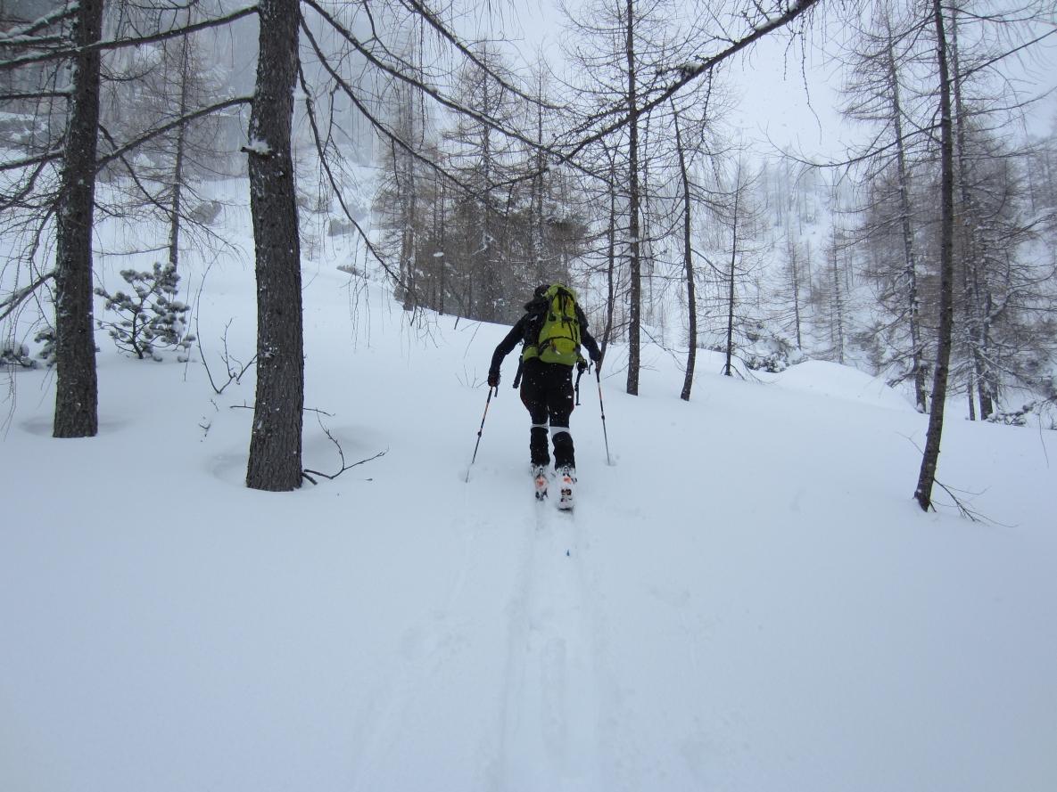Von Hammerstiel bei anfangs wenig Neuschnee auf der Forststrasse bis zur "Benzinkurve". Bald mussten wir selber spuren und die Neuschneehöhe wuchs sprunghaft an. Bis zur Baugrenze komplett ohne Windeinfluss, aber dann im Kar doch der Nordwind sichtbar.