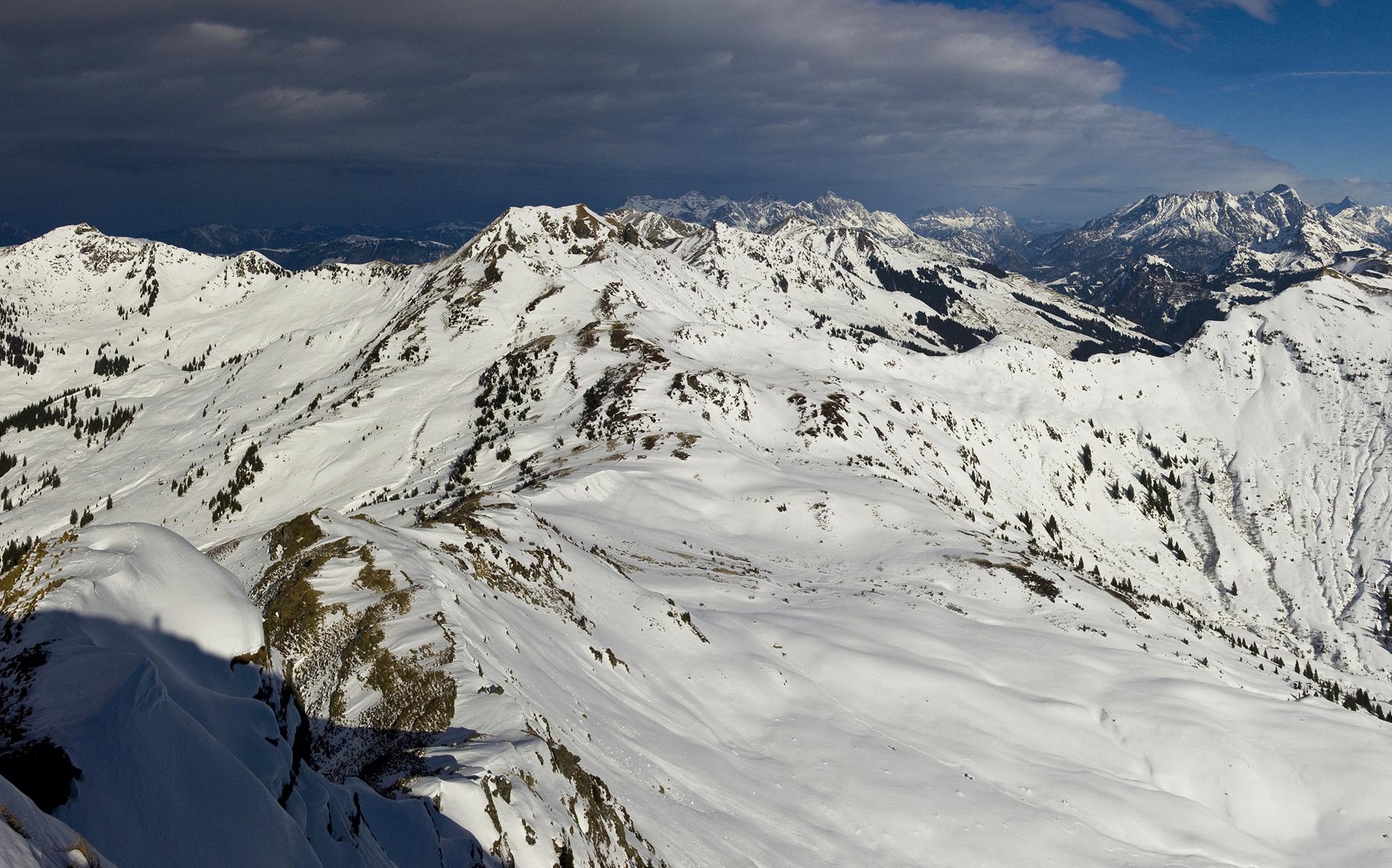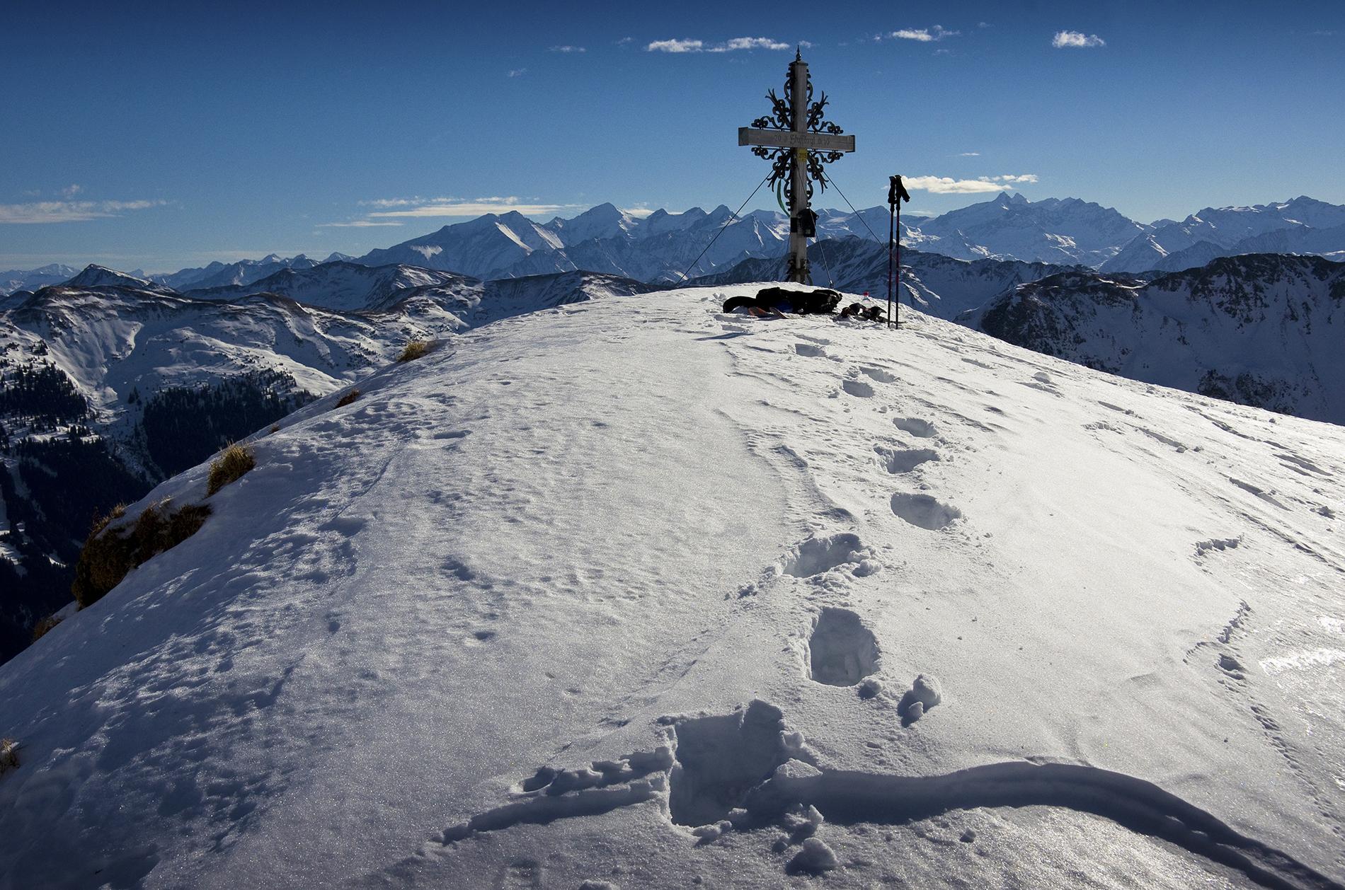 - von Südosten aus dem Henlabgraben. Der Schnee war schon morgens angewärmt und feucht, es war wärmer als gestern, die vom Wetterbericht angesagte Abkühlung ist ausgeblieben. Im Glemmtal sind die Südostseiten gefährlich eingeweht, die Nordseiten blankgeblasen. Eine um 35° steile Mulde, die voller Triebschnee war, konnte ich auf abgewehtem Rücken umgehen, auch einen besonnten Steilhang musste ich mit etwas Trickserei und Abschnallen der Ski vermeiden. Sonst wäre ich wohl umgekehrt und übers Henlabjoch auf die Sonnspitze gegangen. Auch der Saalkogel wurde heute begangen. Aus dem Auracher Graben kamen zwei Tourengeher zum Staffkogel-Gipfel, die über Schneemangel auf der Nordseite klagten.