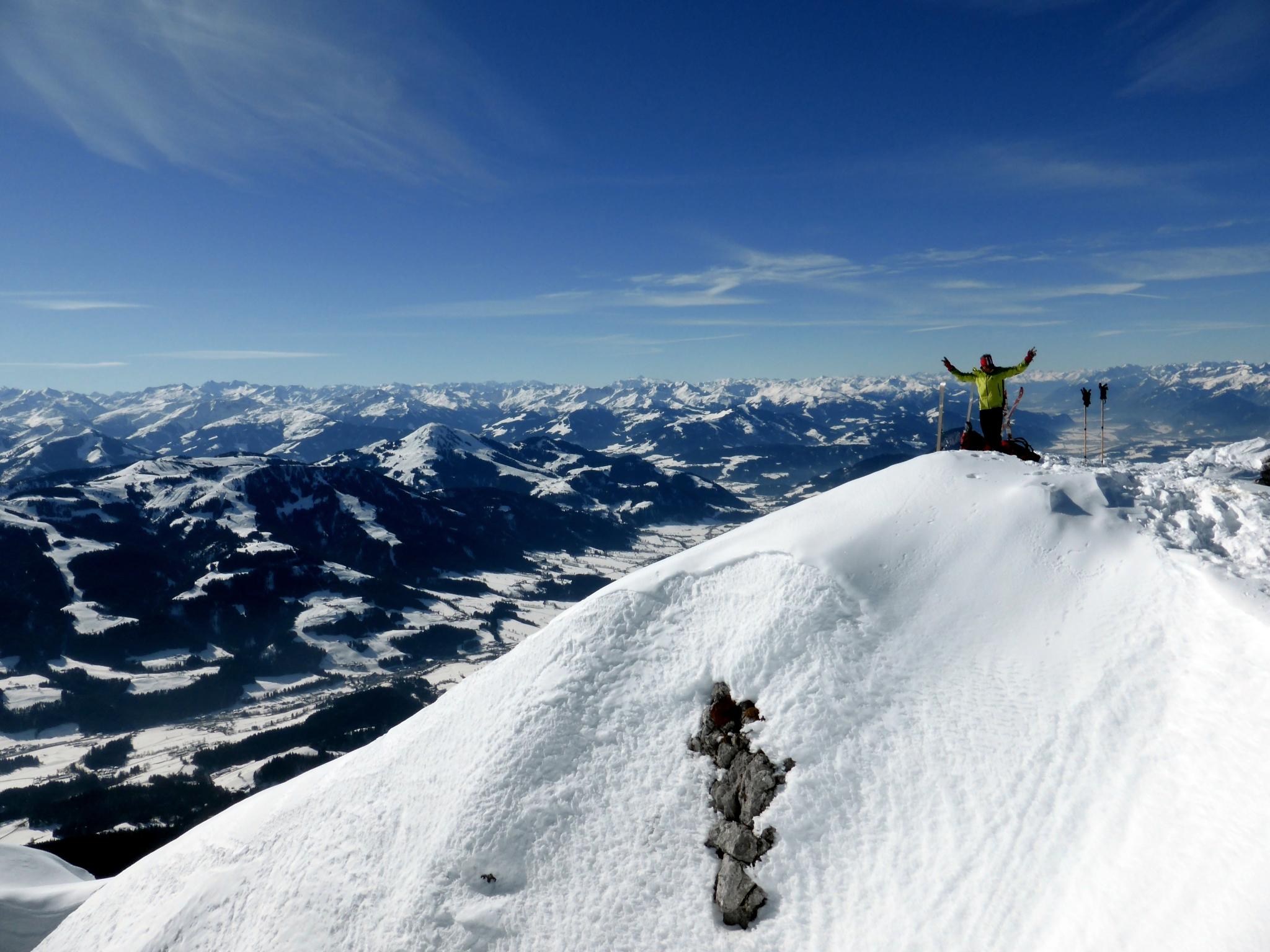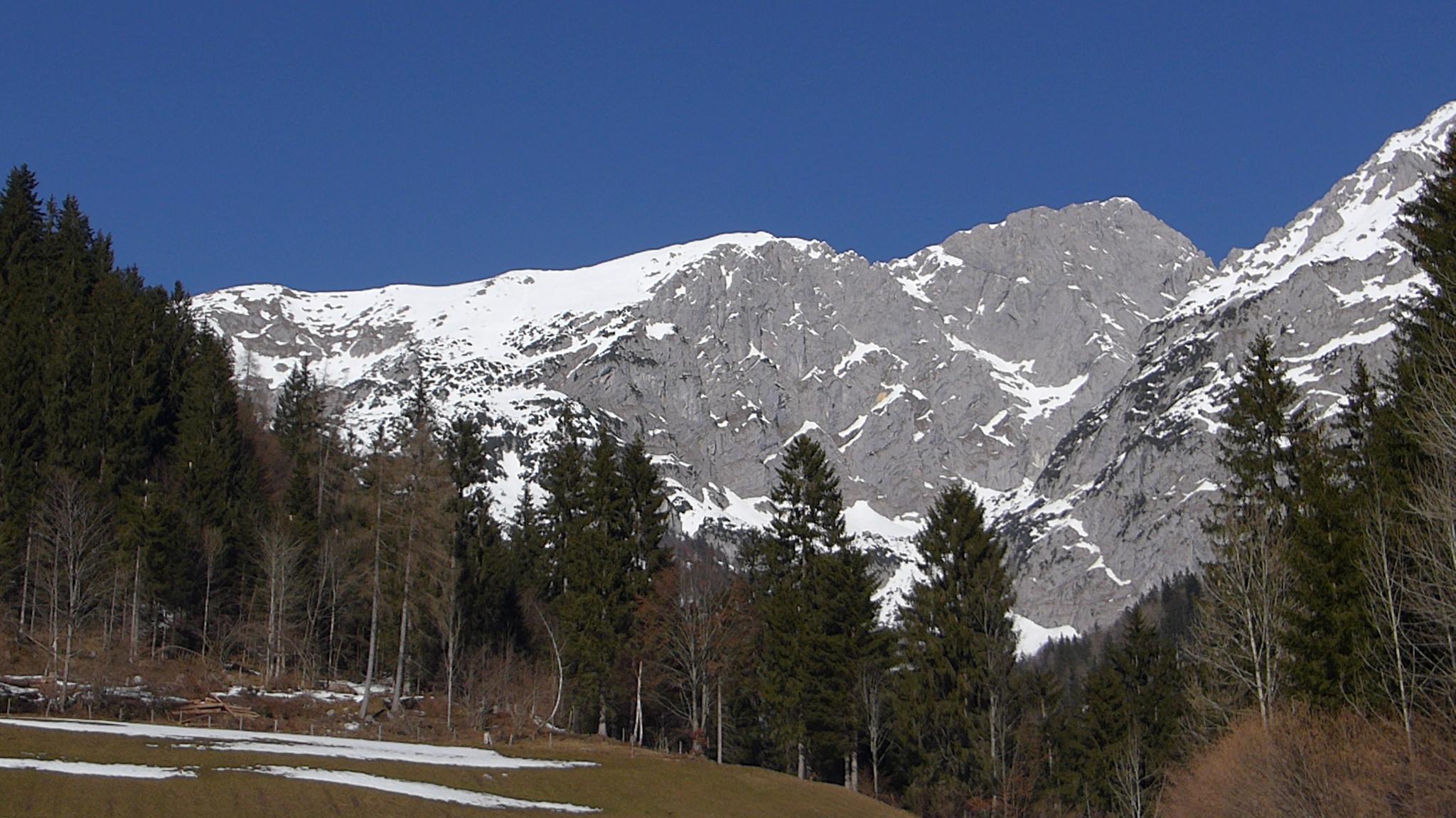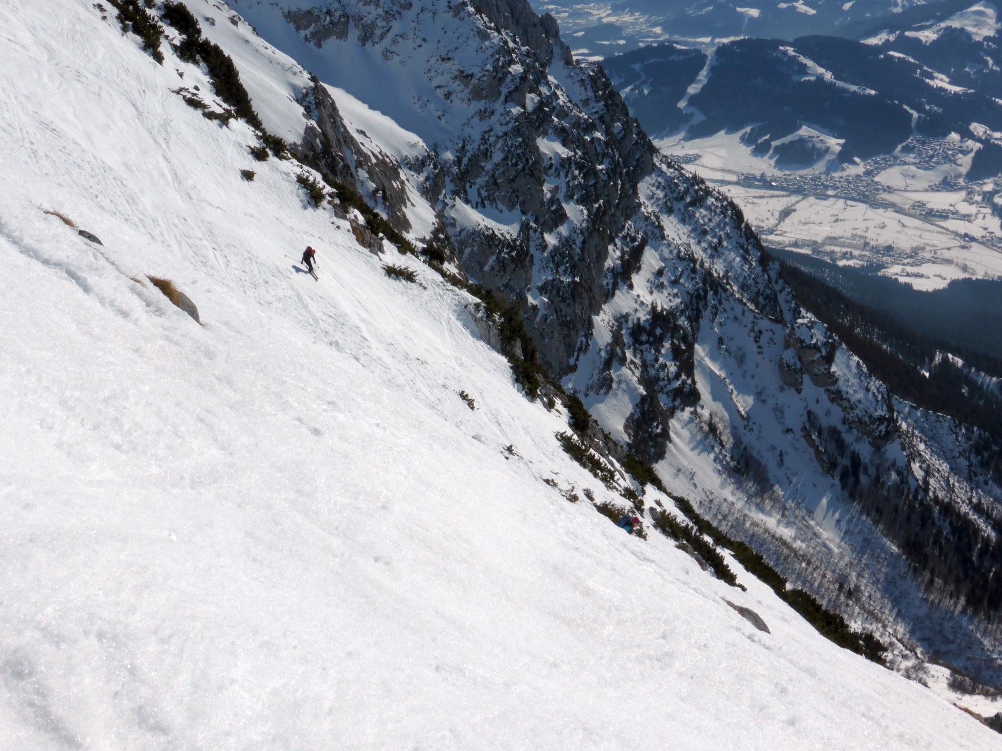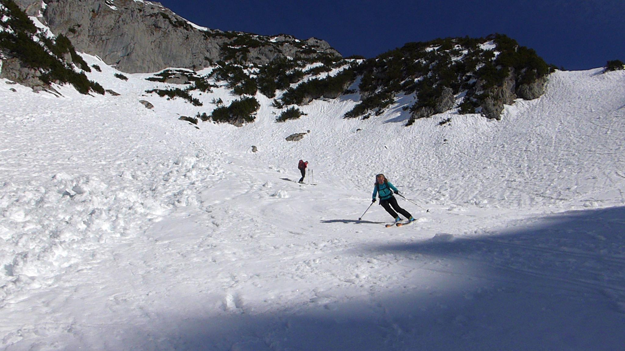 Allgemeine Verhältnisse, Schnee: Aufstieg zum Wiesberg noch sehr hart, sicherheitshalber mit Steigeisen. Abfahrt gegen 12.00 Uhr, ideal aufgefirnt, im teils schattigen Sonnensteinkar immer noch pickelhart. Weiter unten guter Firn. Insgesamt wenig Schnee, aber ausreichend. Zwischen Kaiseralm und Wegscheid Niederalm sind bereits einige Meter aper, der Fahrweg zum Parkplatz wird ebenfalls bald an mehreren Stellen unterbrochen sein.