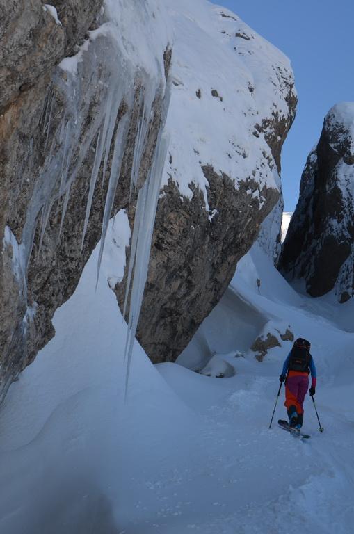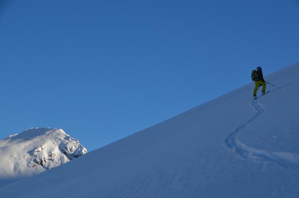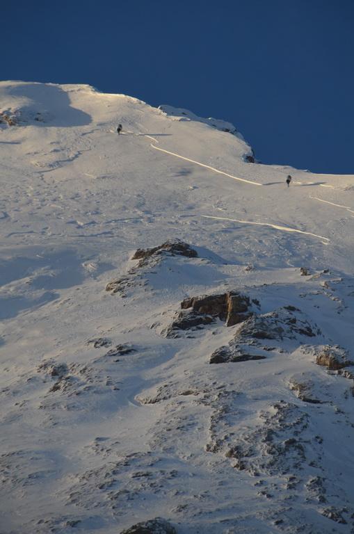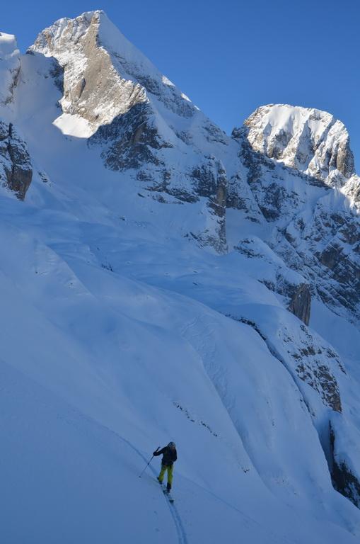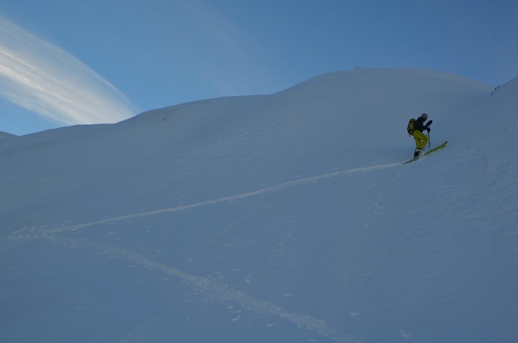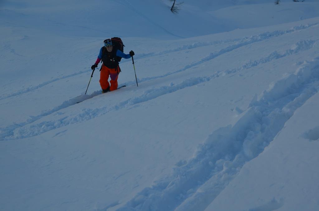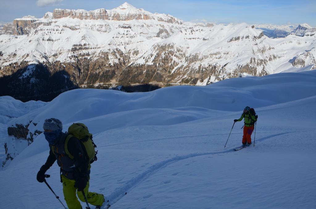 Die Suche nach dem heuer sehr dünn gesäten weißen Gold hat uns dieses Mal auf die Marmolada geführt, wo wir dann auch fündig geworden sind. Vom Auto weg wirklich perfekte Bedingungen auch abseits der Piste. Nachdem wir allerdings bereits bei der Anfahrt und auch später etwas weiter oben am Berg in ähnlicher Exposition alte Lawinen gesehen haben, bzw. In kurzen Steilaufschwüngen eine Gleitschicht gut erkennbar war haben wir unser Tourenziel dann noch geändert. Auf ca. 2700m haben wir auf die Aufstiegsspur der Punta Penia gequert und sind dann auf diesen zwar nicht unbedingt viel flacheren aber doch viel begangenen wirklich schönen Gipfel aufgestiegen.