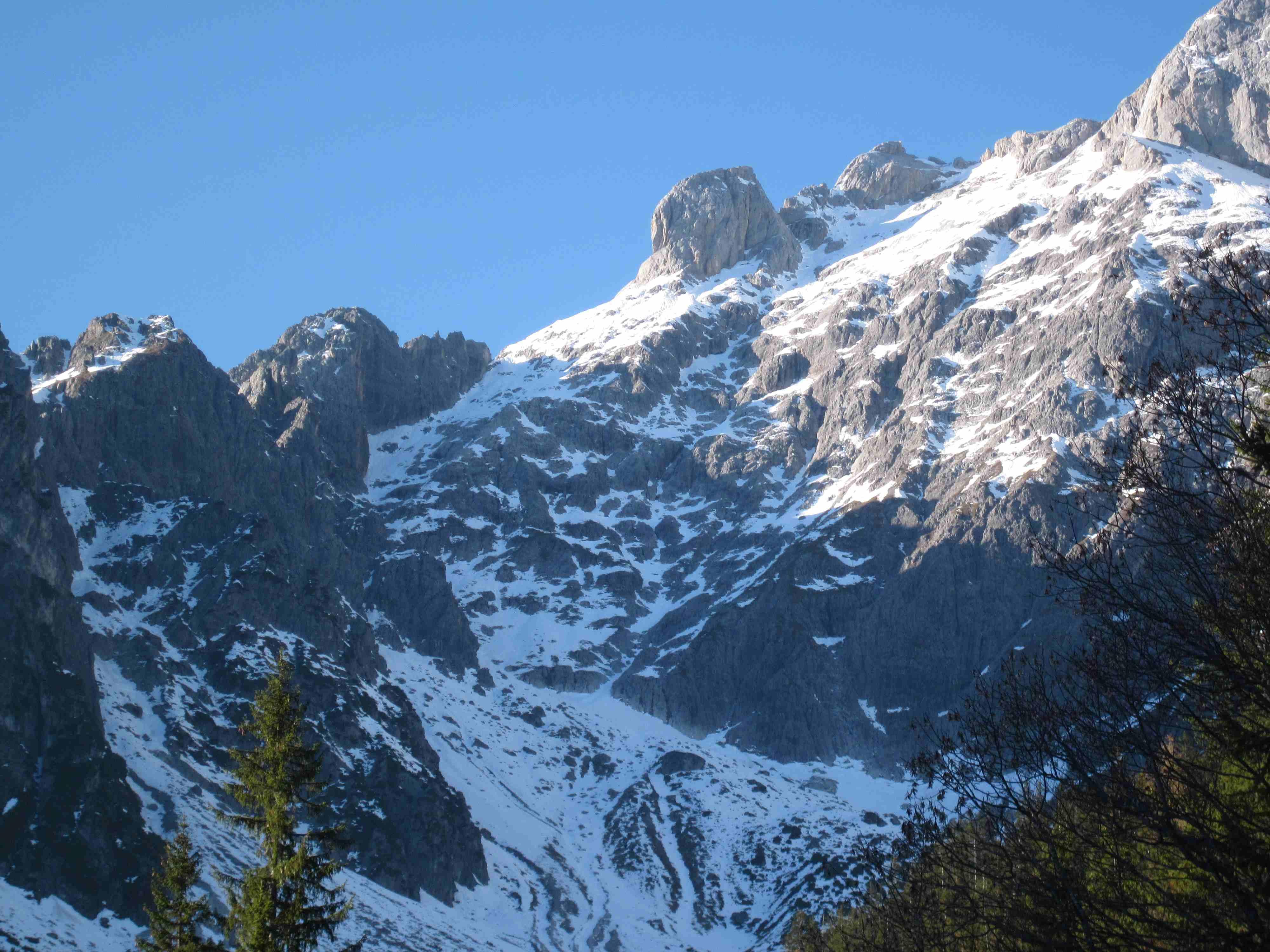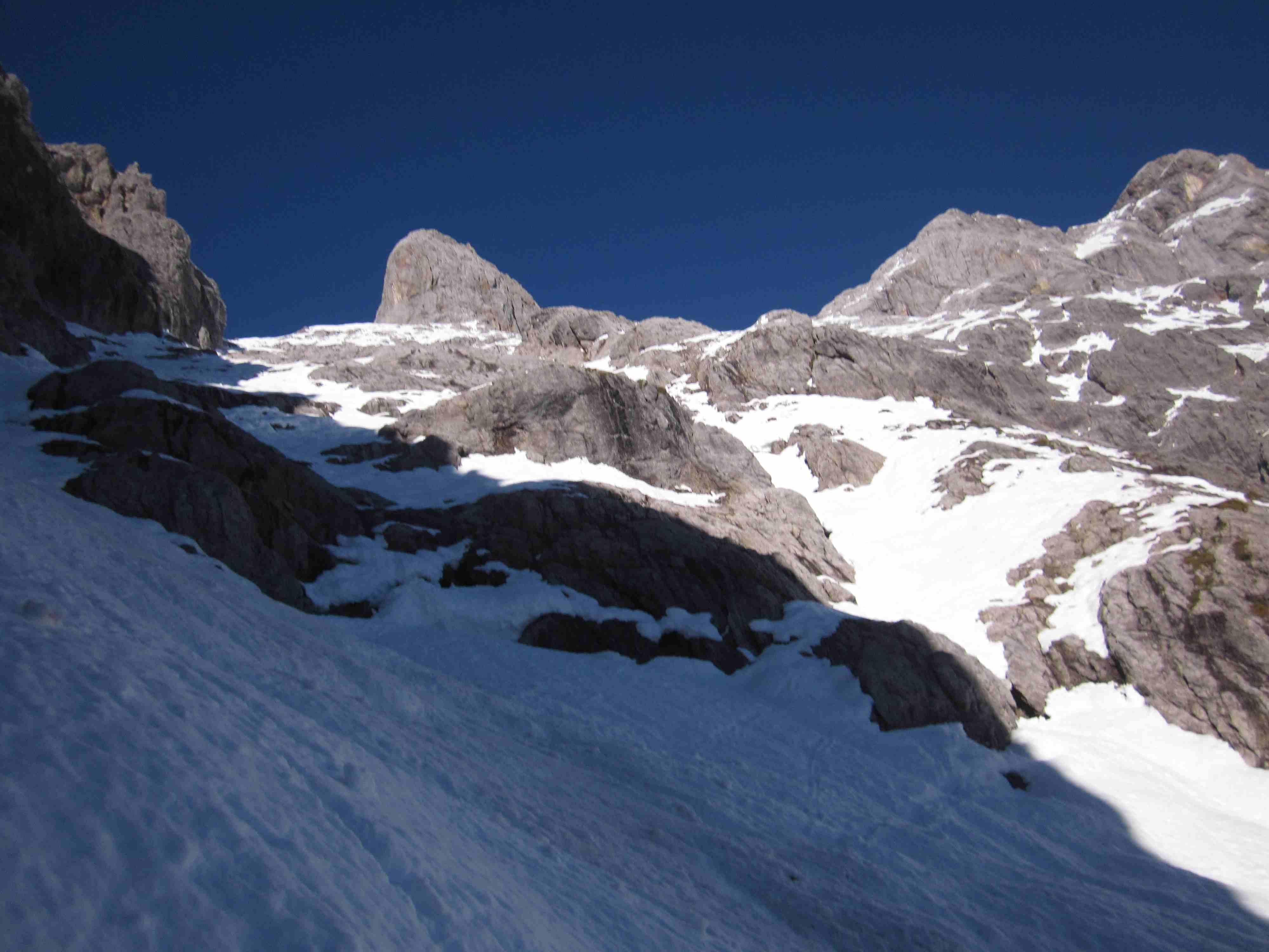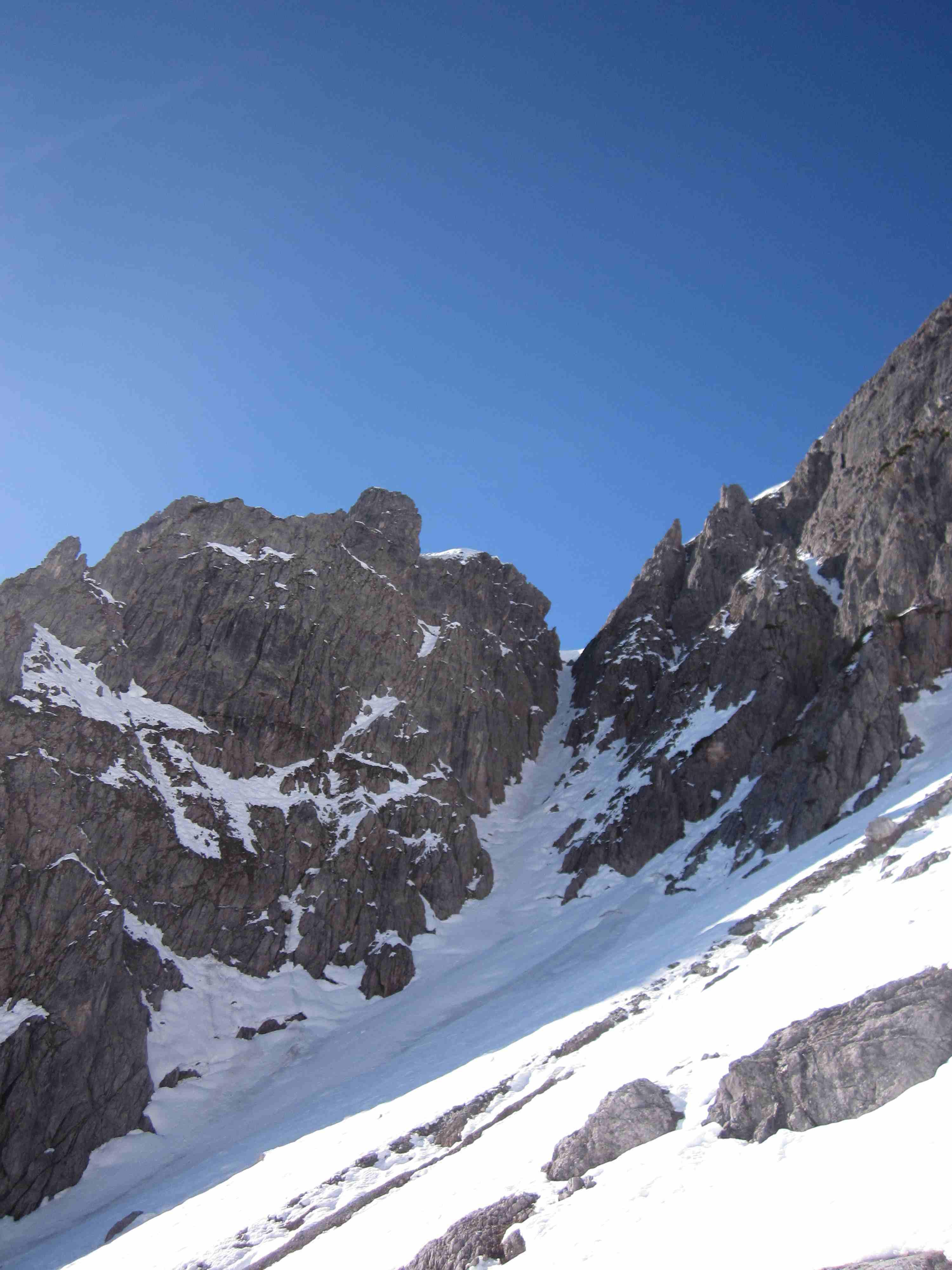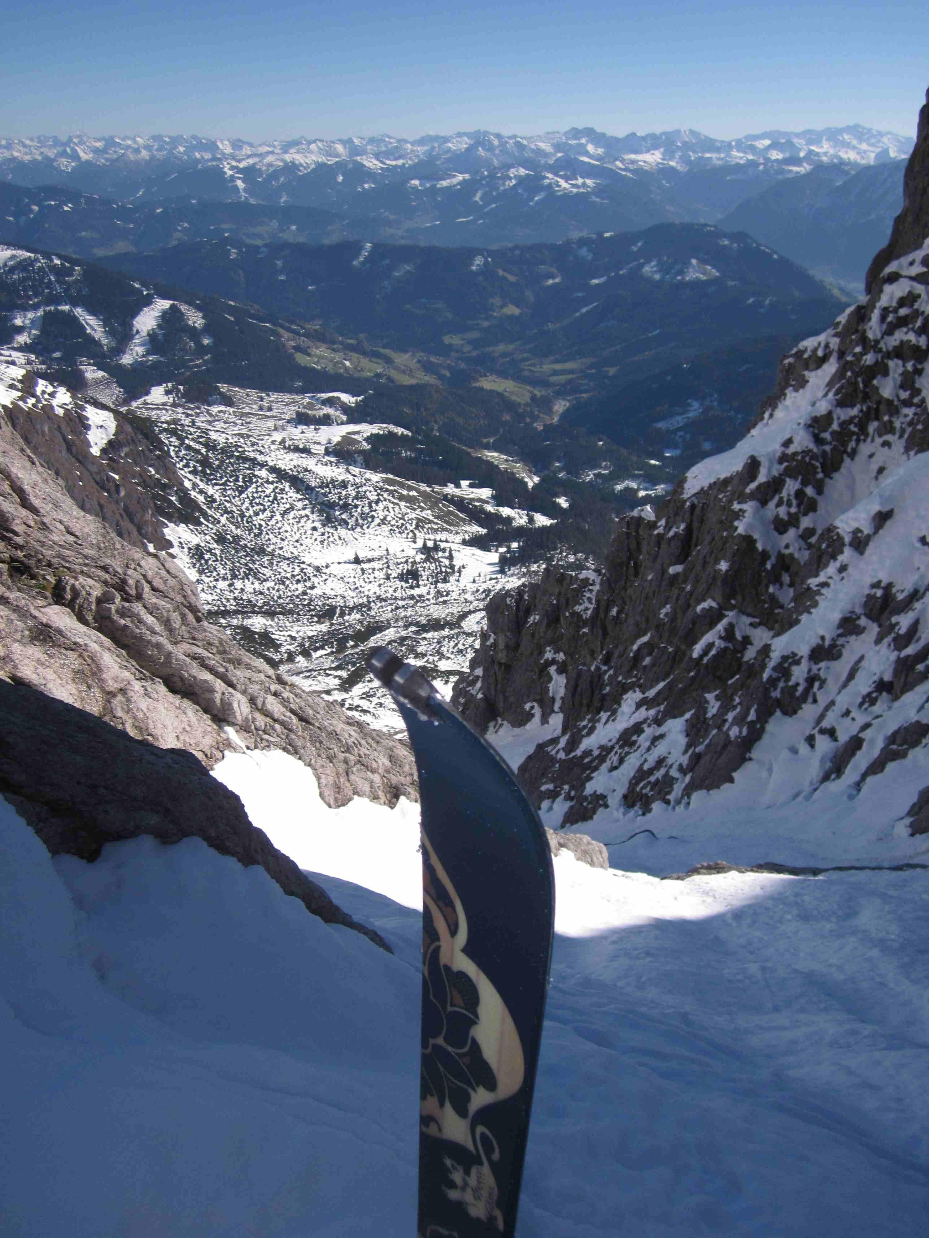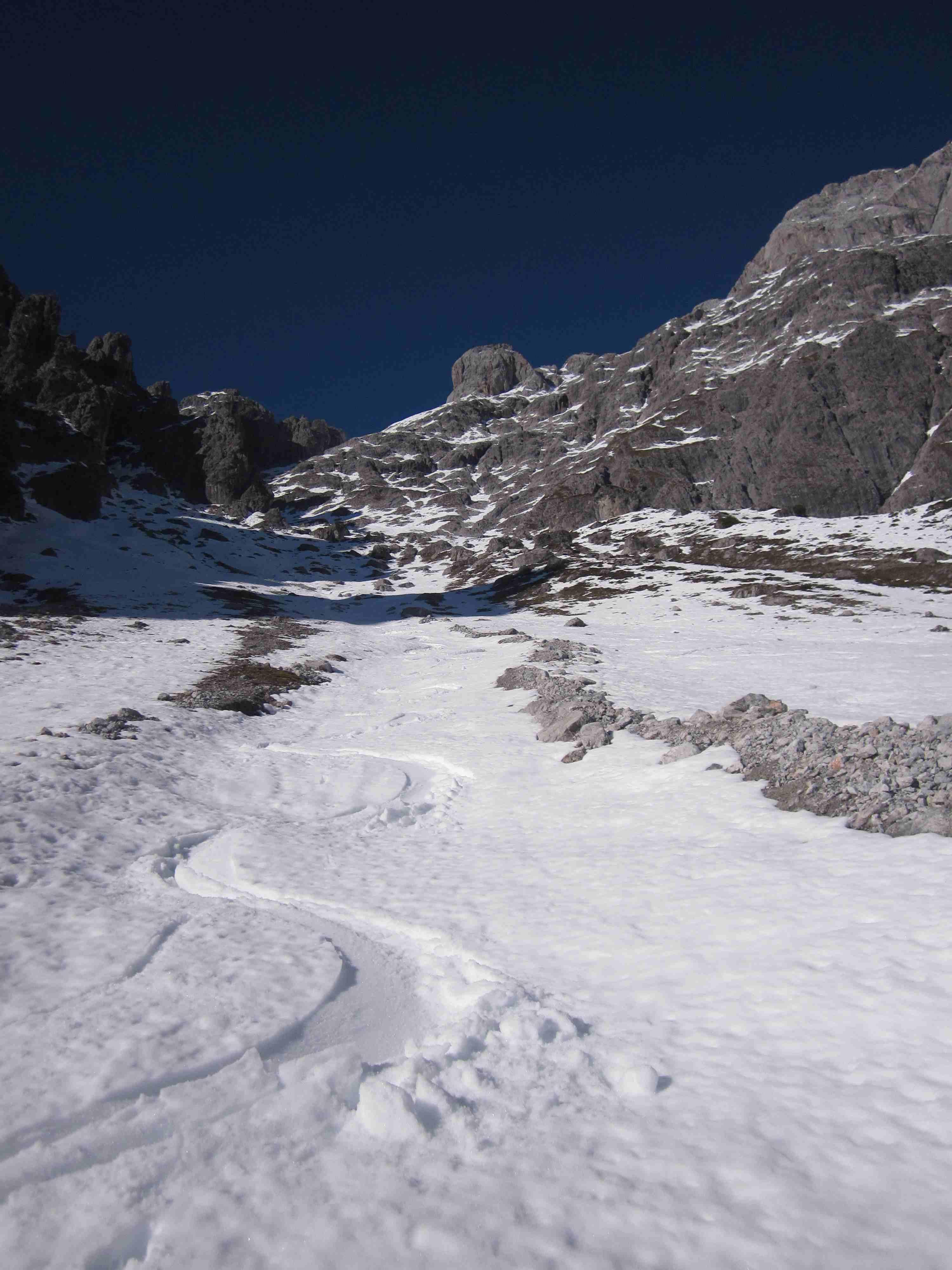 Kurz vor dem Ausstieg war für mich Schluß. Sehr weiche Schneedecke auf steilen Platten, bei denen ich mir nicht sicher war, ob die ned doch ins Rutschen kommen könnte. Mein Vorgänger (vermutlich vr einigen Tagen) hatte wohl noch deutlich mehr Schnee. Seine Spur führte gestern über zwischenzeitlich freigelegte Felsen.