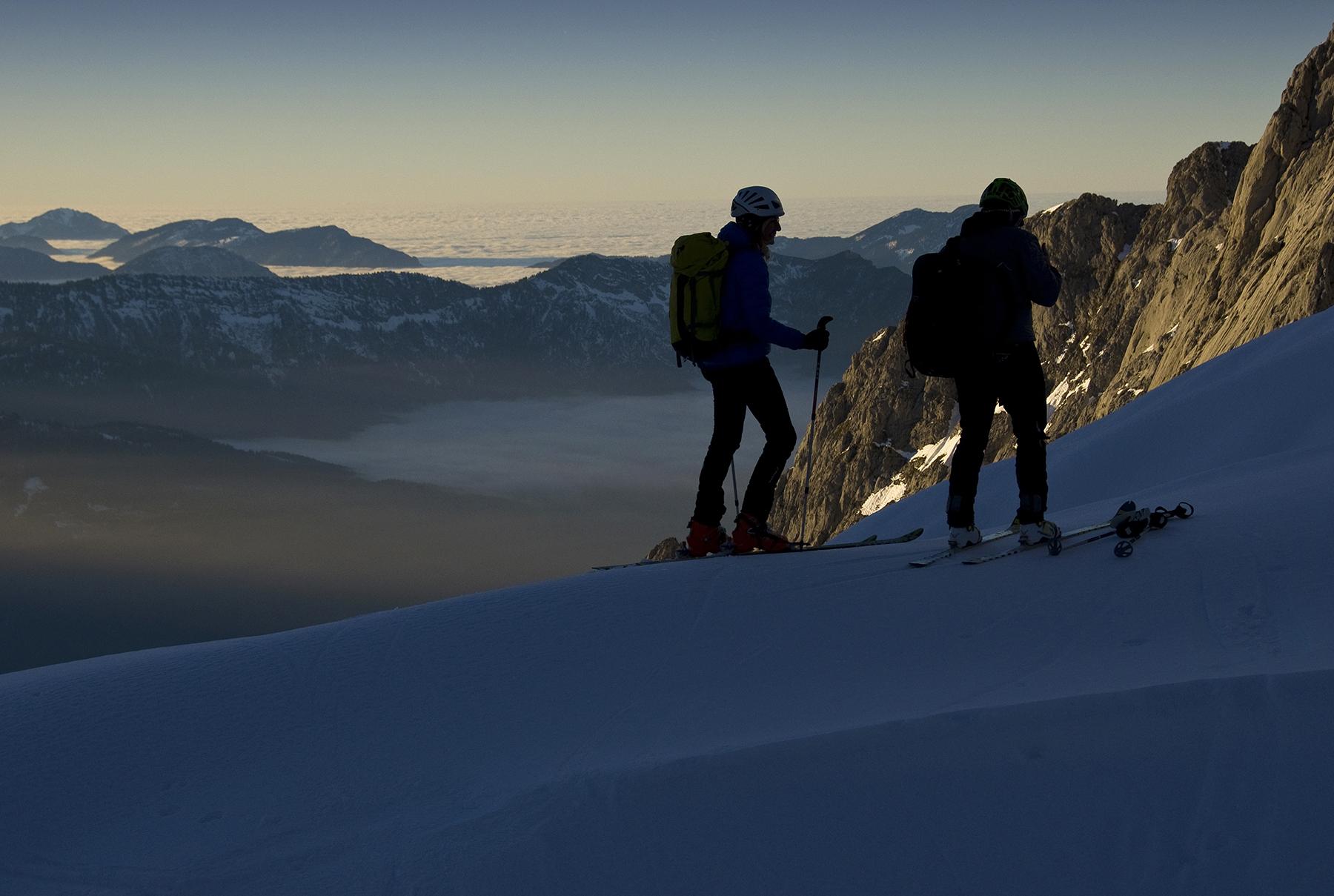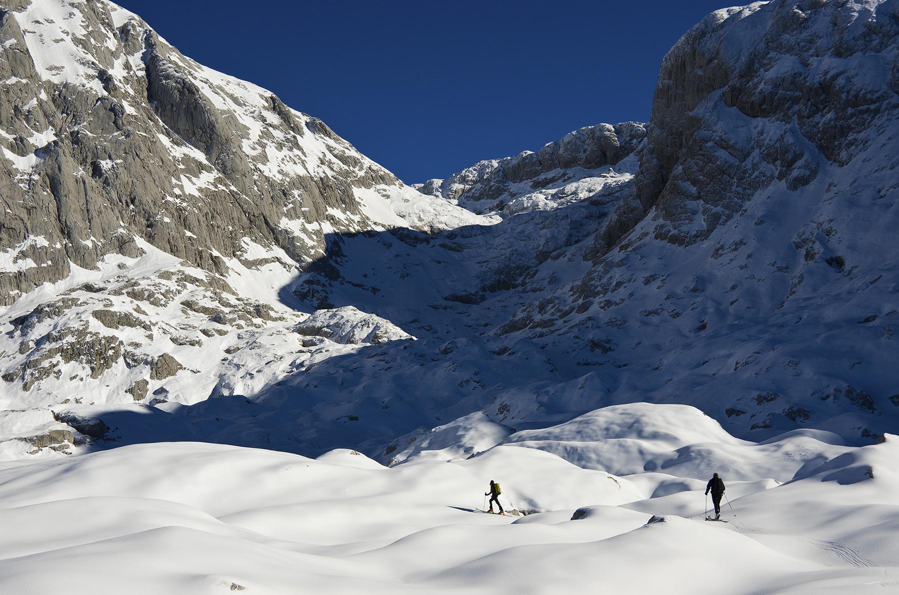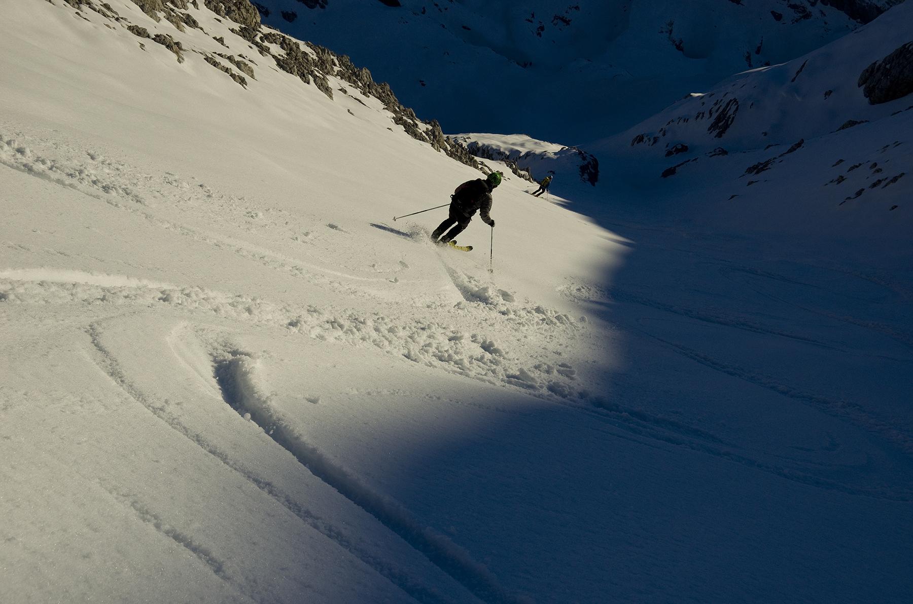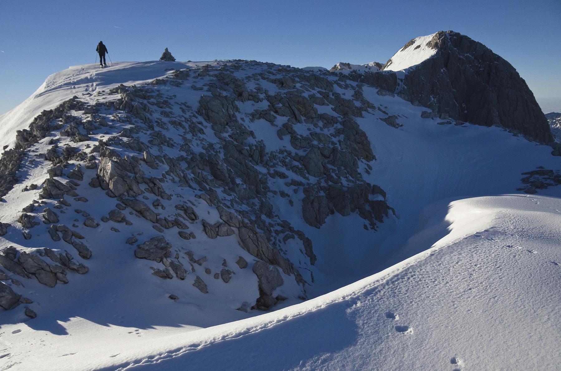 Lawinengefährlich wars wirklich nicht, alles ist hart gefroren, und nur der Gipfelaufbau firnt auf. Die Umgäng liegen fast den ganzen Tag im Schatten.