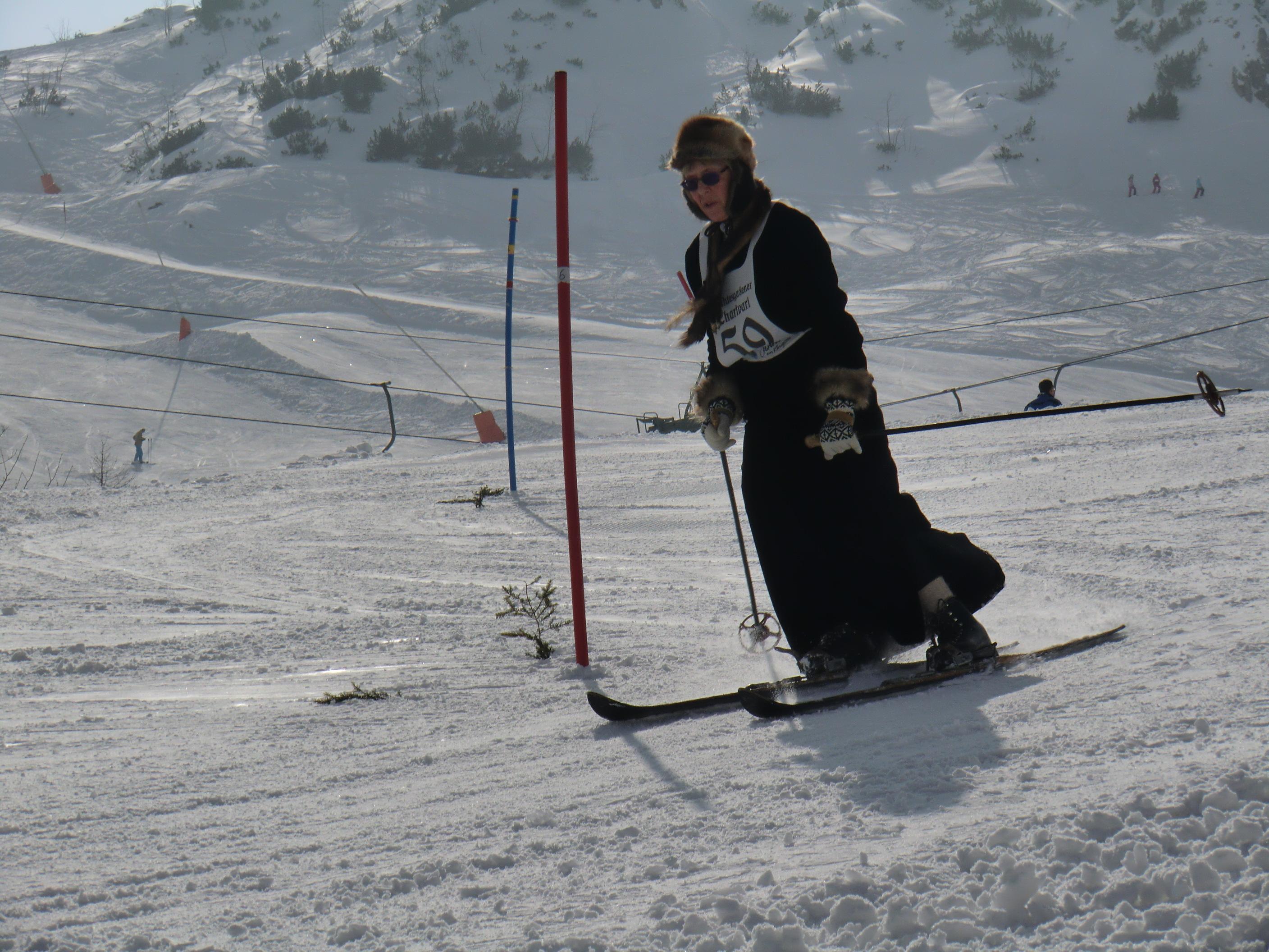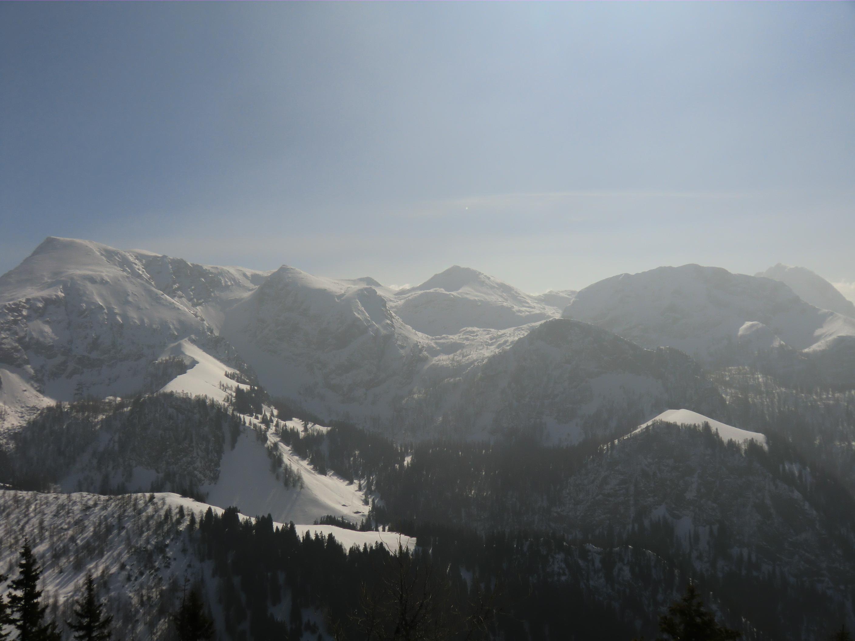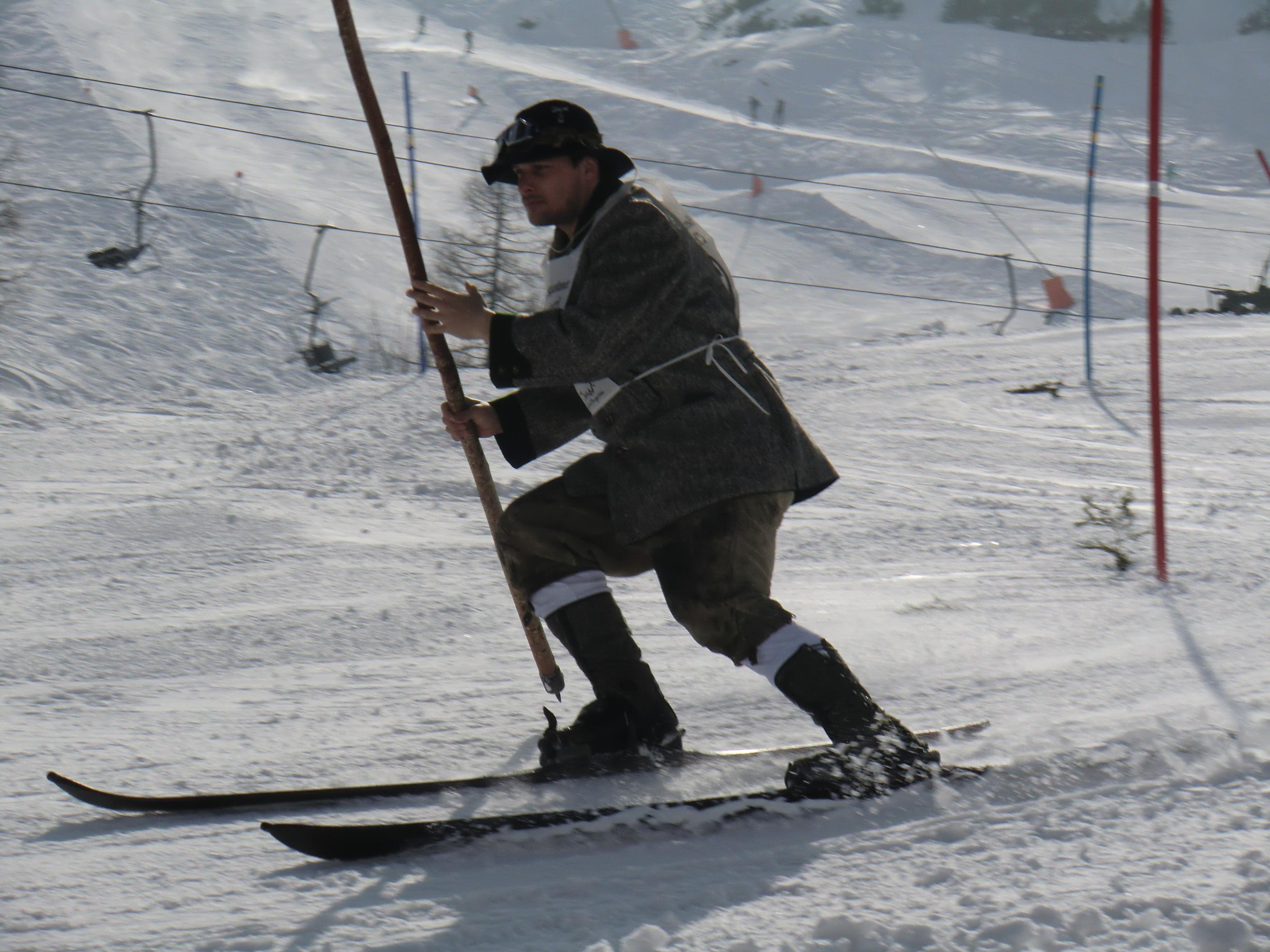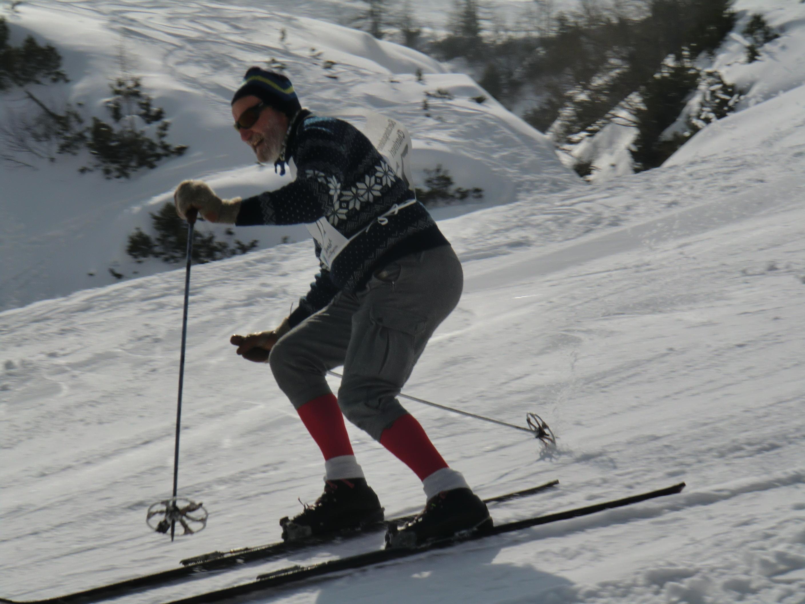 Der Jenner bot heute beste Bedingungen. Waren die Wiesen unterm Krautkaser abseits der Pisten schon mal ziemlich aper, so präsentieren sie sich jetzt wieder hochwinterlich – nordseitig auch noch in Pulverqualität. Am Gipfel windstill. Die Luft war dunstgeschwängert und die Fernsicht somit diesig. Dafür entschädigte eine nostalgische Draufsicht am Mitterkaser. Dort gaben altehrwürdig Pioniere heute ihr Schikönnen zum besten: Holzschi ohne Stahlkanten, legendäre Kandaharbindung, mit Haselnussstecken oder im Einstock-Stil, im wallenden Loden und mit schafwollenen Gamaschen, die Schi tlw. so alt wie ihre Fahrer/innen. Ein Augenschmaus – jenseits von Goretex, Primaloft und Sicherheitsbindung. Mit einer inneren Verneigung aber doch froh über mein neumodernes Zeux an den Füssen ging es beschwingt zurück bis Mittelstation. Von dort eine kurze Tragestrecke bis PP Hinterbrand.