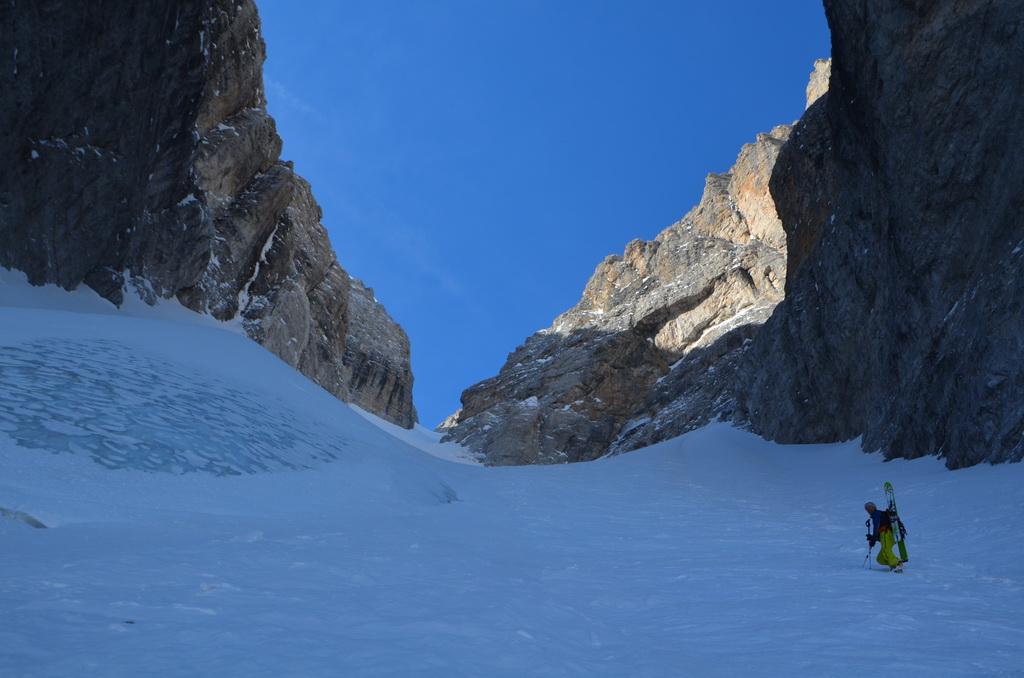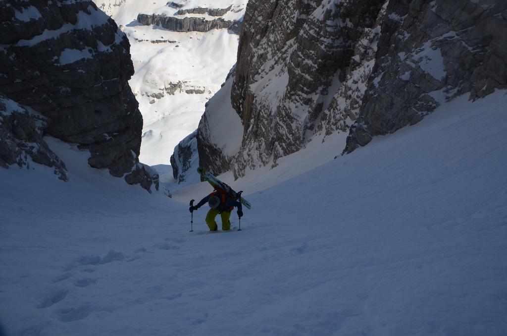 Der Aufstieg gestaltet sich durch die hohe Schneelage und den langen Talhatscher zwar recht mühsam (Straße wird sicher noch einige Zeit geschlossen sein), allerdings ist es das bei weitem auch wert. Wir hatten am Biwak eine klare Nacht und in der Früh war die Schneedecke hart gefroren. In der Rinne war es dann wirklich gut zum Stapfen und bei der Abfahrt super griffig. Die Einfahrt ist etwas abgerutscht und so haben wir es unseren Vorgängern gleich getan..(ein Schwingen ist hier schwer möglich und war uns auch zu riskant)...erst an das Gelände gewöhnt war es dann echt gut zum Fahren. Am Rinnenausgang bis in den Boden war dann perfekter Firn und wir konnten richtig Gas geben. Unterhalb von ca. 2000m wurde es dann schlagartig sulzig und der Schnee schwerer und schwerer. Die ewige Schupferei zurück zum Auto gab uns dann noch den Rest und wir waren dort schon gut erledigt. Die Anspannung in der Rinne, die lange Stapferei und die 2000hm Abfahrt bei immer schlechter werdenden Schnee im unteren Teil habens schon in sich.