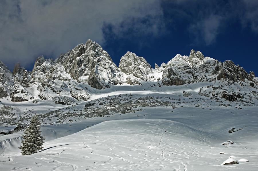 Mittags noch schnell an die frische Luft; vom Arthurhaus zu den Wänden, herrlicher Tag, so etwa 10 cm lockerer Pulver auf nicht immer tragen Untergrund, mit zunehmender Höher Erwärmung, morgen ist mit leichtem Harschdeckel zu rechnen.