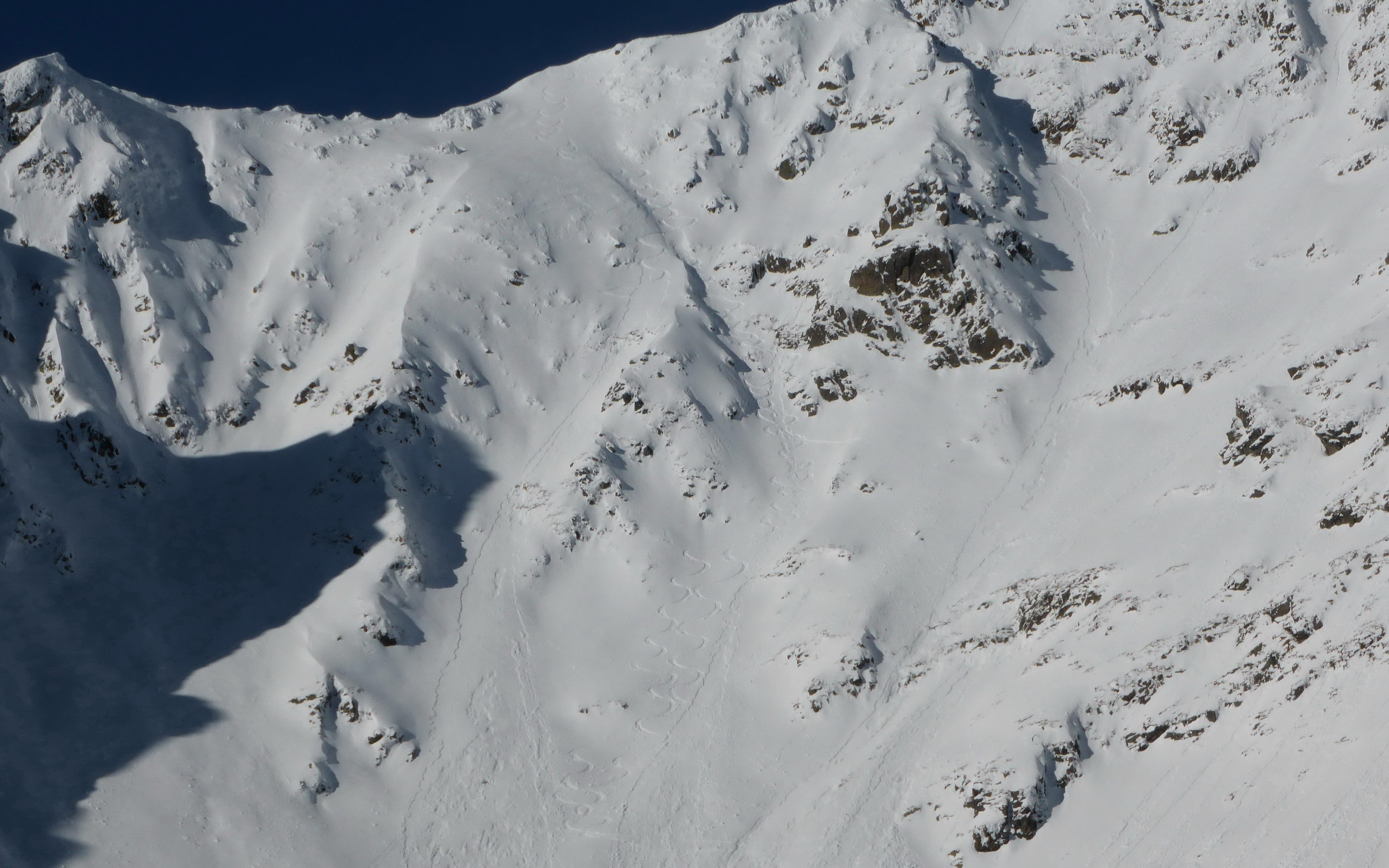 Ab der Wildbachhütte heute eine leichte Neuschneeauflage, die unterhalb von 2.000 m sonnseitig schon angestochen war - schattseitig teilweise auch die Altschneedecke noch pulvrig