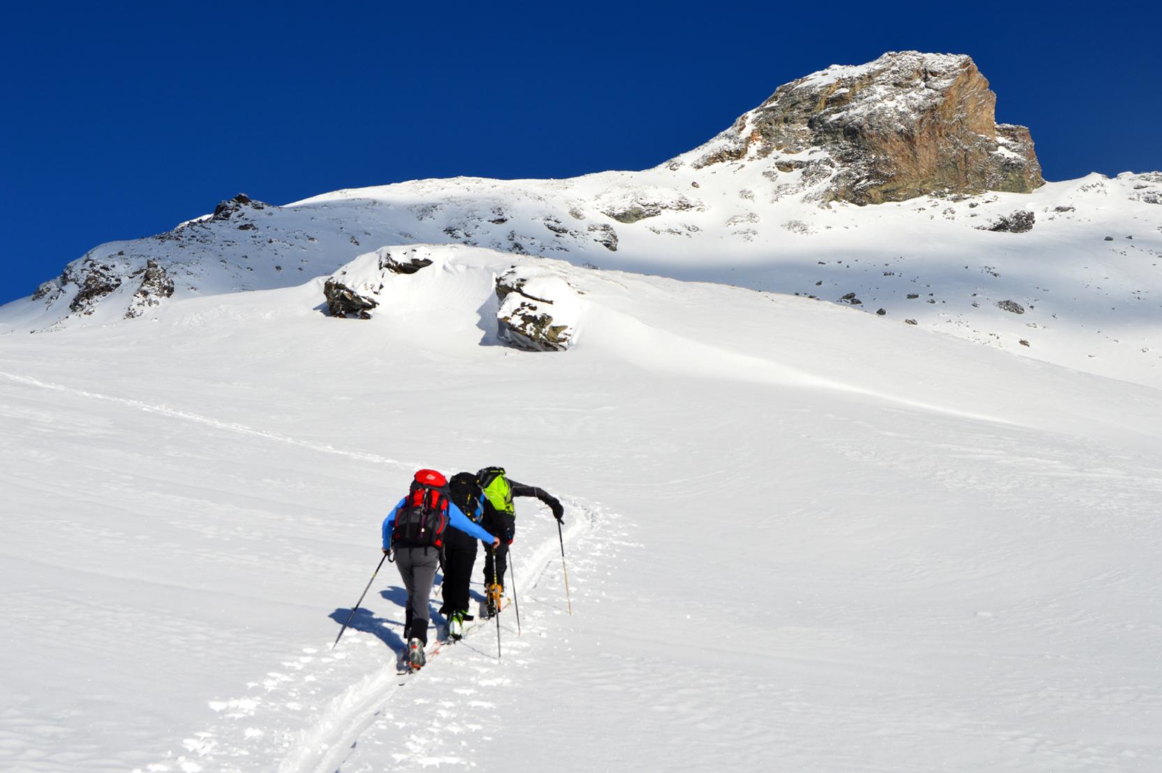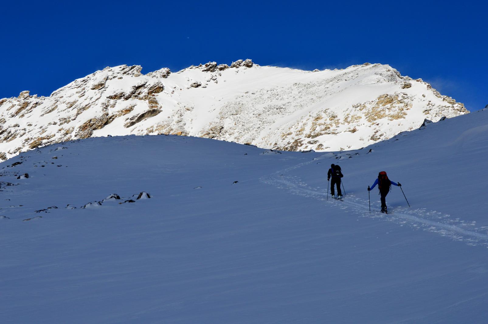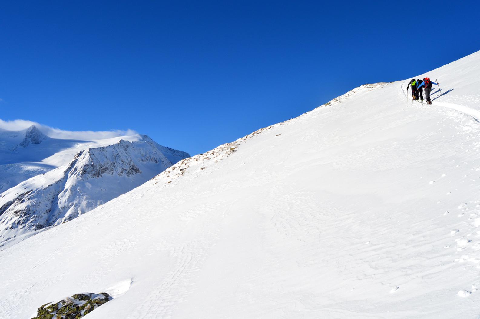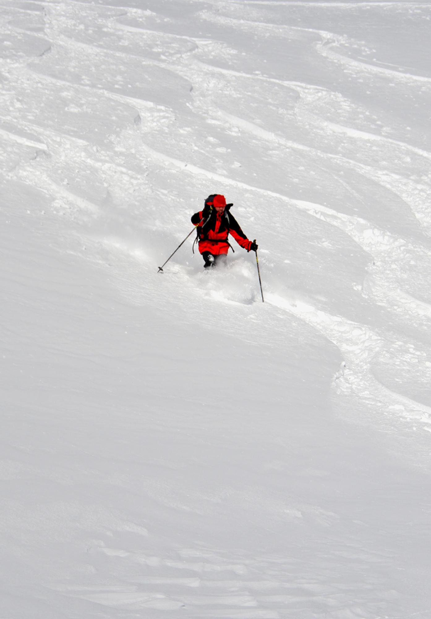 Es liegt bei weitem nicht so viel Schnee wie wir erwartet hatten. Der Wind hat die letzten Tage ganze Arbeit geleistet, aber auch in windgeschützten Lagen sind nirgends mehr als 50cm. Entgegen dem Wetterbericht überraschte uns am Morgen ein strahlend blauer Himmel. Kurz vor dem Gipfel zog es dann leider von Süden her kpl. zu und innerhalb kürzester Zeit blies uns ein kalter Wind um die Ohren, weshalb wir auf die letzten Meter zum Gipfel verzichteten.
