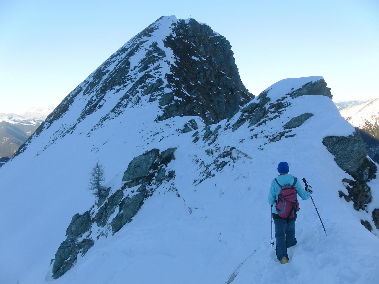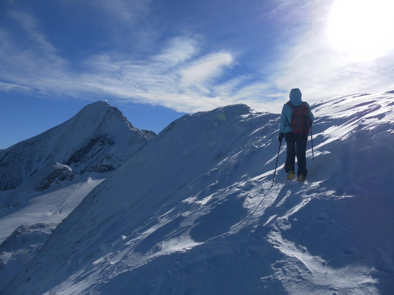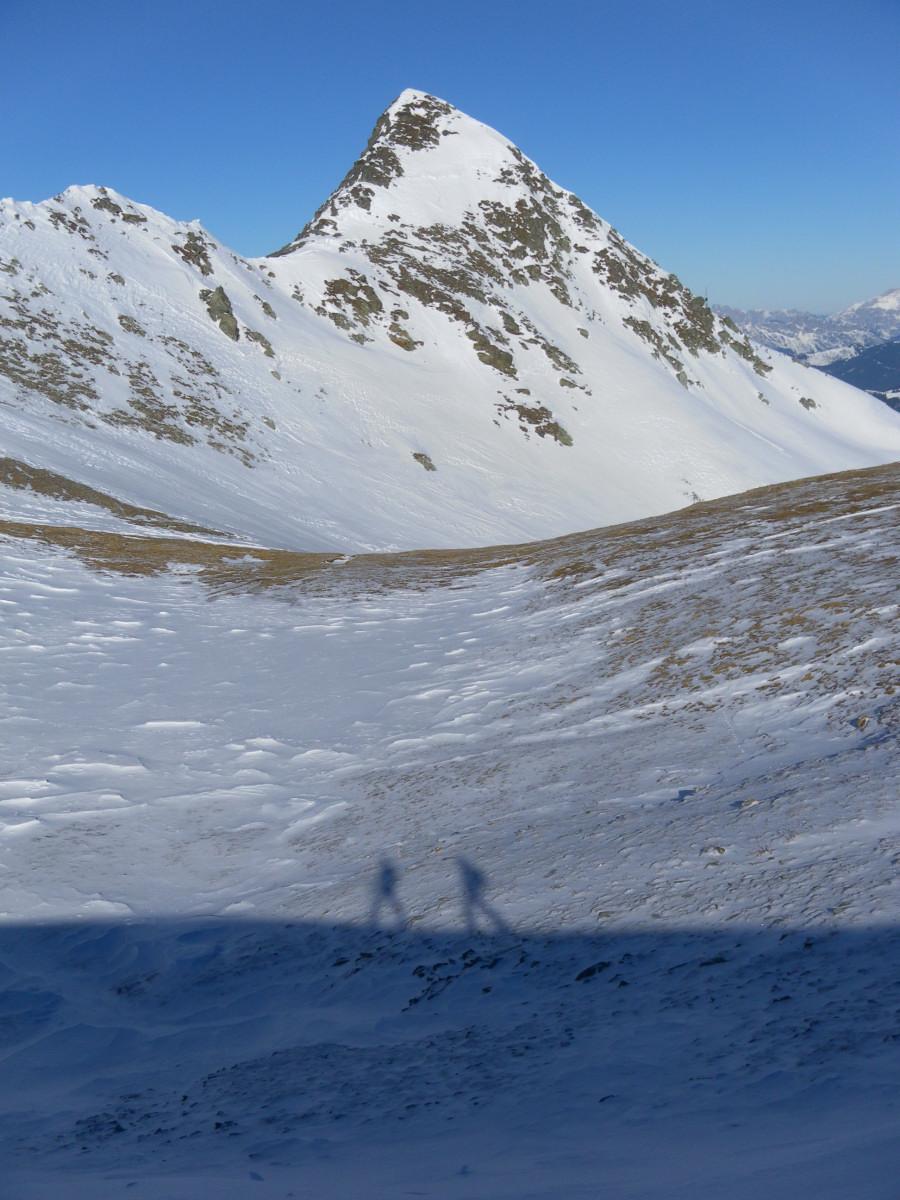 Am Sonntag bläst bei blauem Himmel ein unangenehmer Verfrachtungswind aus Süd. Abseits der Pisten steigen wir zum Großen Schmiedinger auf. Sein Nordgrat ist teils abgeblasen, in der Flanke liegt auf beinhartem Untergrund brettartig abgelagerter Schnee, sodass wir den Gipfel lieber zu Fuß anpacken.