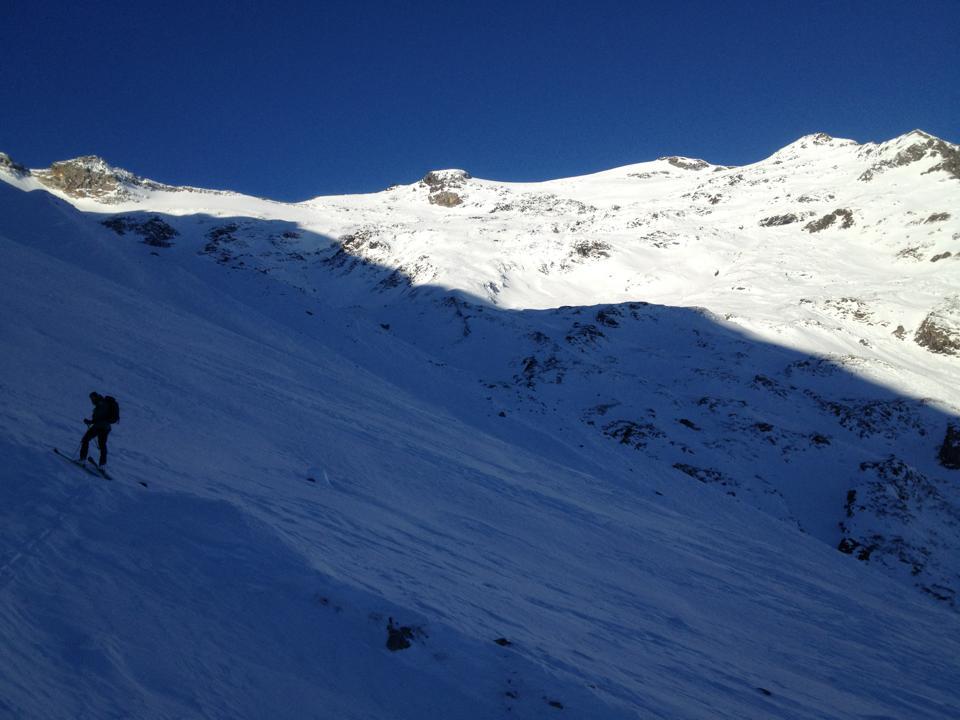 Schneeverhältnisse: Von Harsch über Bruchharsch bis Pulver alles vorhanden. Meist tragender Harschdeckel der Trotz strahelenden Sonnenschein nicht auffirnte. Letztes Stück stark abgeweht und Eisig. Abfahrt ging dank tragenden Harschdeckel erstaunlich gut.