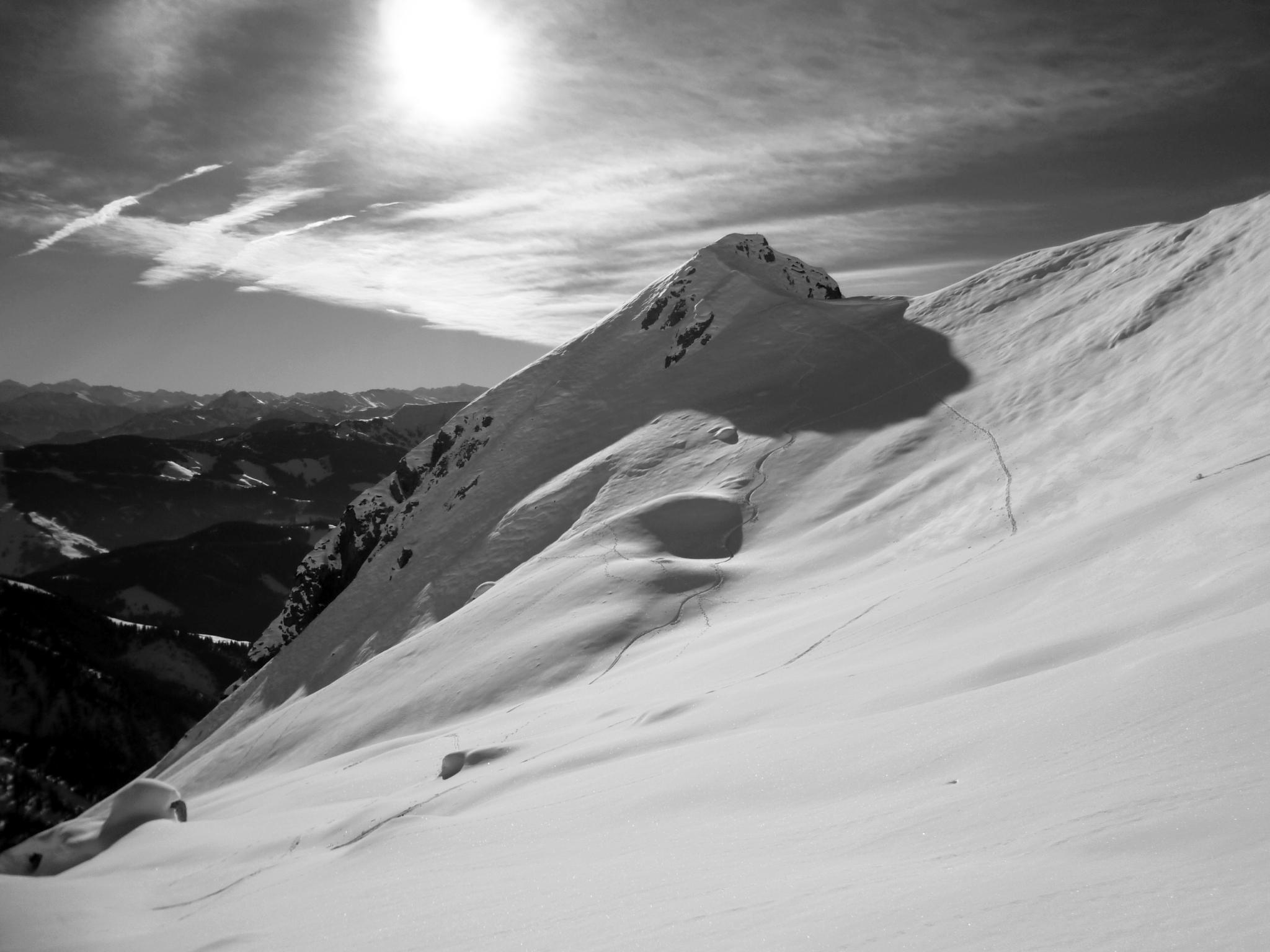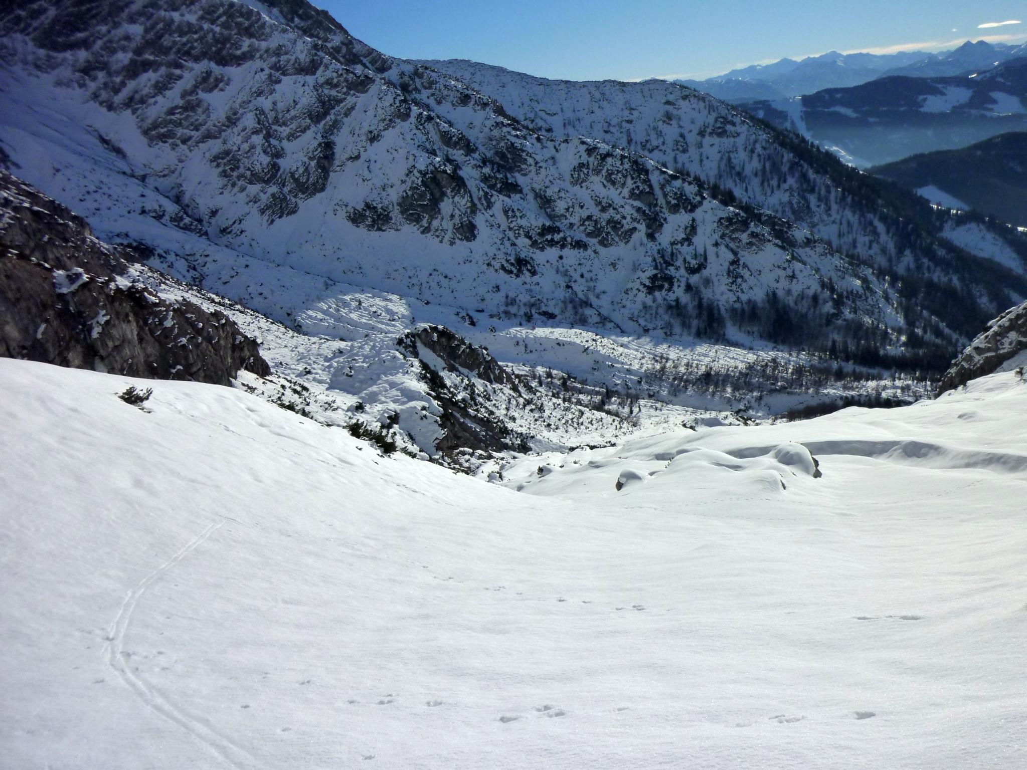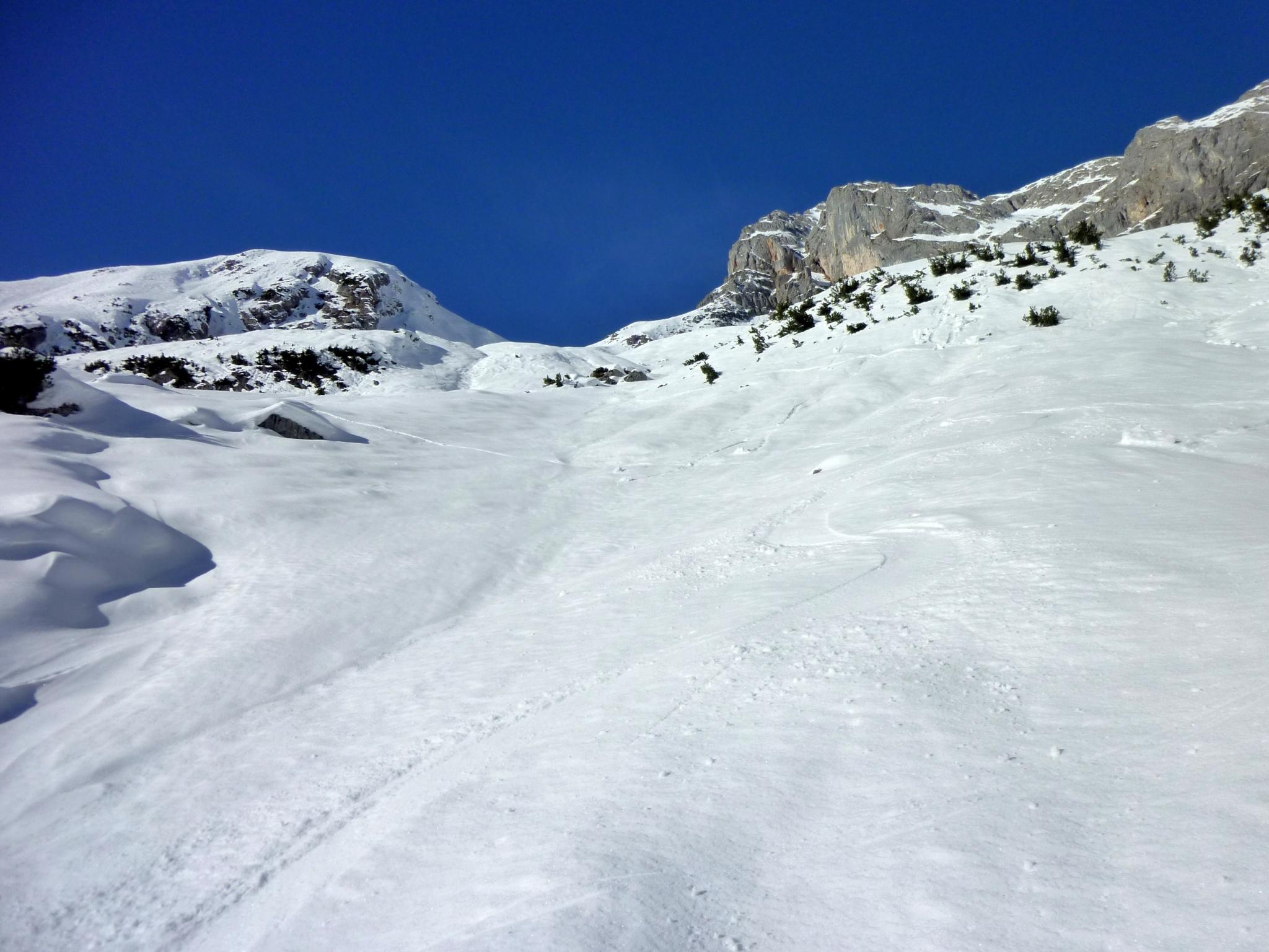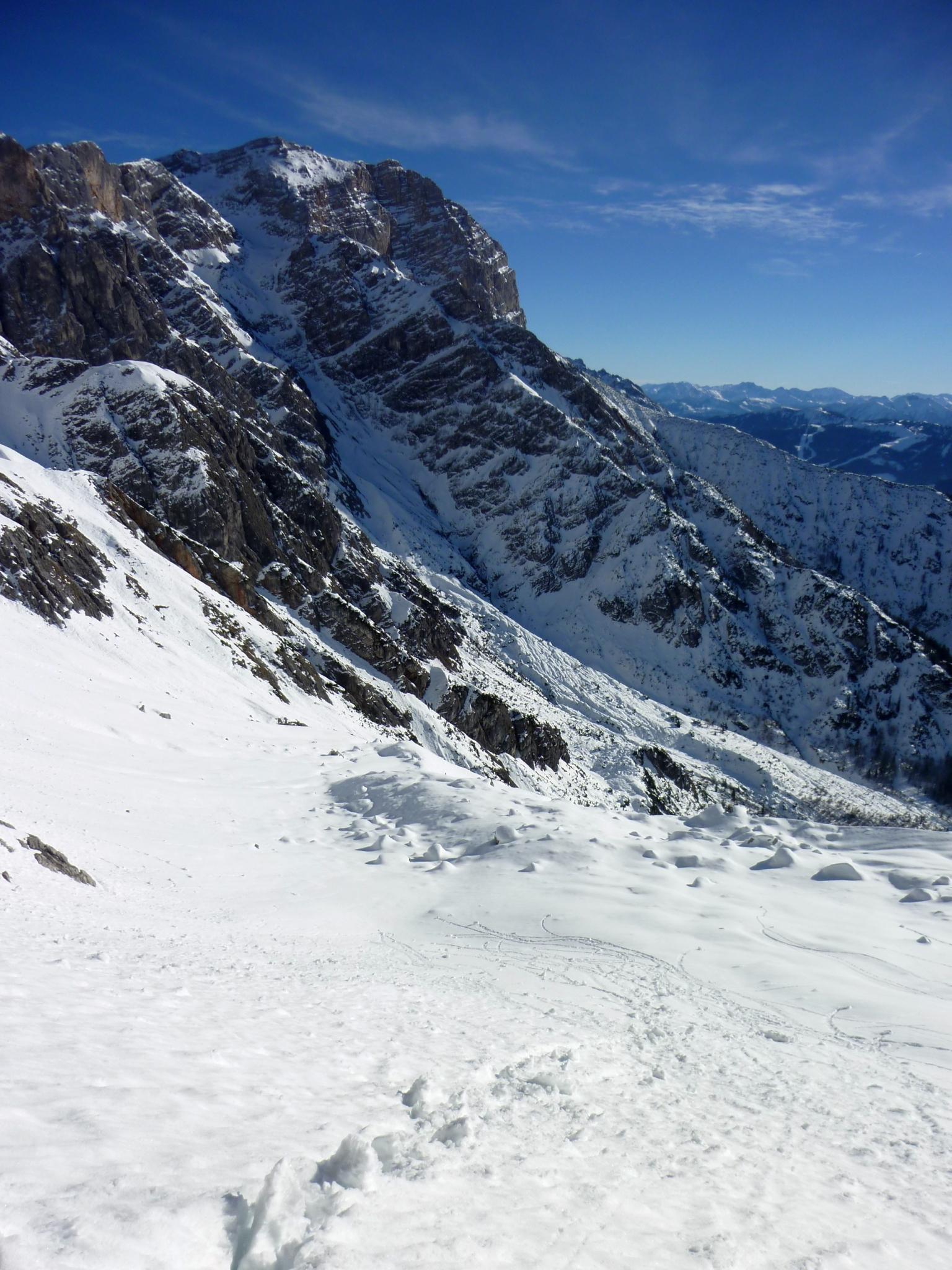 Route: Aufstieg von Rohrmoos über den Forstweg bis ein Stück unterhalb der Freithofalm, dann den Zintgraben queren und nach einer kurzen Unterholzübung durch das schöne, im mittleren und oberen Teil bereits recht gut verschneite südostseitige Sohlental auf den Hühnerkopf. Zwischenabfahrt und Aufstieg bis an den Fuß der das Kar abschließenden Felswände des Streichenbeils.