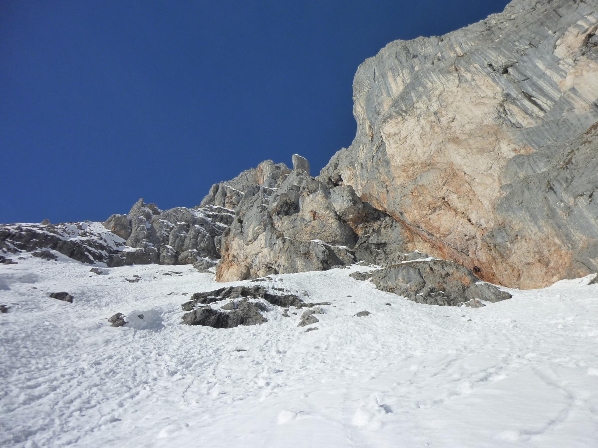 Lawinen: Beste Verhältnisse, subjektiv empfunden Stufe 1, lediglich direkt unterhalb der Felswände ist im steilen Bereich der Schnee bereits sumpfig geworden, was auch der Grund war, warum ich die letzten fünfzig Meter nicht mehr bis ganz zum Wandfuß hinauf bin.