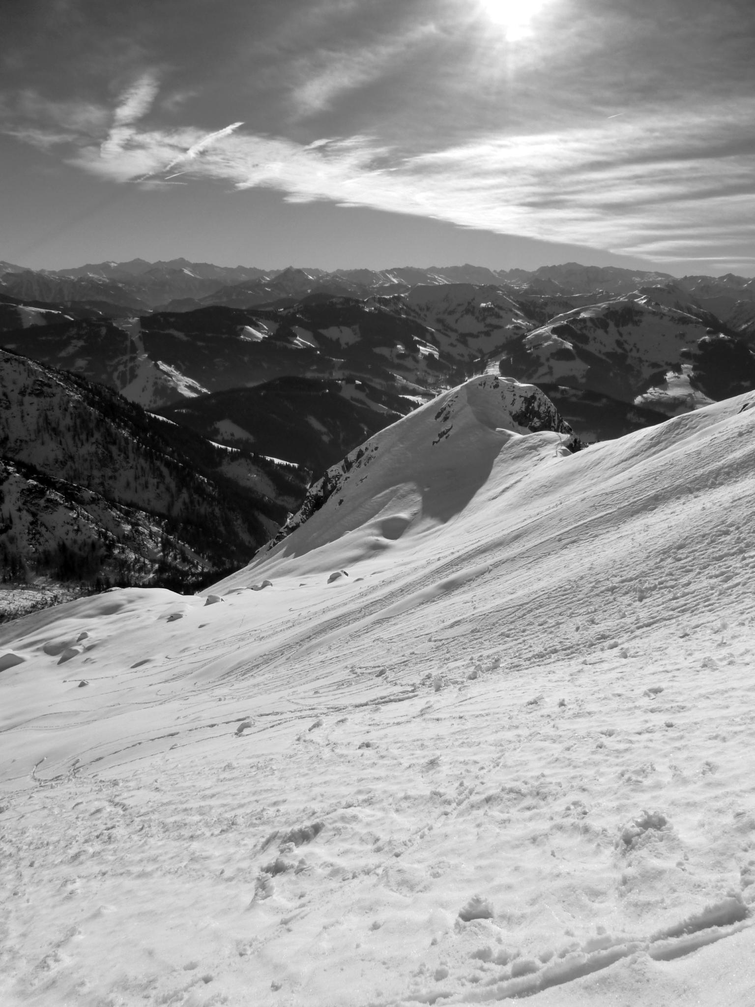 Schnee: Ab Karbeginn tragend mit ca. 3-4 cm starkem Deckel, schattseitig meist Harsch. Bei der Abfahrt teils Pulver im geschützten Bereich, die sonnseitigen Hänge ideal aufgefirnt, 1-2 cm. Mit konzentrierter Fahrweise war auch die Latschenbuckellandschaft im unteren Teil recht gut befahrbar. Der Bruchharsch unterhalb der Freithofalm und im Auslauf nach Rohrmoos ist nicht aufgegangen, war aber passabel zu fahren. Die Forststraße ist eine geräumte Bobbahn, bei der Querung des Zintgrabens habe ich die Ski zwecks Belagschonung kurz getragen. Abfahrt (11:30 Uhr) noch vor Eintreffen der Wolken.