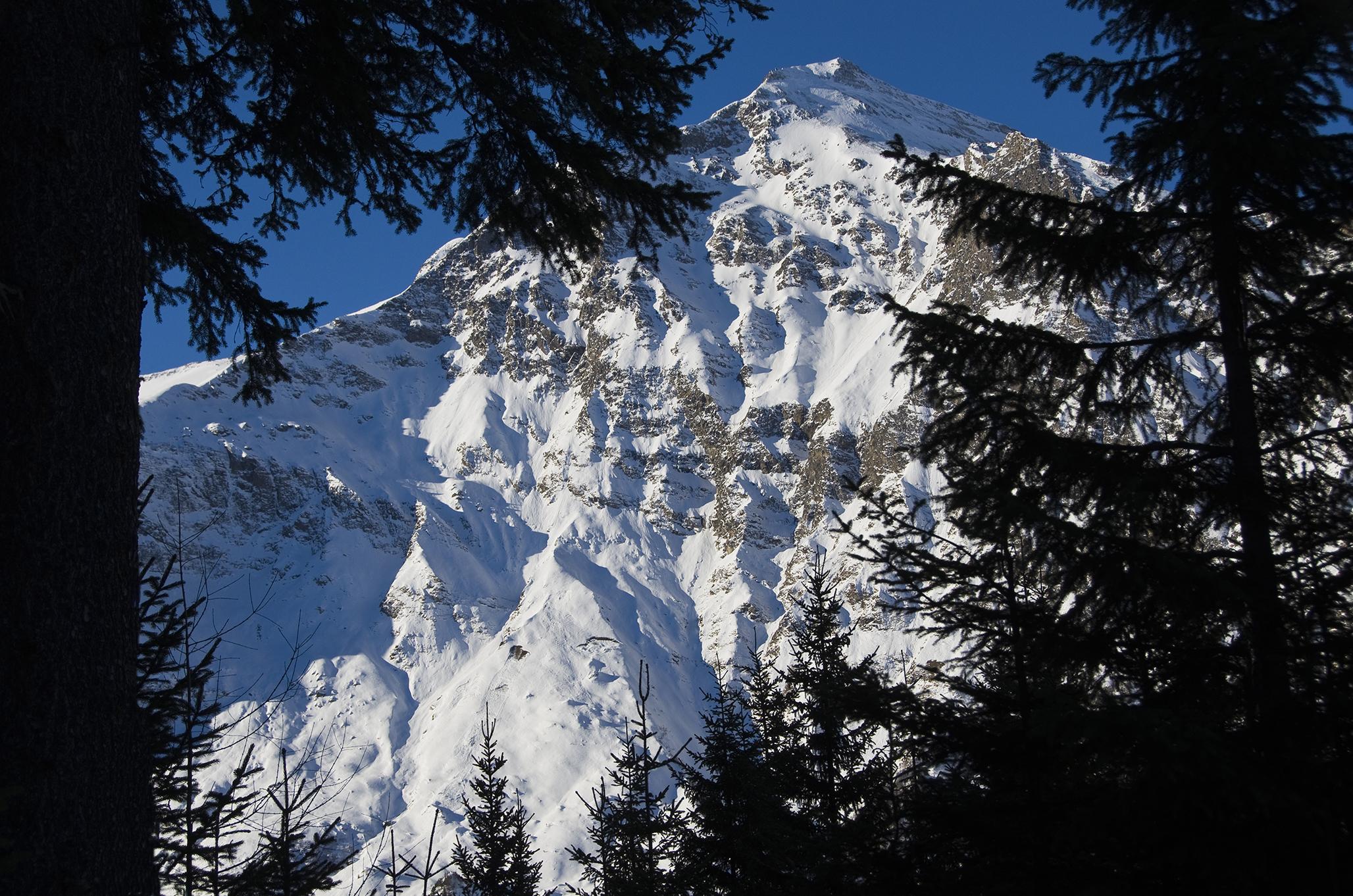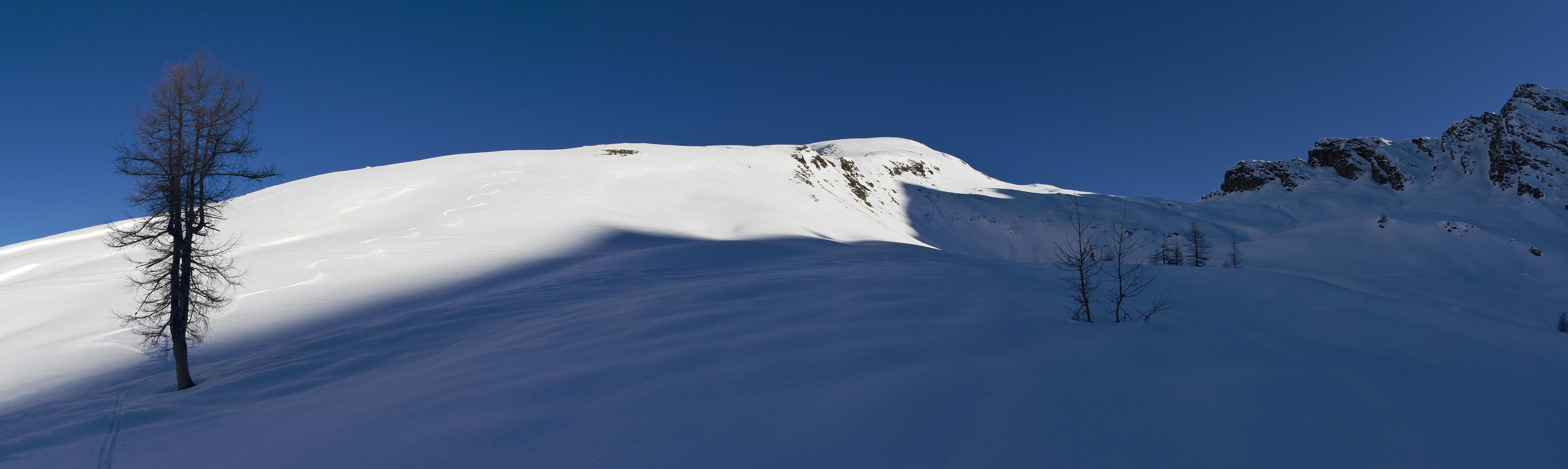 Tatsächlich habe ich dann bei der Abfahrt zu den Durchgangsalmen Firn und Sonnenschein, und nach dem Wiederanstieg im Kolmkar leicht windbehandelten Pulver. Nur ganz oben ist es hart und windgepresst, wenn man weiter unten das Gelände richtig nutzt, hat man bei der Abfahrt Pulverschnee zwischen 5 und 20 cm auf fester Altschneedecke, der manchmal einen (leicht zu fahrenden) dünnen Windharschdeckel hat. Im steilen Lärchenwald über den Almen noch nicht einmal das. Nachmittags frischt der Wind auf.