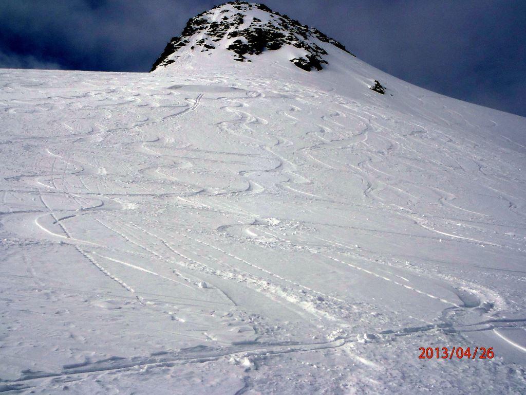 Abfahrt heute oben guter Pulver, der bald zu Firn wechselte.