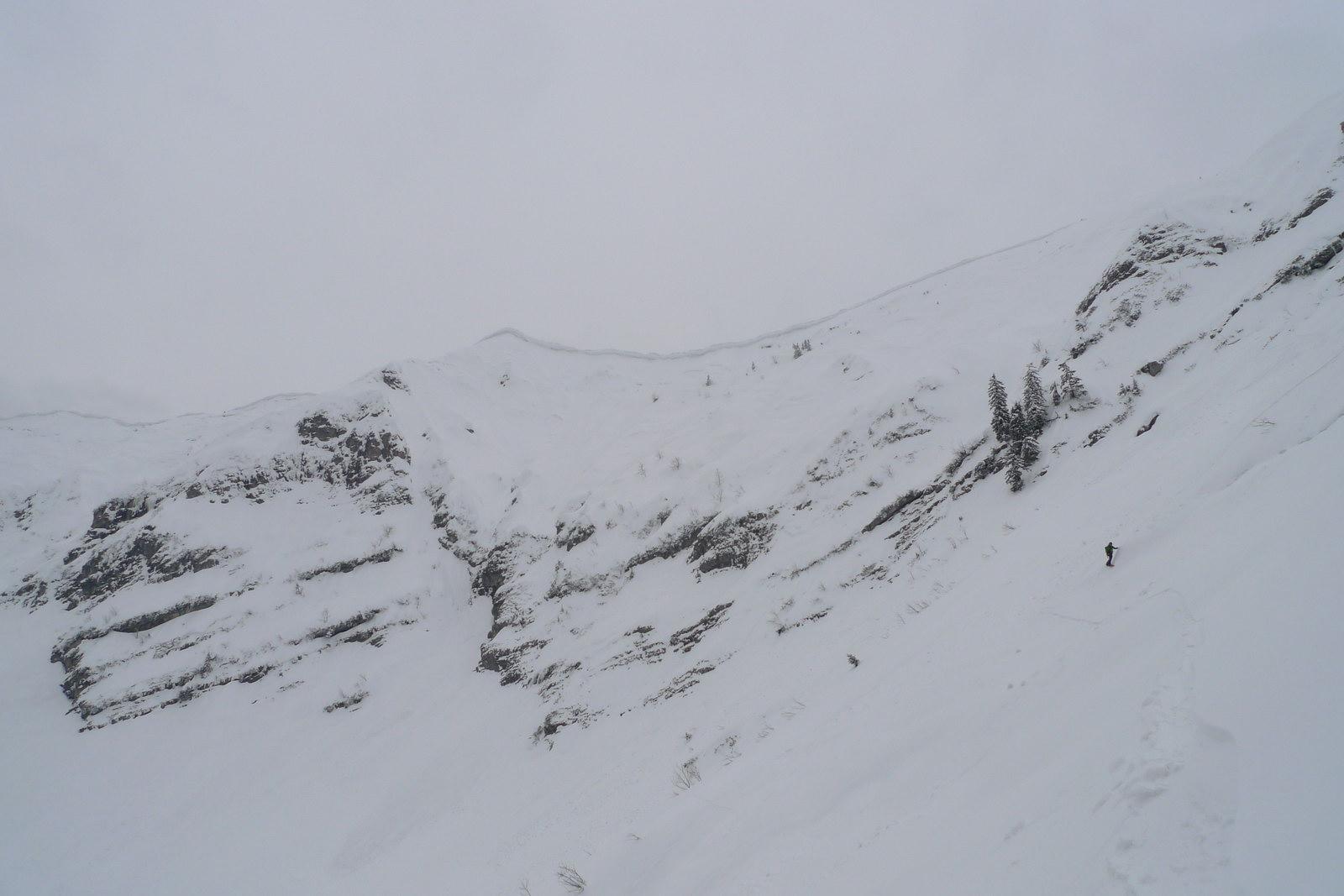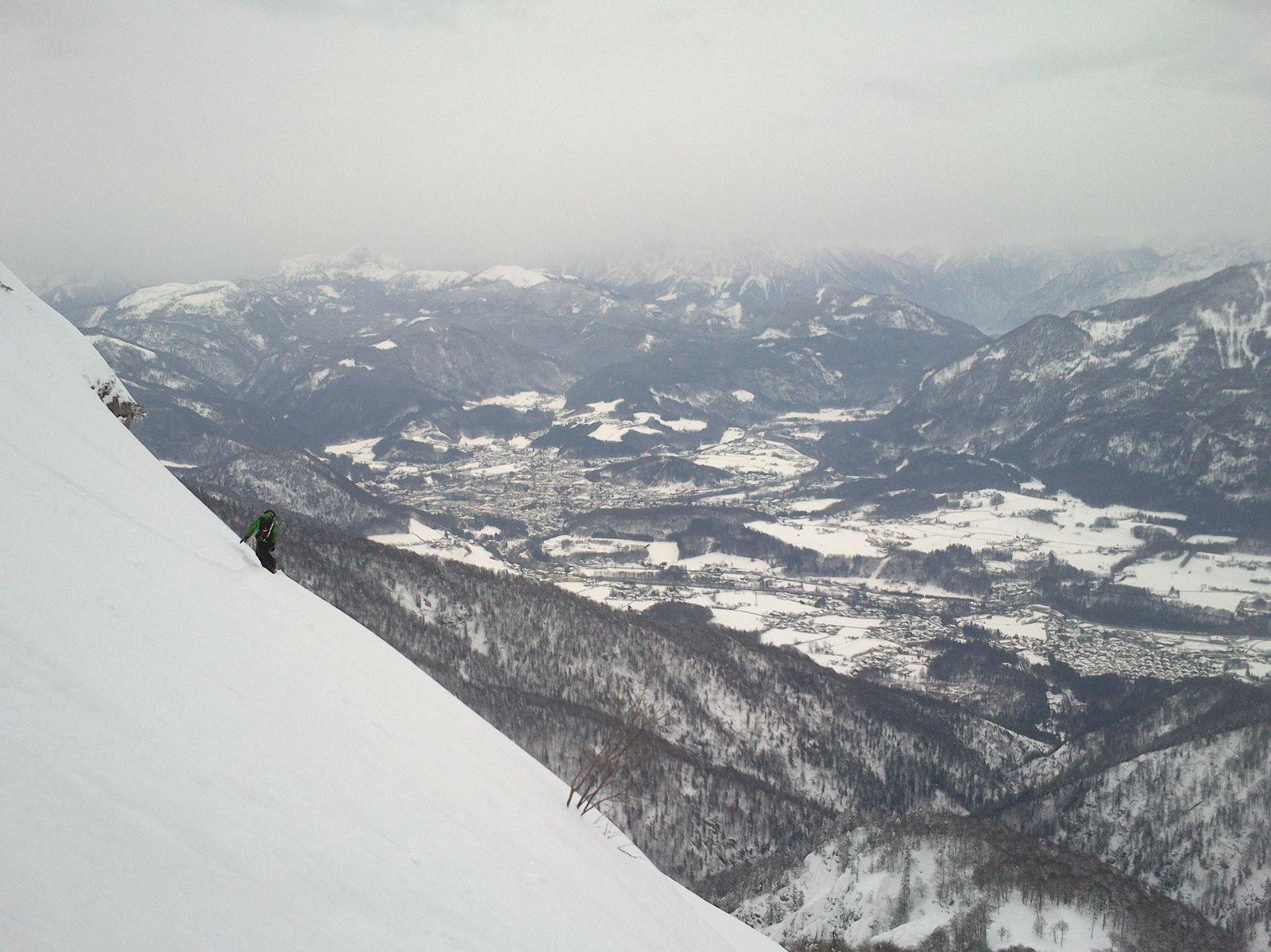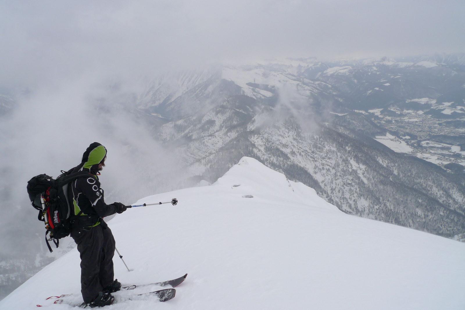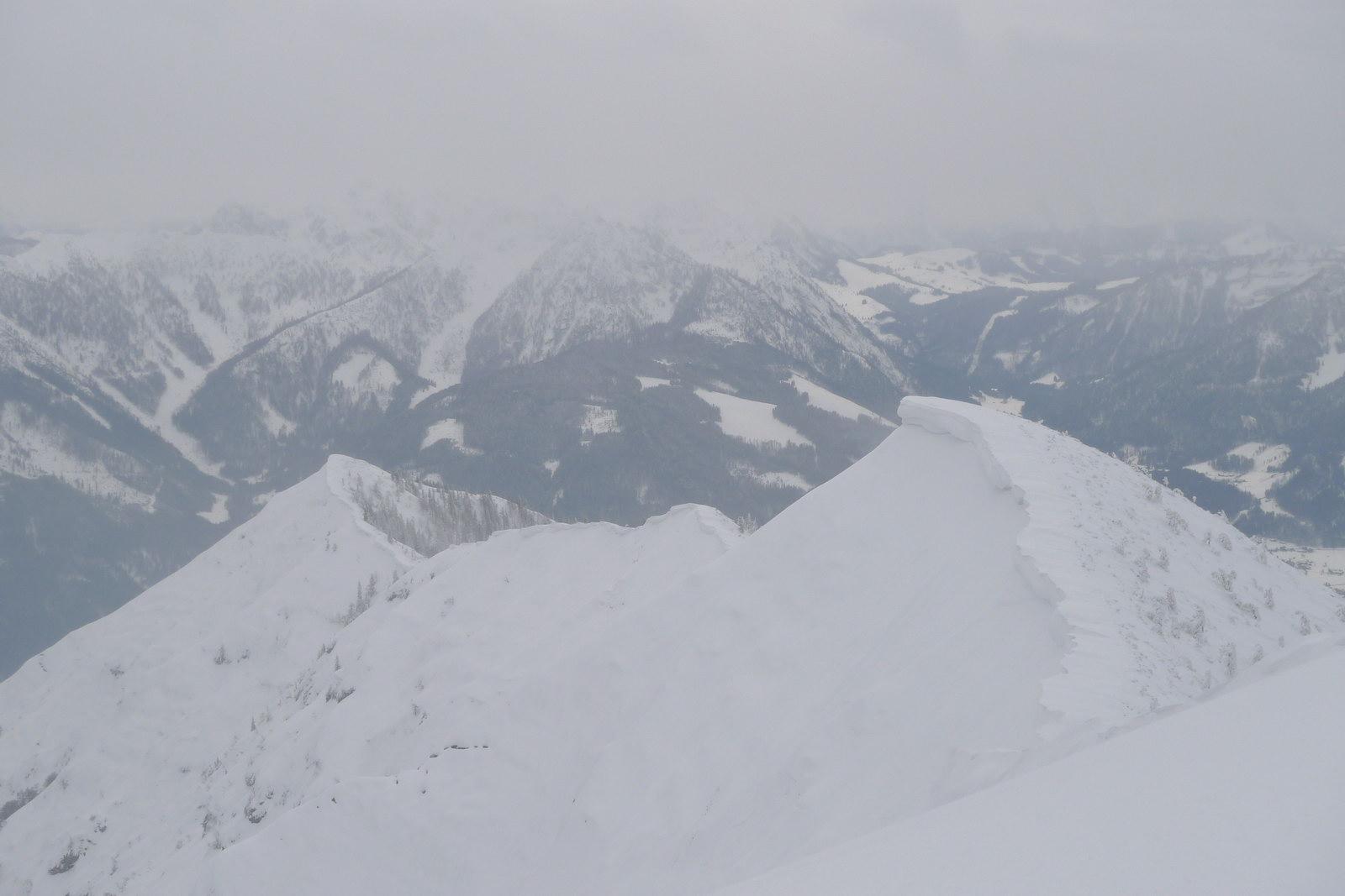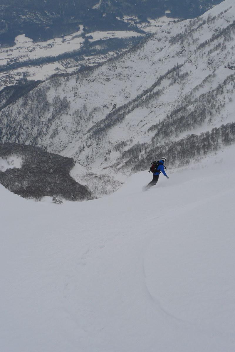 Gestern haben sich Werner und ich einen Jugendtraum erfüllt: wir sind die Zimnitz über den südlichen Trichter direkt nach Pfandl abgefahren. Oben bissl Pulver auf einem Harschdeckel, teilweise vereiste Lawinenbahnen"spines" zu queren, auf den mitrutschenden Sluff mussten wir aufpassen. Teilweise auch vereiste Lawinenknollen unter der Pulverauflage, in Summe aber fein zu fahren.