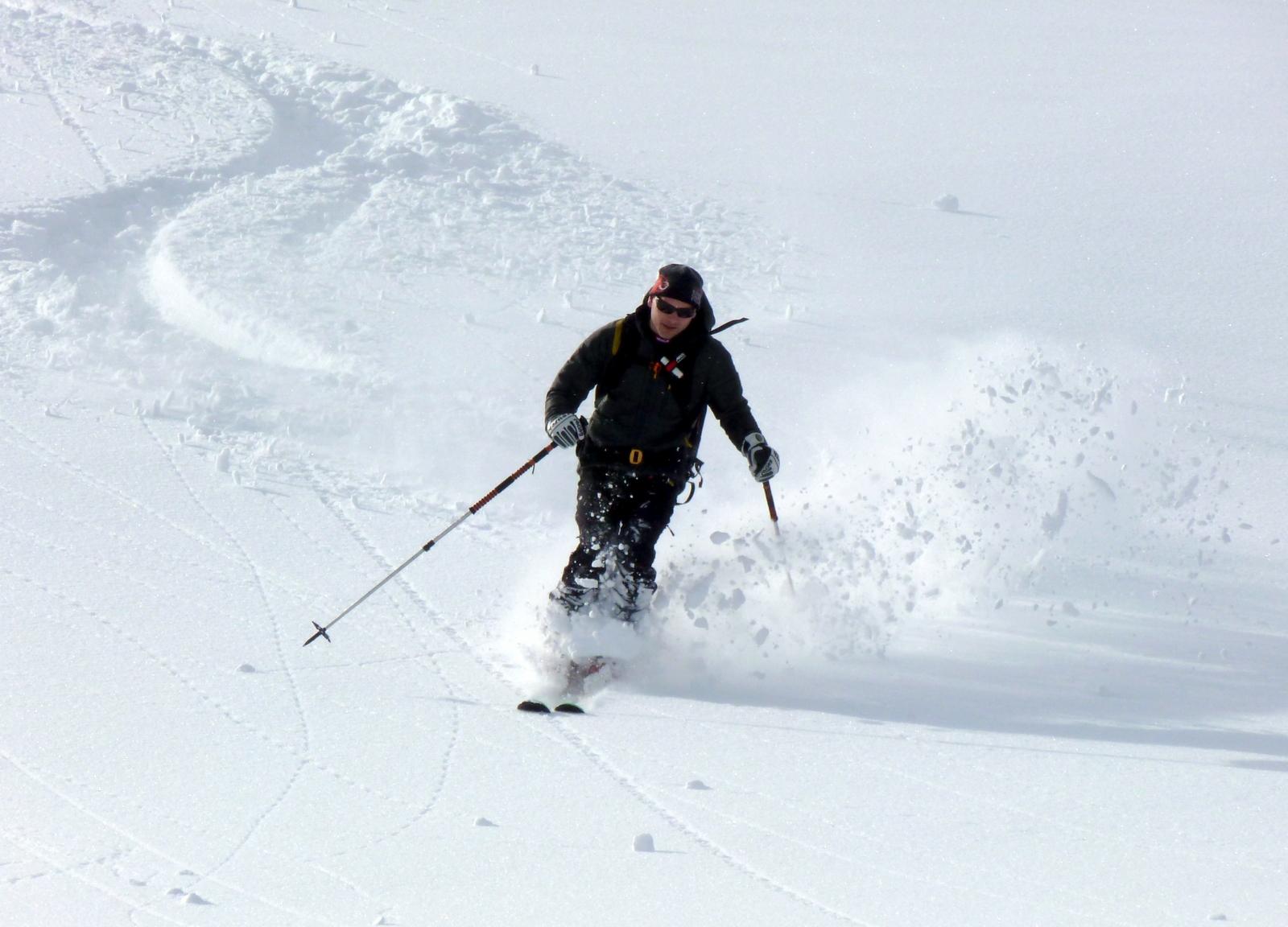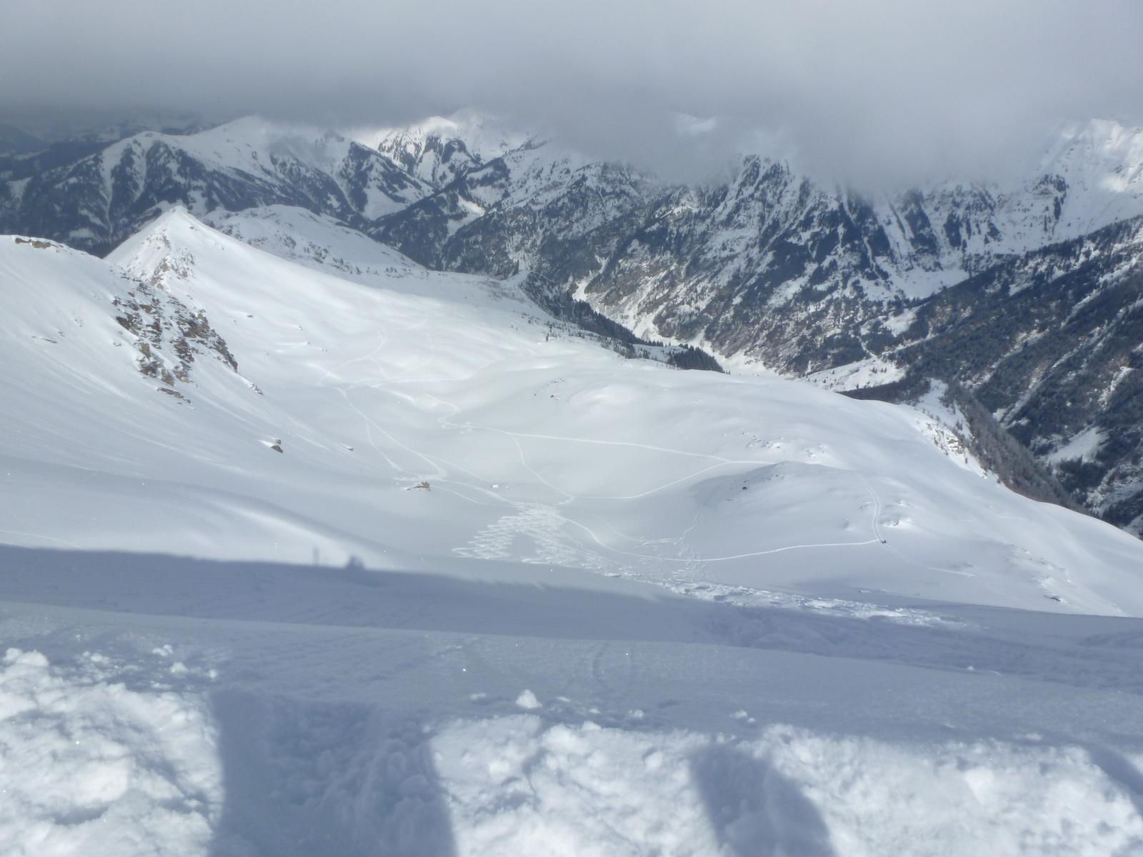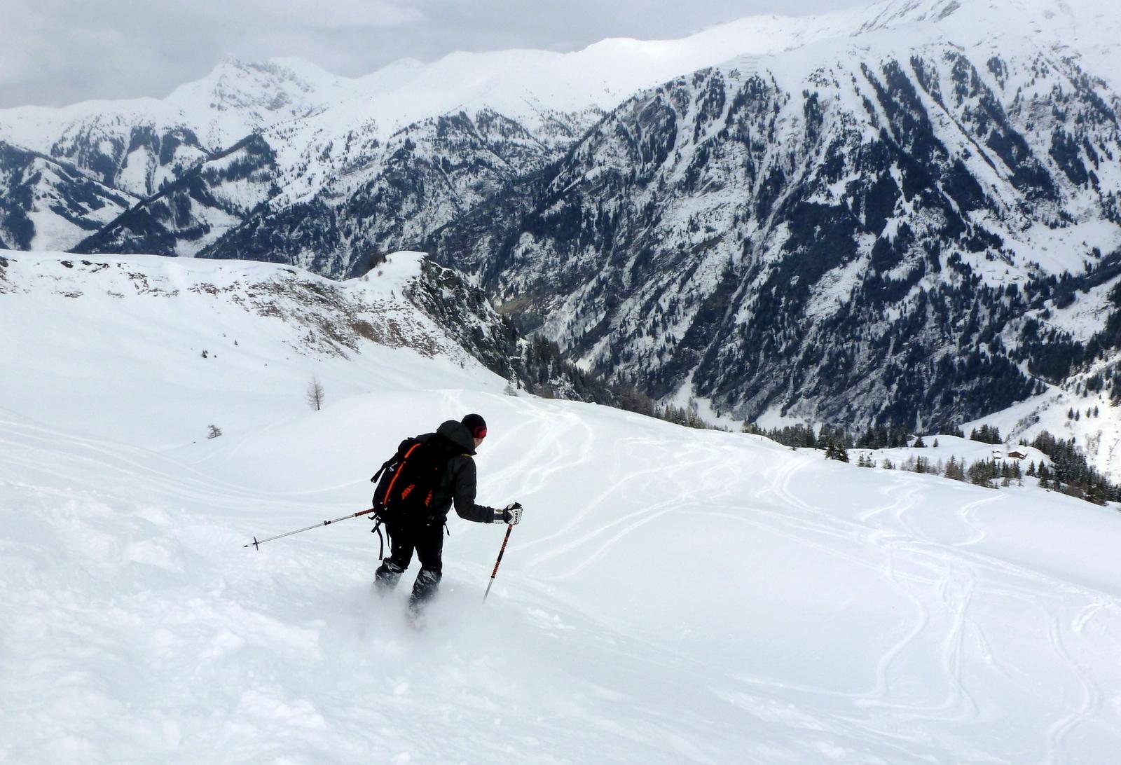 Die Aufhellungen überm Talschluss hinter Hüttschlag motivierten uns zum Abschluss zu einer höhenmeterträchtigen Tour auf den Mandlkopf mit einem "Nachschlag" in Richtung Plattenkogel, nachdem wir zunächst den wunderbaren Pulverhängen zur Jagdhütte unterhalb des Lienkogels nicht hatten widerstehen können. Bei unserer Rast vor der Modereggalm erfuhren wir von der so sehr ersehnten Goldenen in Schladming - und fast gleichzeitig kam noch ein äußerst flotter Aufsteiger aus dem Moderegg-Graben an uns vorbei, der in Richtung Plattenkogel düste ...