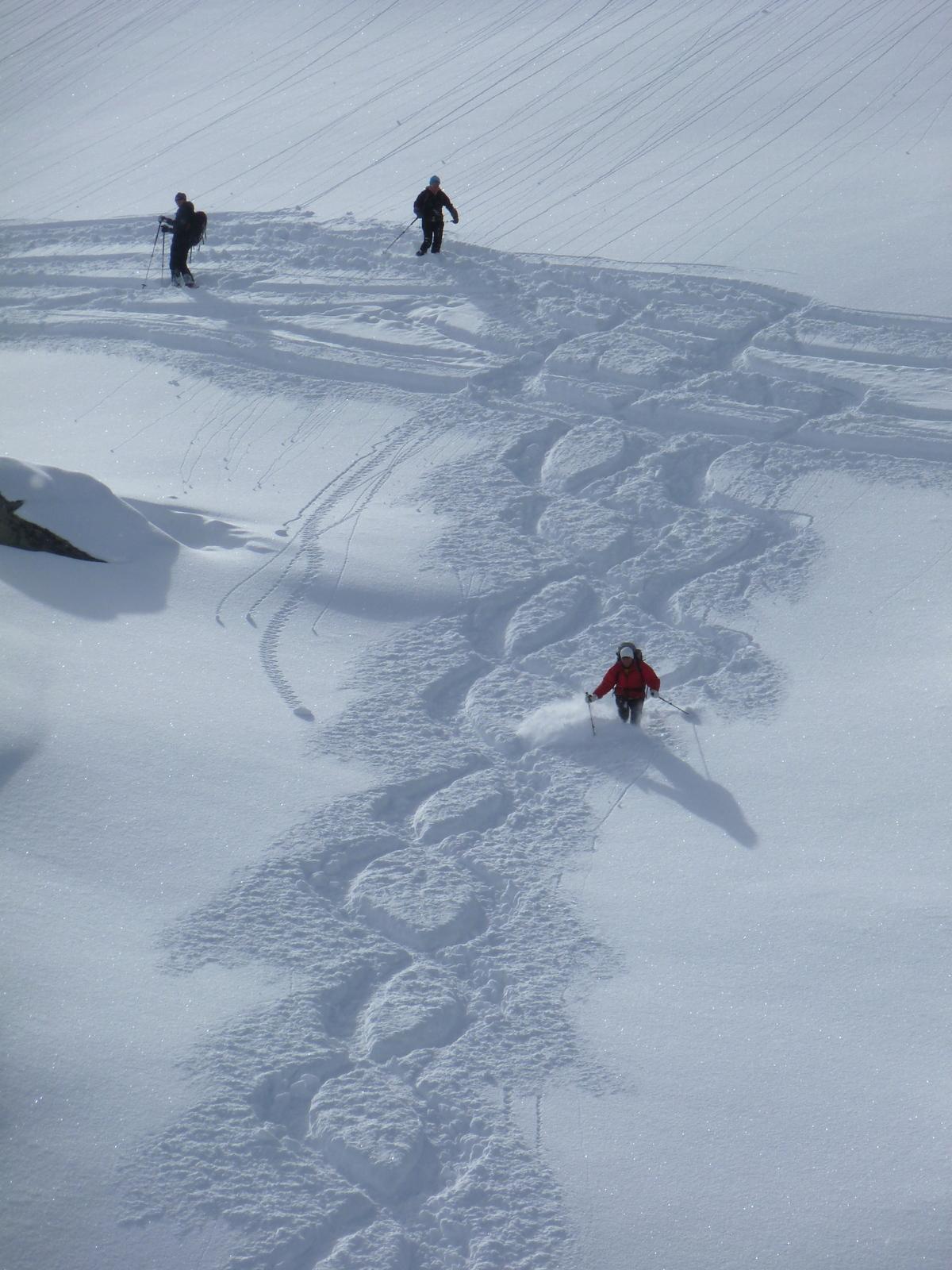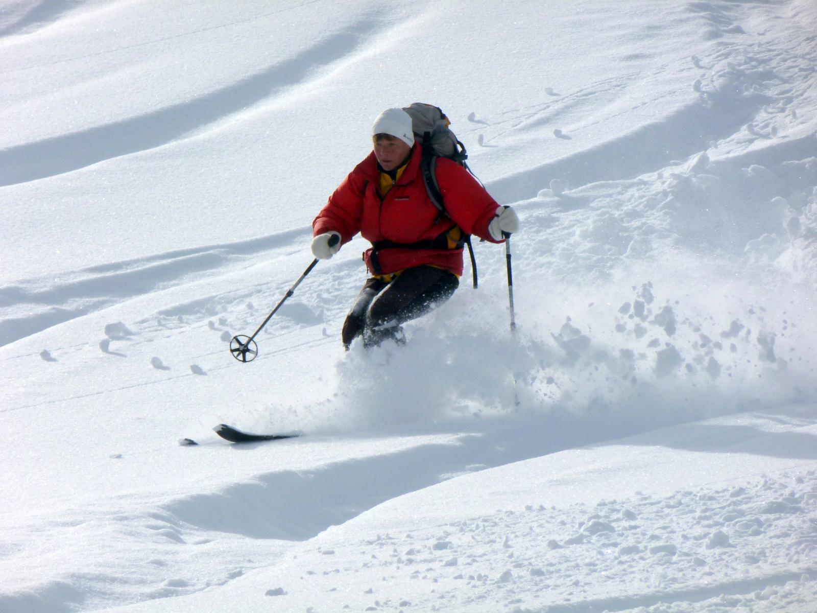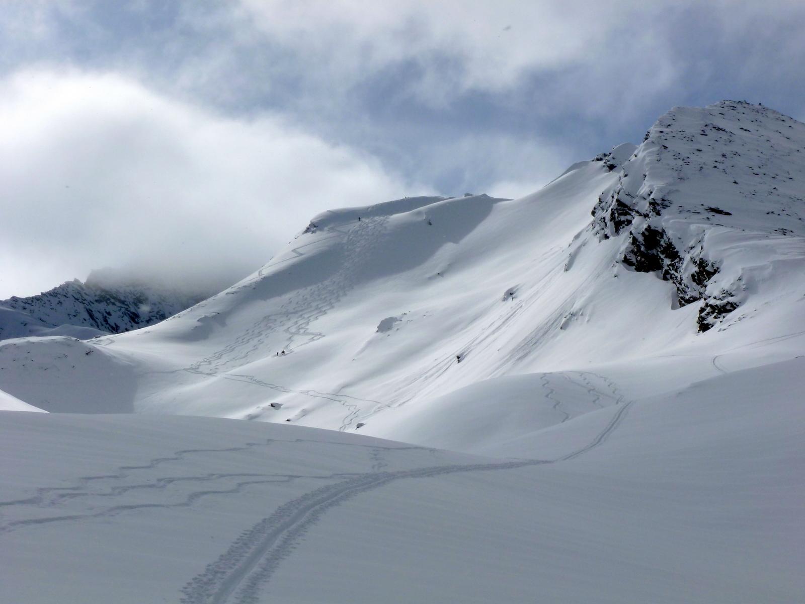 Die Aufhellungen überm Talschluss hinter Hüttschlag motivierten uns zum Abschluss zu einer höhenmeterträchtigen Tour auf den Mandlkopf mit einem "Nachschlag" in Richtung Plattenkogel, nachdem wir zunächst den wunderbaren Pulverhängen zur Jagdhütte unterhalb des Lienkogels nicht hatten widerstehen können. Bei unserer Rast vor der Modereggalm erfuhren wir von der so sehr ersehnten Goldenen in Schladming - und fast gleichzeitig kam noch ein äußerst flotter Aufsteiger aus dem Moderegg-Graben an uns vorbei, der in Richtung Plattenkogel düste ...