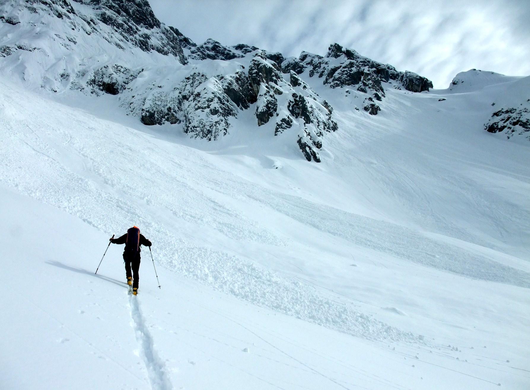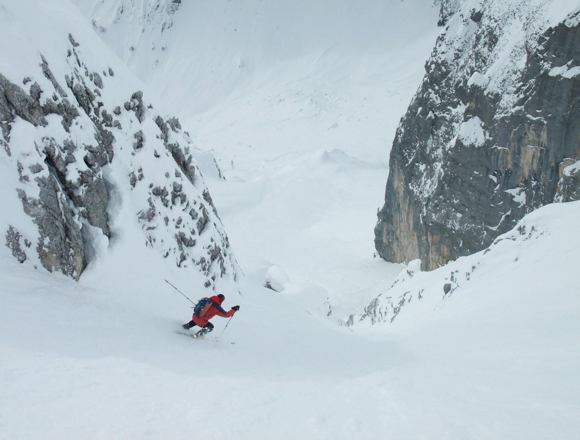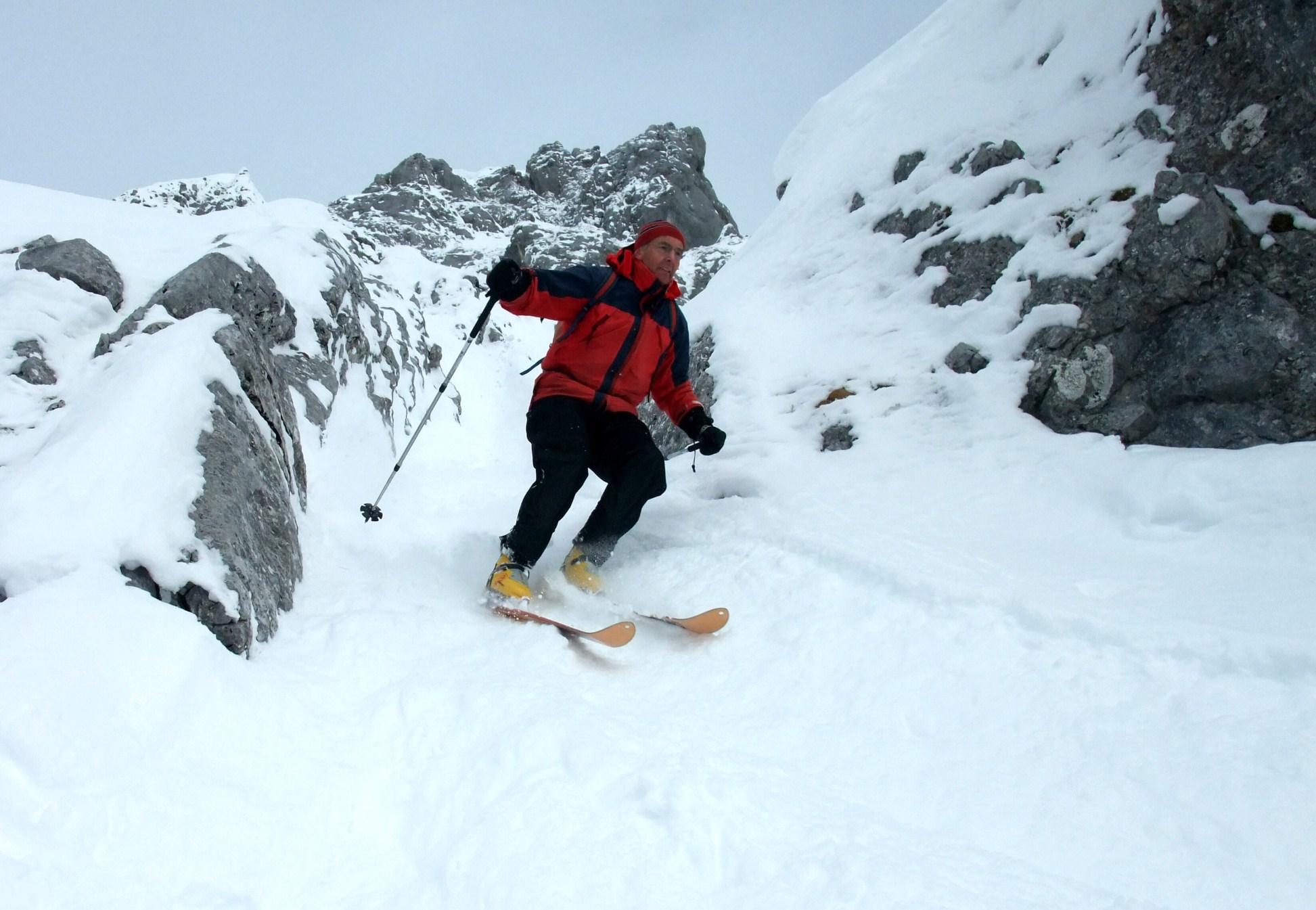 Sehr gute Verhältnisse, die steilen Passagen ohne Probleme zu begehen und zu befahren. Föhn erst am Gipfeldach.