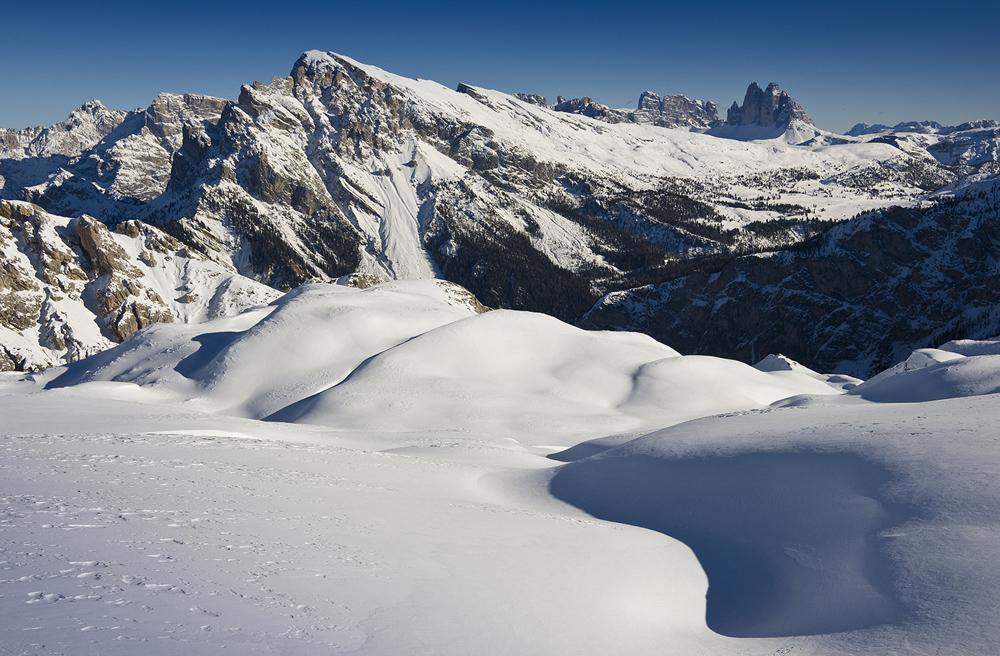 Der Nordföhn sorgt für gutes Wetter südlich des Alpenhauptkammes, gleichzeitig verfrachtet der Sturm jedoch den Schnee und die Lawinengefahr bleibt tagelang auf Stufe 3. Triebschneefelder bei diesem wetter gut erkennbar.
