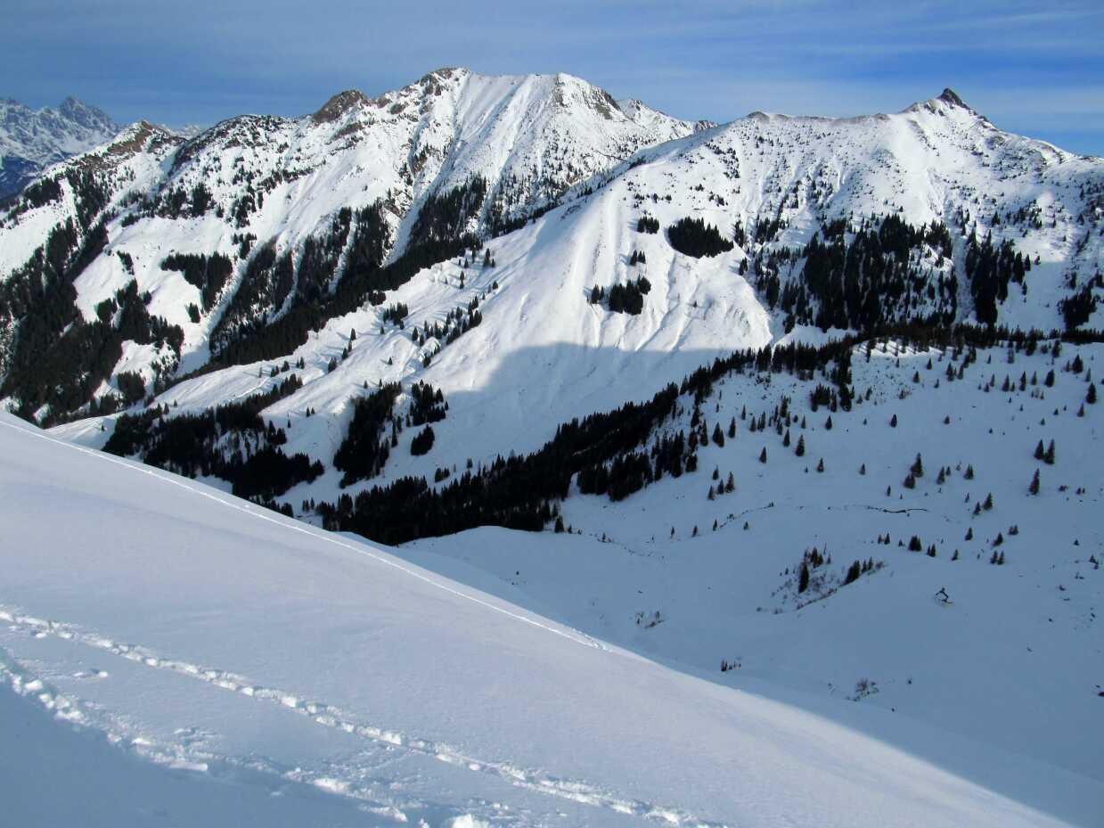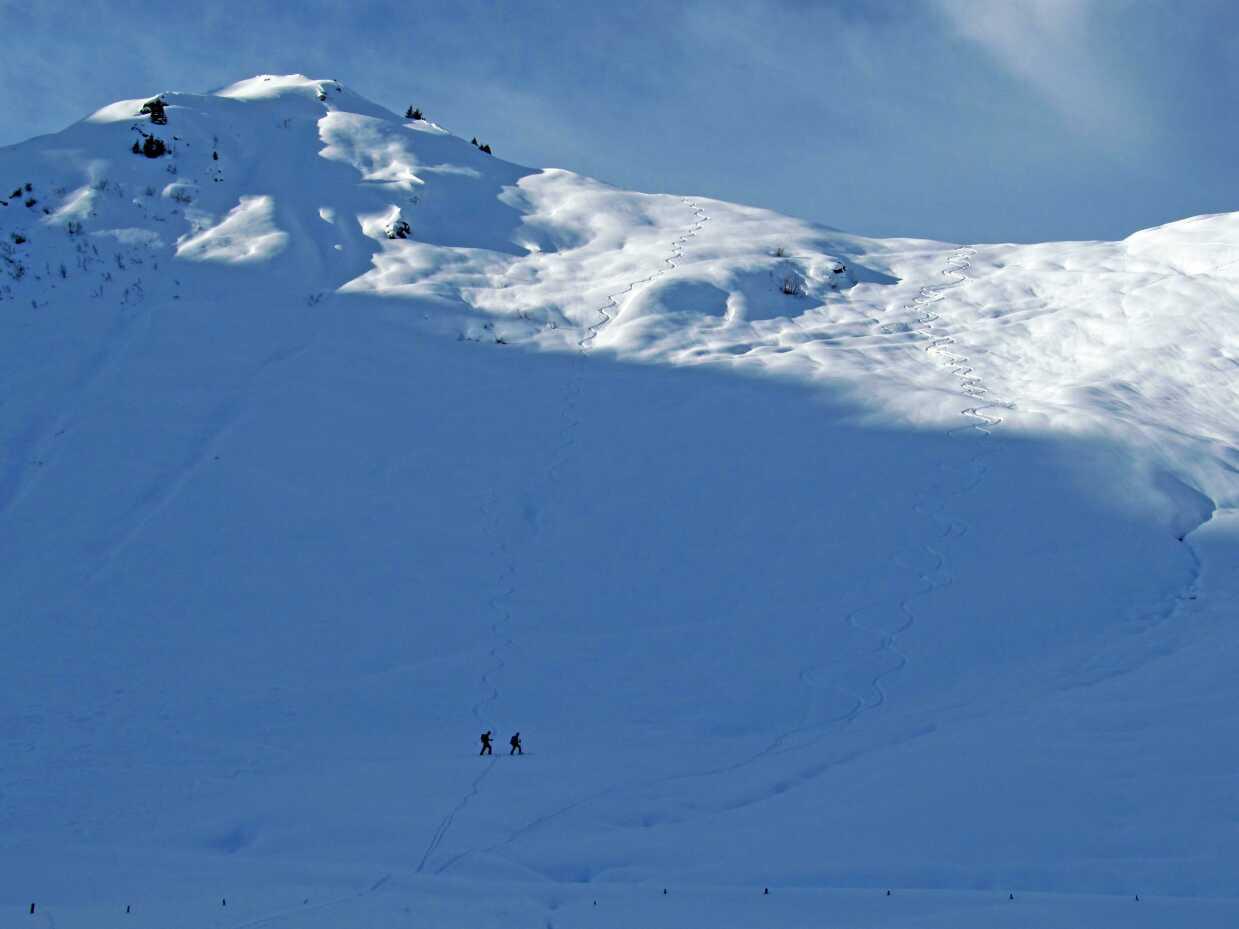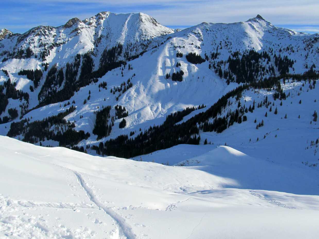 Schneelage: Im Pletzergraben nur wenig Pulverauflage auf fester Altschneedecke; mit zunehmender Höhe Anstieg der Pulverauflage bis auf ca. 20cm bei der Farmangeralm und weiter bis auf 30-40cm in Gipfelnähe. Die Pulverauflage ist sehr gut mit der Unterlage verbunden, keinerlei Abrutscher. In steilen Sonnenhängen leichter Harschdeckel, großenteils aber Pulverschnee vom Feinsten. Im unverspurten Abfahrtsgelände ist im Schatten bei diffusem Licht die Sicht manchmal etwas schwierig. Insgesamt aber tolle Pulverbedingungen.