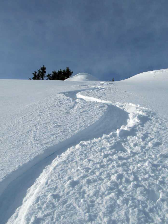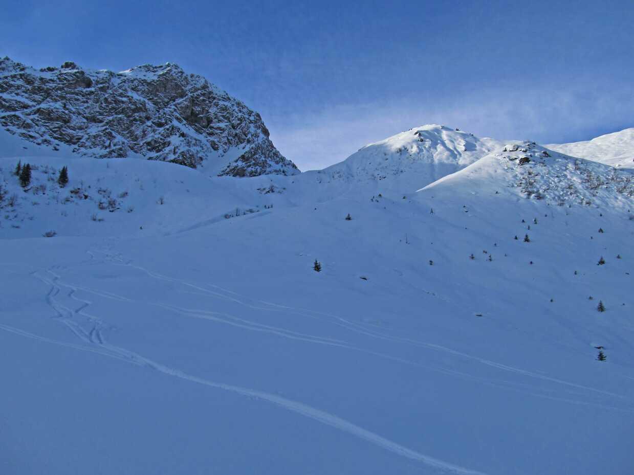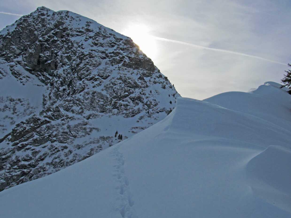 Schneelage: Im Pletzergraben nur wenig Pulverauflage auf fester Altschneedecke; mit zunehmender Höhe Anstieg der Pulverauflage bis auf ca. 20cm bei der Farmangeralm und weiter bis auf 30-40cm in Gipfelnähe. Die Pulverauflage ist sehr gut mit der Unterlage verbunden, keinerlei Abrutscher. In steilen Sonnenhängen leichter Harschdeckel, großenteils aber Pulverschnee vom Feinsten. Im unverspurten Abfahrtsgelände ist im Schatten bei diffusem Licht die Sicht manchmal etwas schwierig. Insgesamt aber tolle Pulverbedingungen.