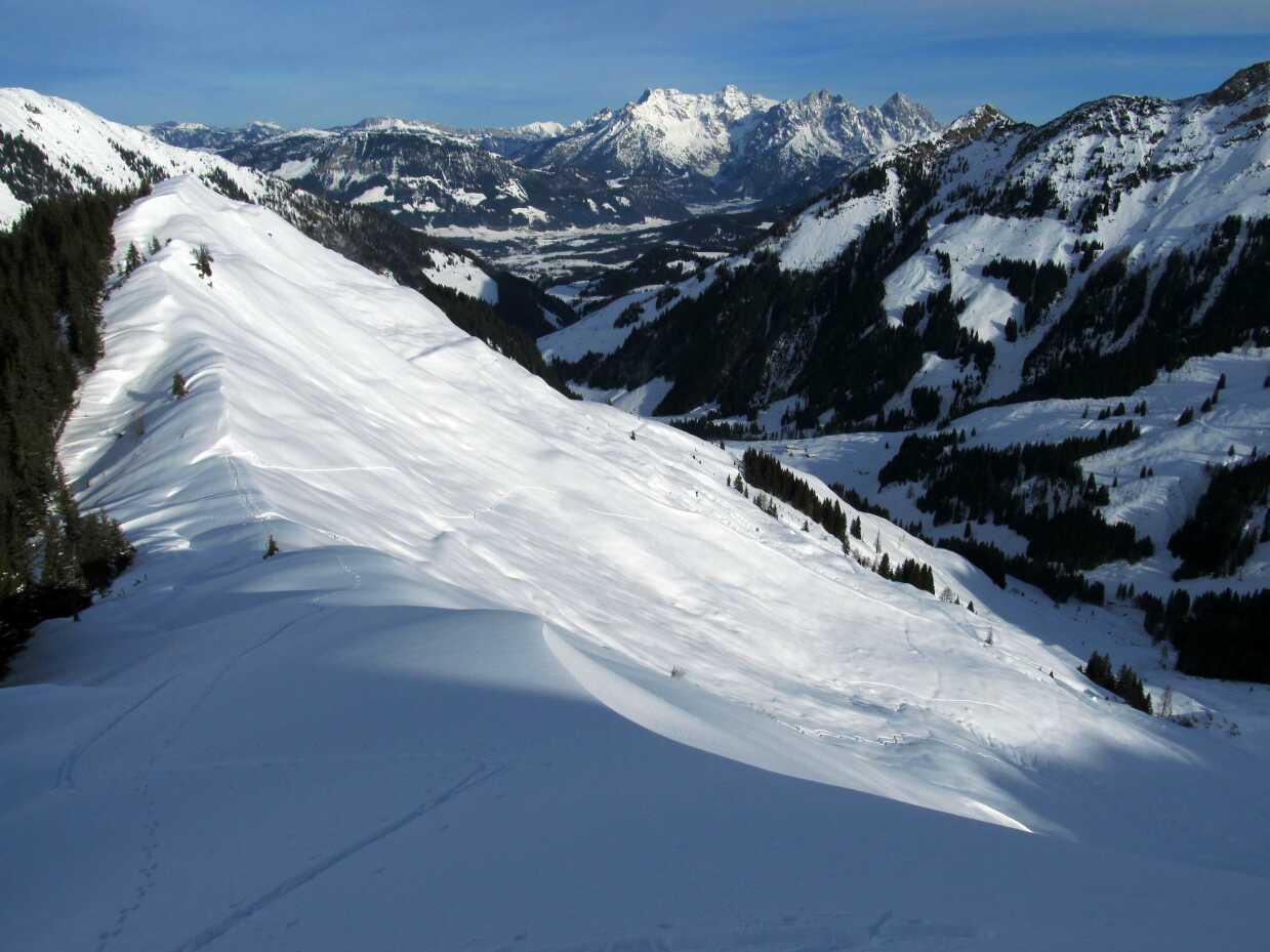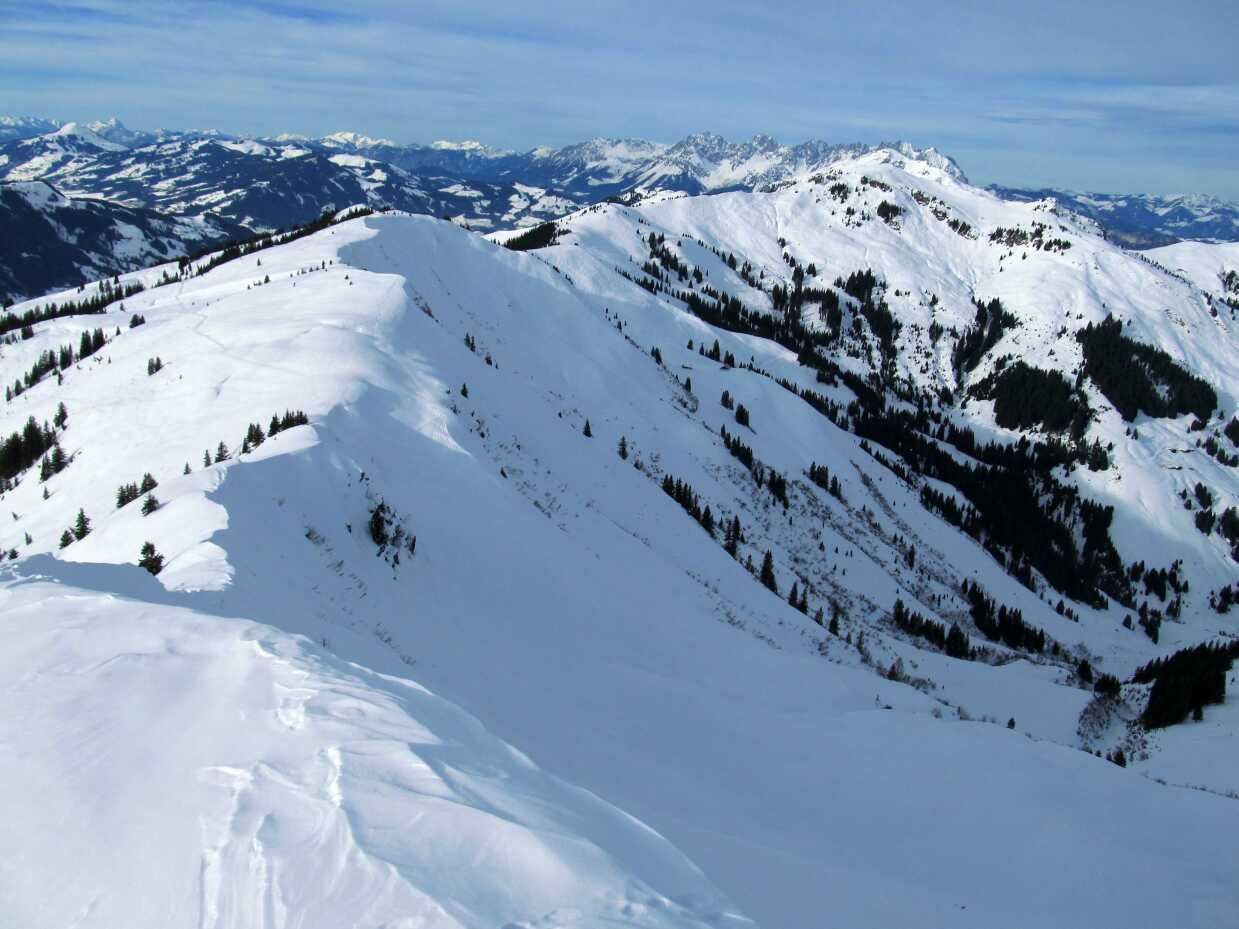 Vom PP Fieberbrunn/Pletzergraben (ca. 850) durch den Graben zur Farmanger Niederalm (1227) gehatscht (ca. 11/4 Stdn.). Dann Richtung Gebrakapelle aufgestiegen, aber noch unterhalb dieser nach rechts hinauf zu einem Sattel (1760) und noch ca. 50Hm den Gratrücken nach Süden hinaufgespurt.