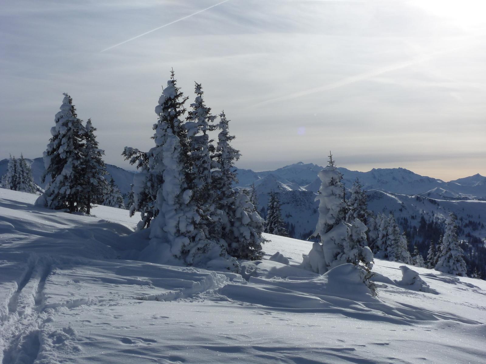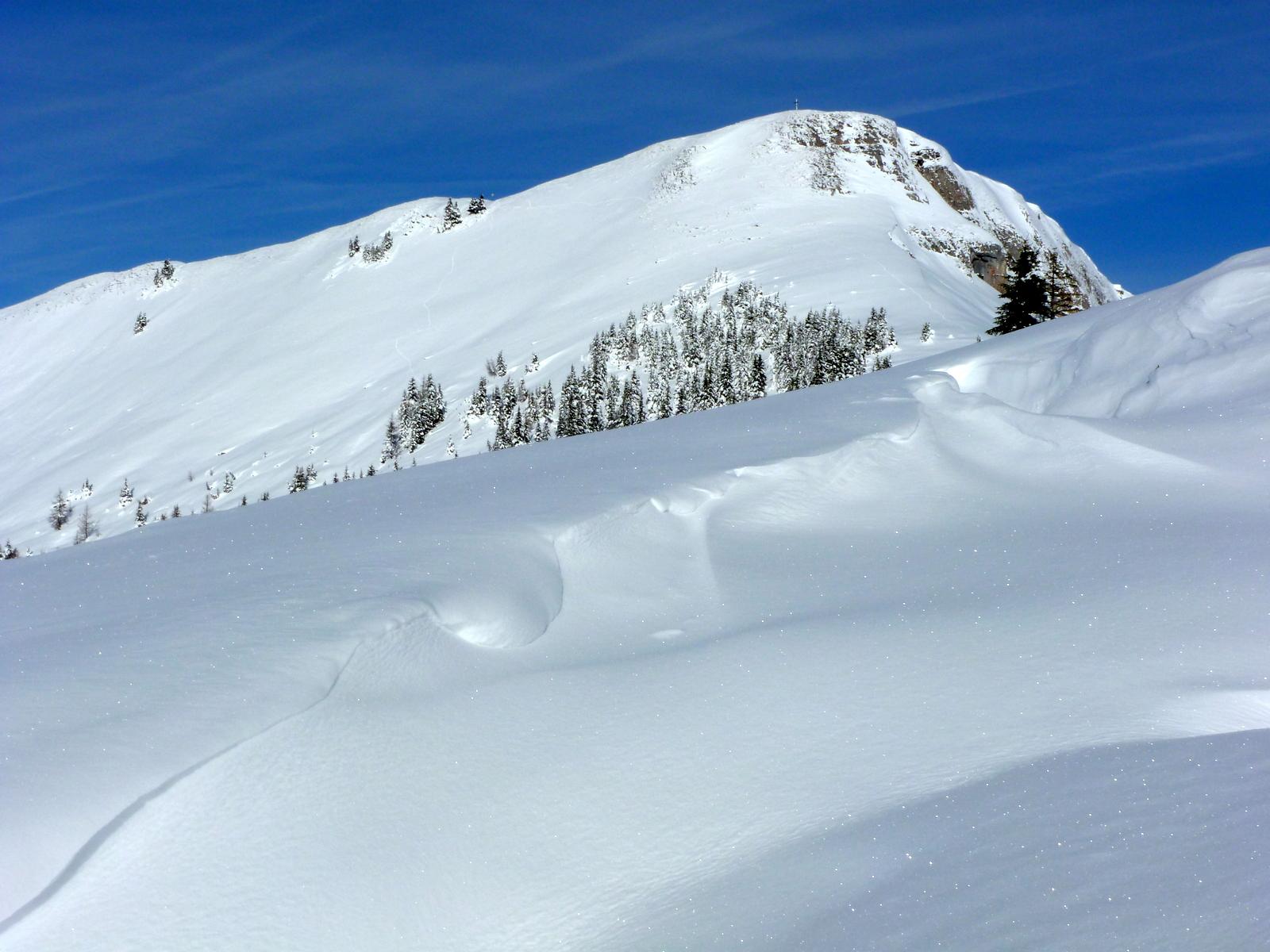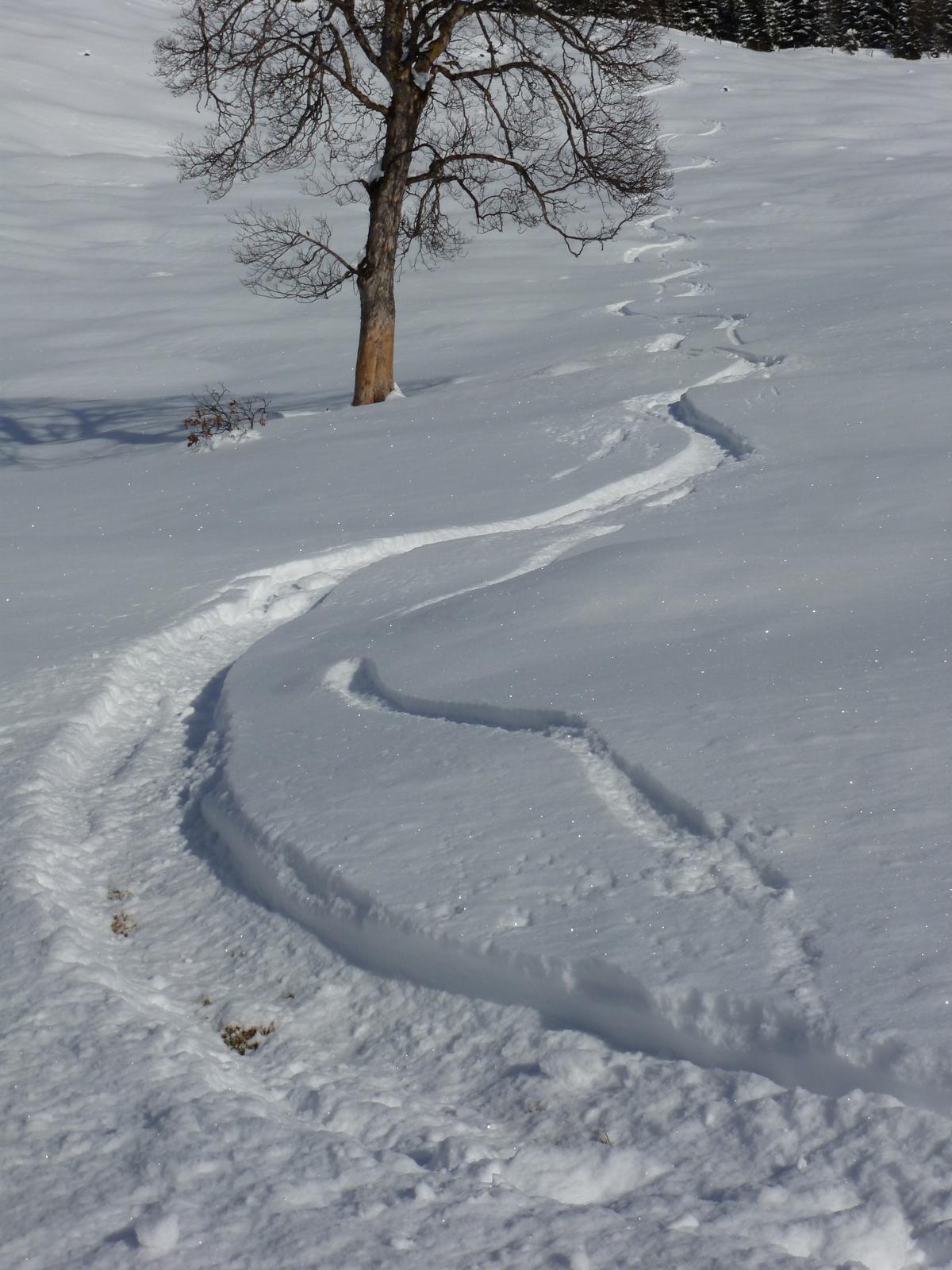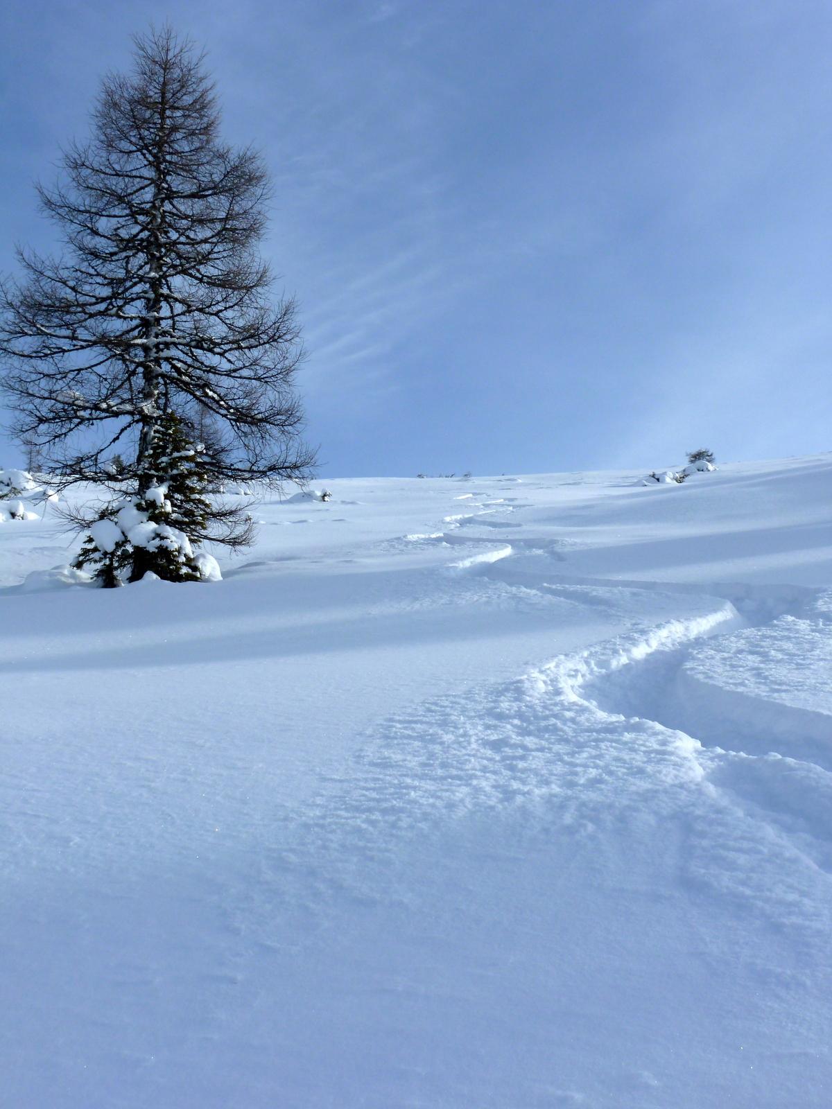 Anstieg über Breitenebenalm und den oberhalb nach Osten führenden Geländerücken bis zur Höhe nahe der Kote 1981. Starke Windverfrachtung und eine ausgeprägte aufbauende Umwandlung in den bodennahen Schichten, besonders bei geringerer Mächtigkeit der Schneedecke. Schneehöhen und Einsinktiefen beim Anstieg daher recht unterschiedlich. Angesichts der geringen Schneeauflage verzichtete ich heute leichten Herzens auf den Gipfel. Überraschend gut die Abfahrt über die W-exponierten Hänge hinunter Richtung Karsegg-Alm. Die Waldpassage zurück zu den Hängen oberhalb der Breitenebenalm grenzwertig - zumindest wenn man seine Ski noch schätzt. Der letzte freie Hang zur Breitenebenalm sieht schöner aus als er derzeit zu fahren ist - selbst bei "weichster" Fahrweise waren "Aufsitzer" heute unvermeidlich.