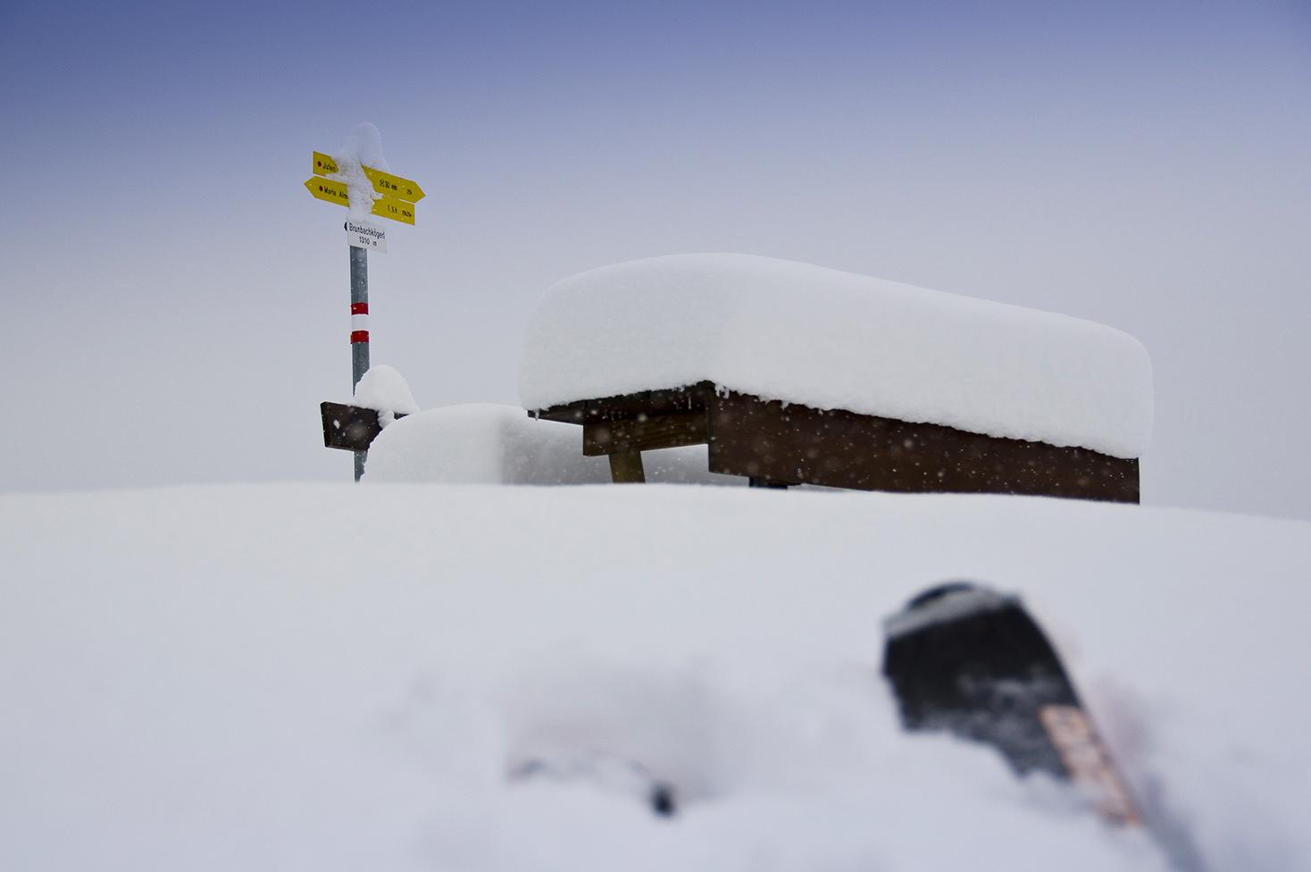 Von Maria Alm: Ins "Sandtn" bis über die Materialseilbahn, - ca 50cm ungesetzter Pulverschnee an der Südseite des Steinernen Meeres, auf 1600m Höhe nicht windbehandelter lockerer Neuschnee. Trotzdem ab und zu Felskontakt bei der Abfahrt, - s ist halt keine Wiesn.