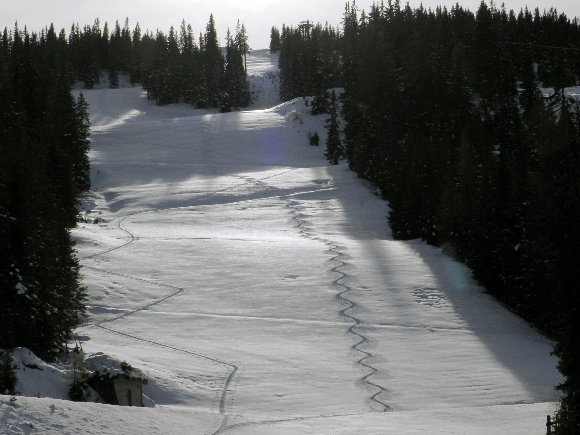 Der Zugang/Rückweg ist das Problem - etwa 1km nach dem Sattel kann man der Markierung "Mühlbach" unter der Hochspannungsleitung 20 Minuten leicht abwärts folgen, bis man auf die Piste trifft - oder man nimmt den Forstweg (abwärts nicht für Schiabfahrt geeignet) am Sattel bis 1500 m Höhe, fährt dann 150 Höhenmeter auf der Piste ab. Über den Fellersbach, dort die Piste hinauf zum Schneeberg.