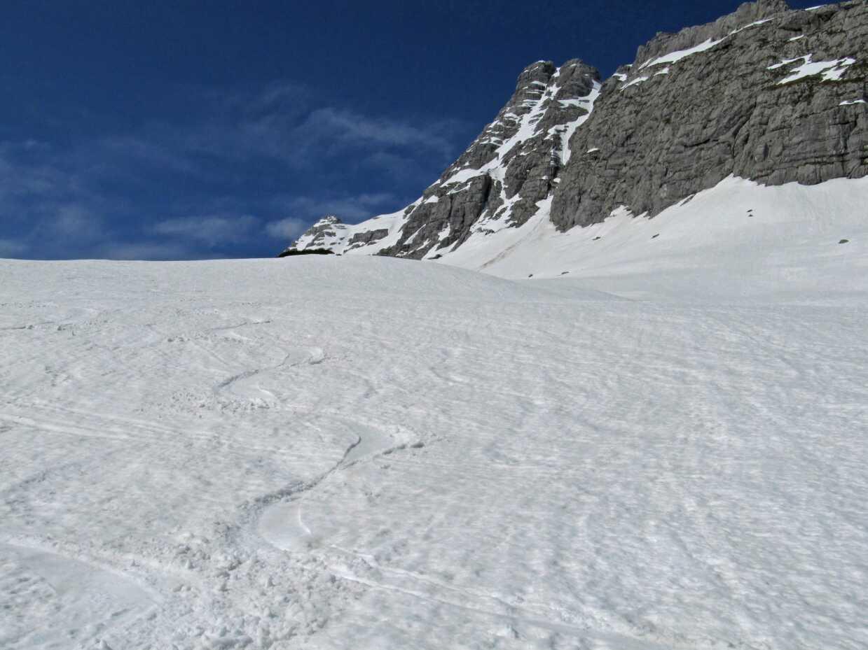 Schnee sehr kompakt, kein Batz, deshalb war auch die Abfahrt von oben bis unten ein Firnvergnügen.