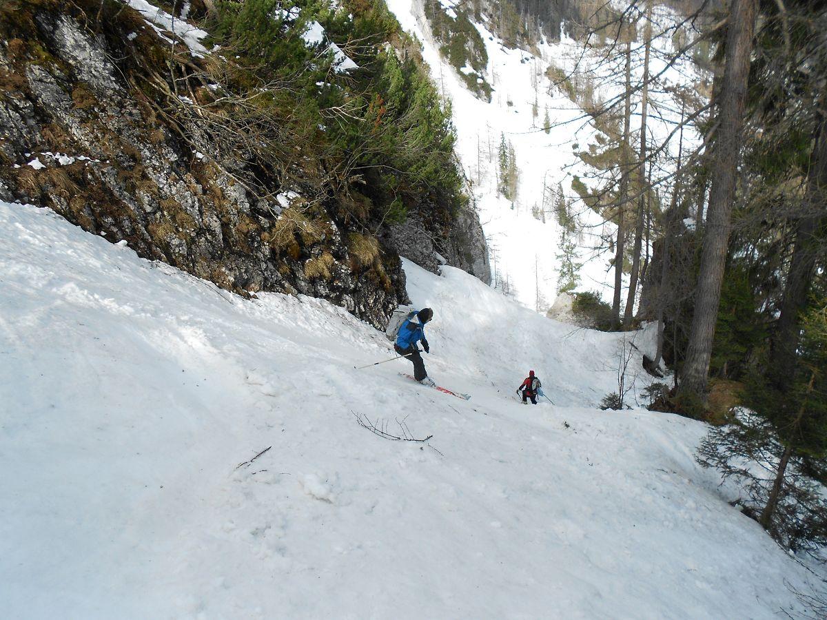 Aufstieg mit Harscheisen auf festem Harschdeckel, nur die letzten Meter zur Scharte zu Fuß, die letzten Meter unter dem Gipfel aper. Abfahrt über die Kleine Weitscharte aufgefirnt, am angenehmsten ließ es sich in den alten Lawinenbahnen fahren, sonst eher zu weich. Dann immer linkshaltend zu den Ausläufern der Scharlingrinne und direkt zurück zum See.
