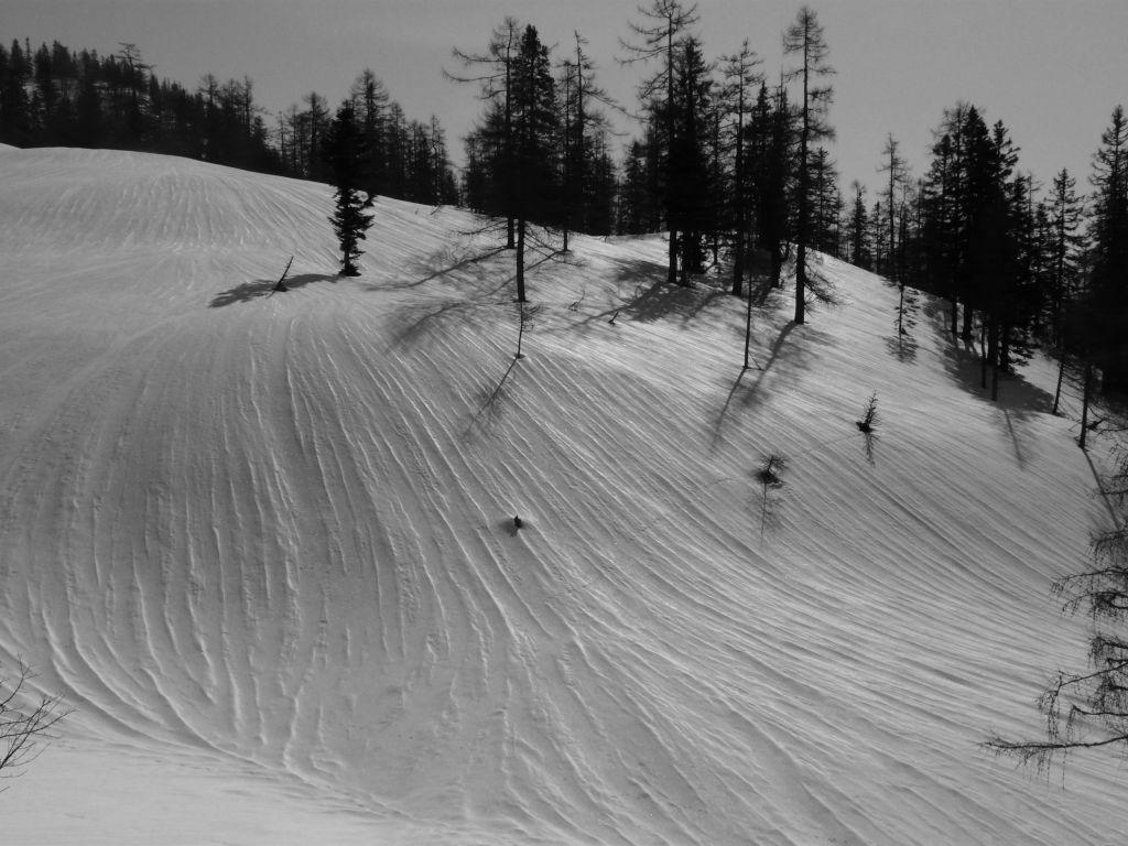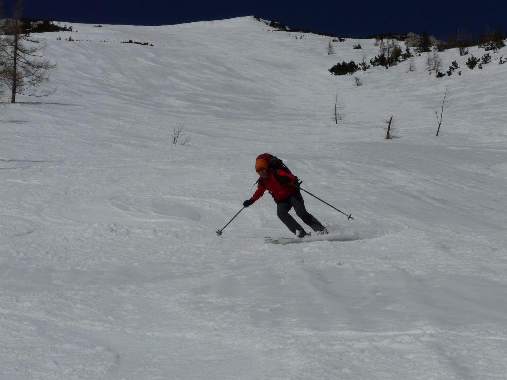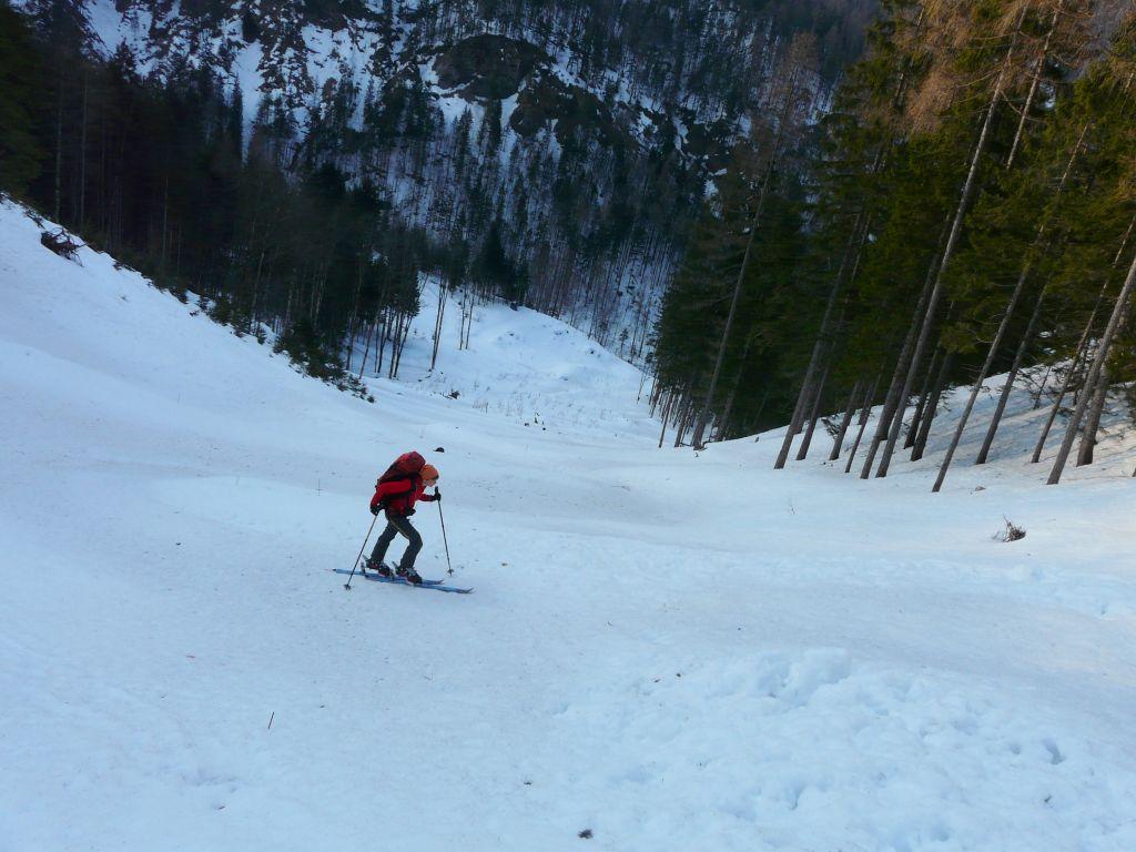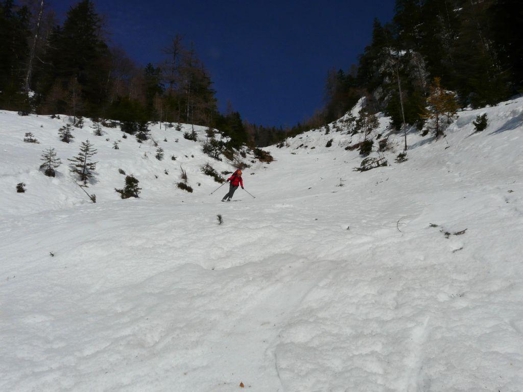 Abfahrt Südflanke/Merkensteinrinne, Abfahrt noch durchgängig möglich, allerdings im untersten Abschnitt durch den Wald.