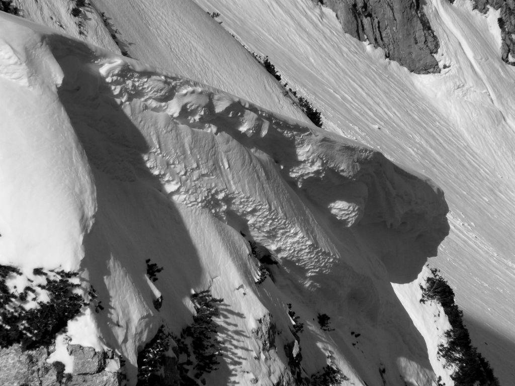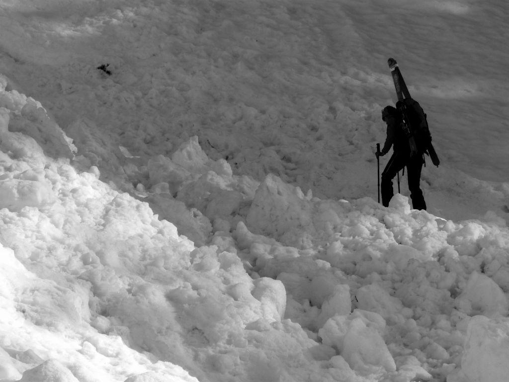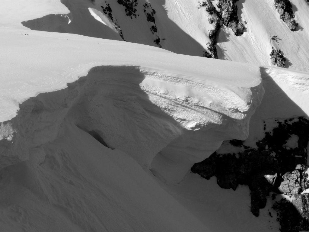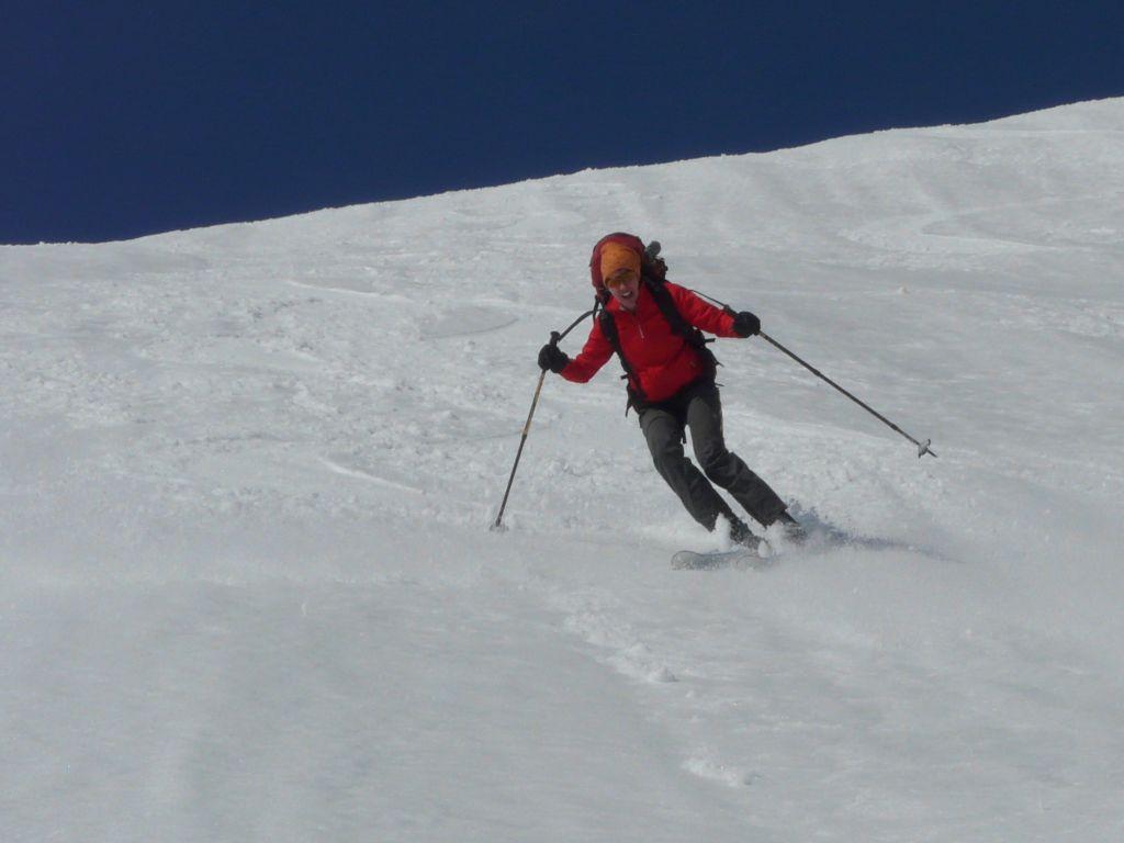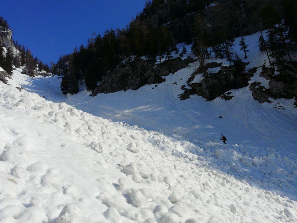 Abfahrt Südflanke/Merkensteinrinne, Abfahrt noch durchgängig möglich, allerdings im untersten Abschnitt durch den Wald.