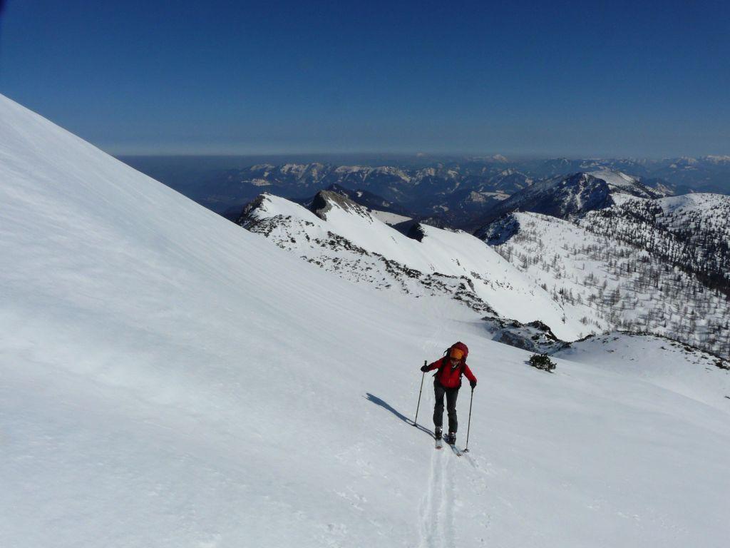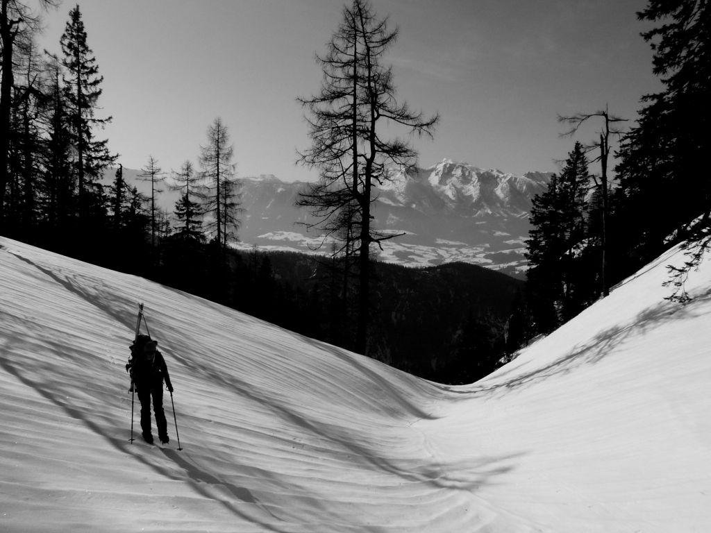 Schnee fest gefroren, stellenweise bereits leicht aufgefirnt, 1 Stunde vor uns ca. 10 Tourengeher unterwegs zum Gamsplan.