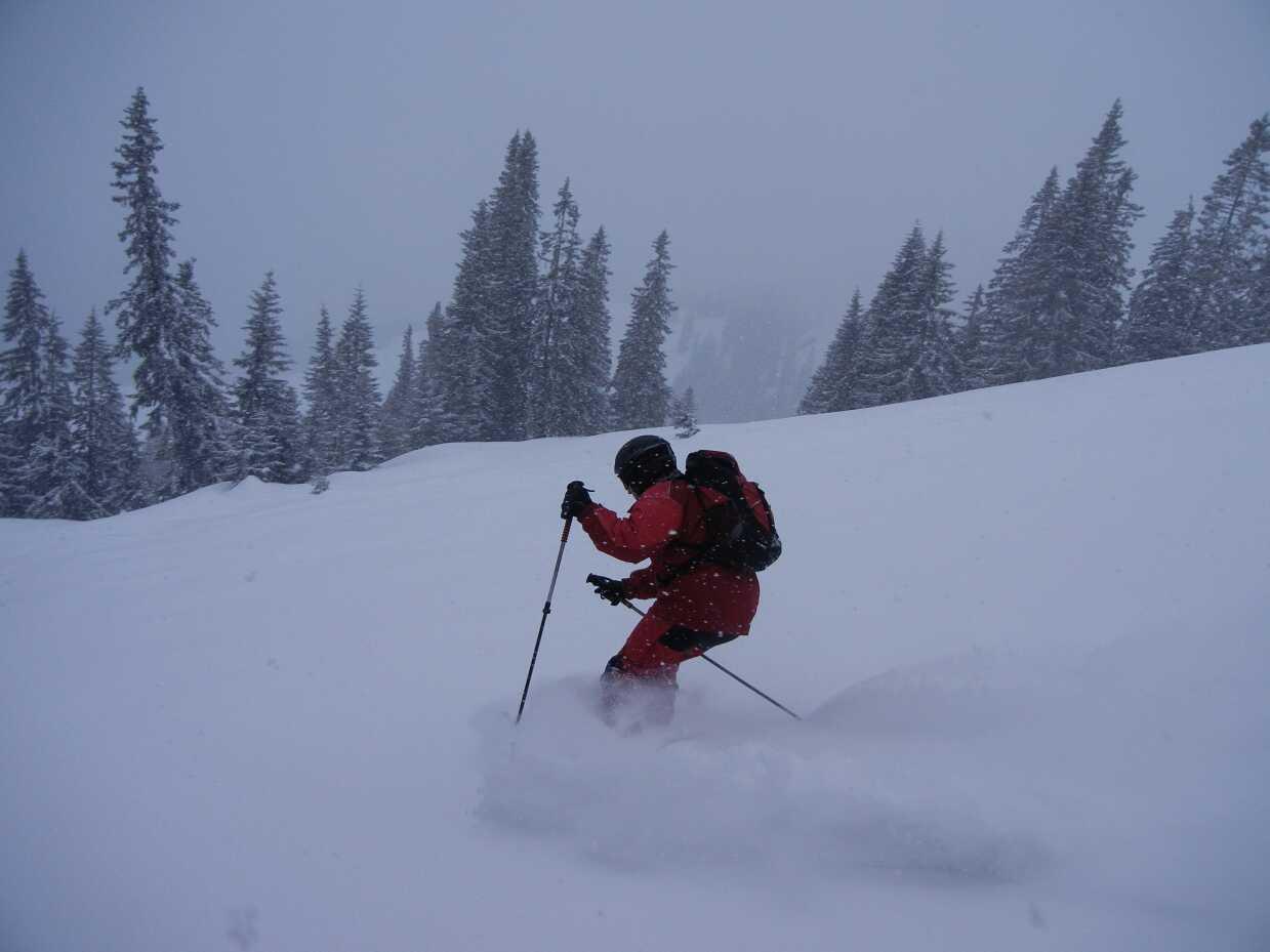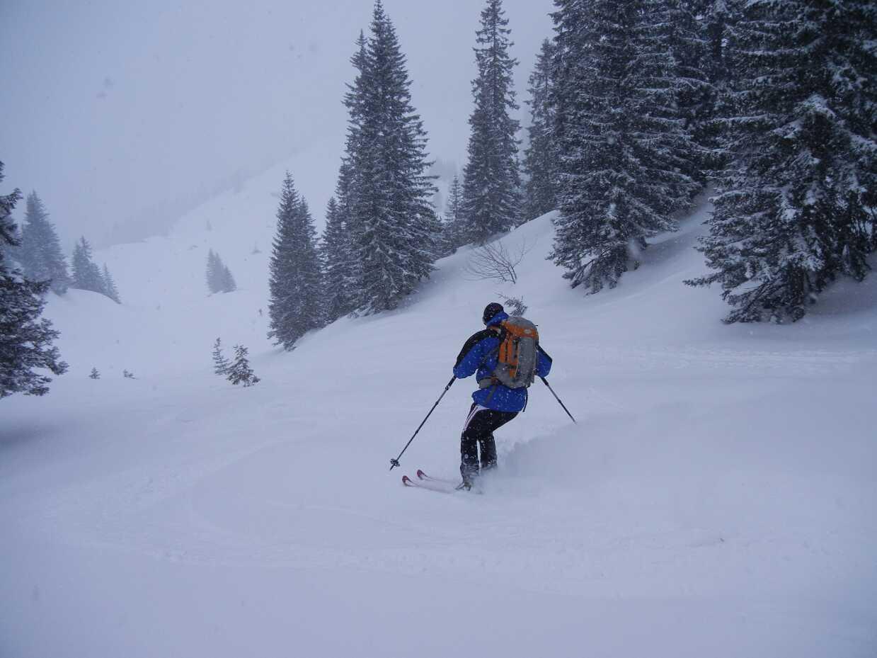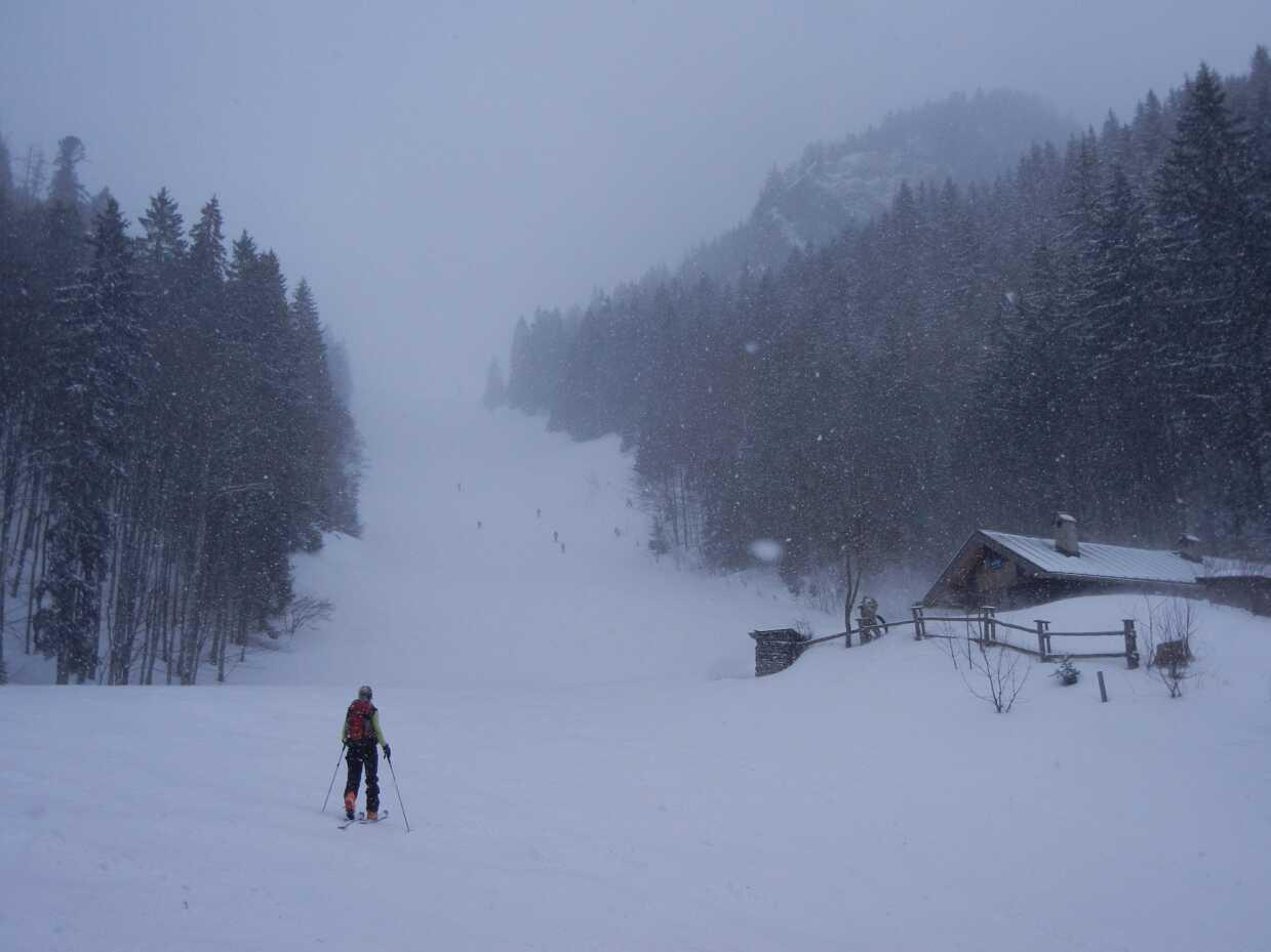 Vom Heutalbauern (1000) über die Hochalm zum Sonntagshorn (1961) aufgestiegen. Die Stockeinsinktiefe von über 50cm im Tal ließ uns für die Abfahrt nichts Gutes erahnen. Im Tal hatte es ca. 2cm Neuschnee auf tiefer Sulzunterlage, ab der Hochalm war aber die Unterlage deutlich fester mit ca. 5-10cm Pulverauflage. Die Abfahrt auf der eingefahrenen Route war dann viel besser als anfangs befürchtet, z.T. sogar pistenartig. Am Gipfel windstill und neblig, trotz der schlechten Sichtbedingungen oben war die Abfahrt ein Genuss.