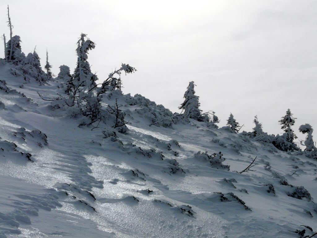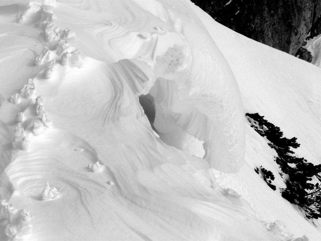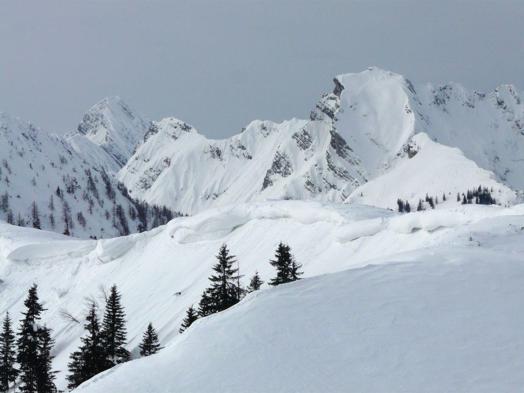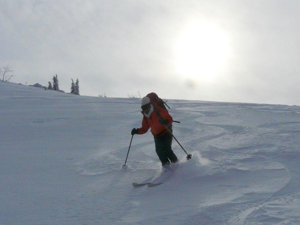 Abfahrt: teilweise lockerer Pulver, teilweise aber unangenehm plattig/gepresst. Einwehungen - vor allem bei der Abfahrt können wir gut umfahren. In Talbereichen nicht allzuviel Schnee.