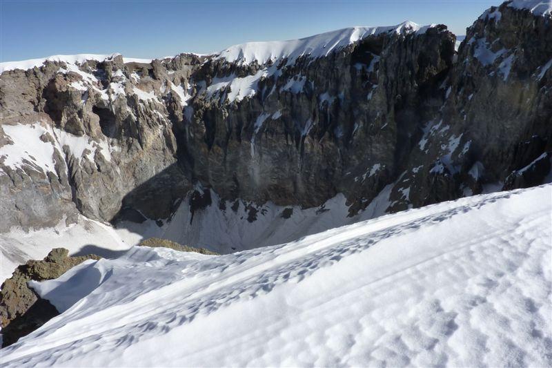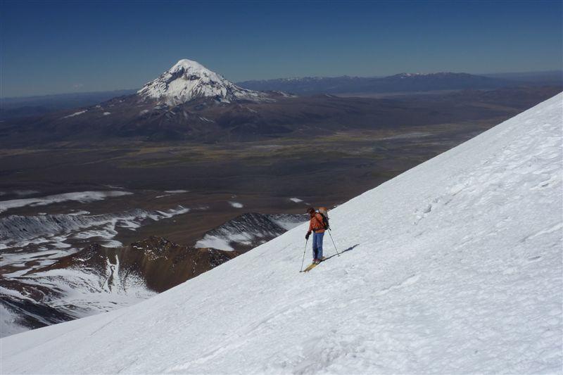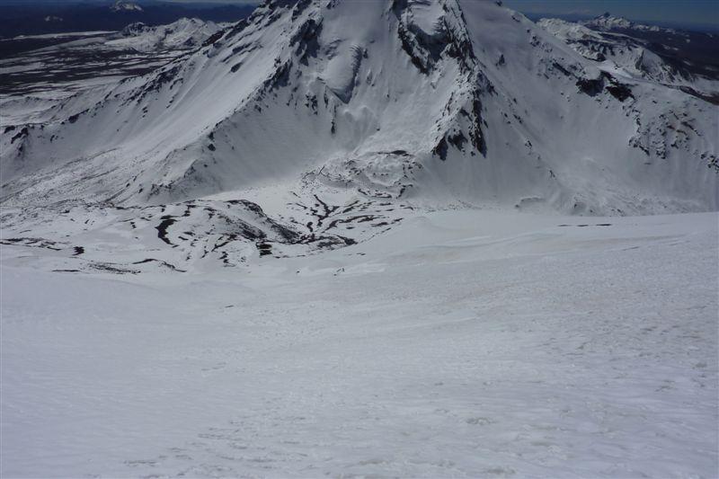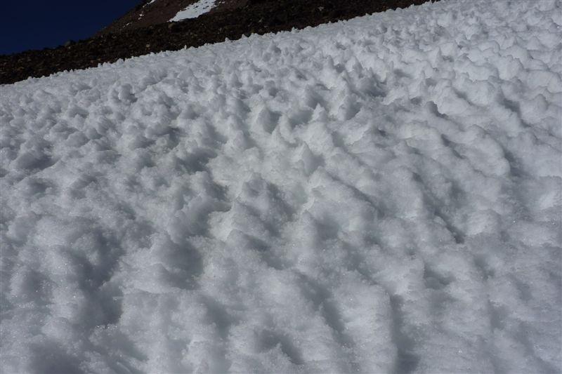 Abfahrt: Vergnügen wars keines (Mini-Penitentes-Rattern und übelster Bruch im untersten Bereich), aber dafür geht es wesentlich schneller als zu Fuß.Bis auf ca. 50 hm Abfahrt bis zum Camp.