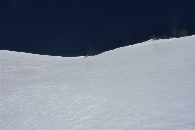 Schneesituation: hier ist es nix mehr mit der bis dahin gewohnten schön gleichmäßig glatten Oberfläche. Der Schnee beginnt "Zähne" zu zeigen, der Beginn des berüchtigten Büßereises. Mit Harscheisen geht das aber noch ganz gut. Dazwischen gibt es immer wieder kleinere Flächen von eingewehtem altem Presspulver.