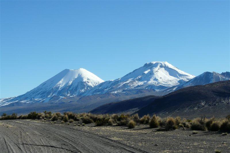 Nach mehrstündiger Fahrt von La Paz nach Südwesten zur chilenischen Grenze beherrschen 3 Berge das Blickfeld. Sajama, der höchste Boliviens, und die Zwillingsvulkane Parinacota und Pomerape.