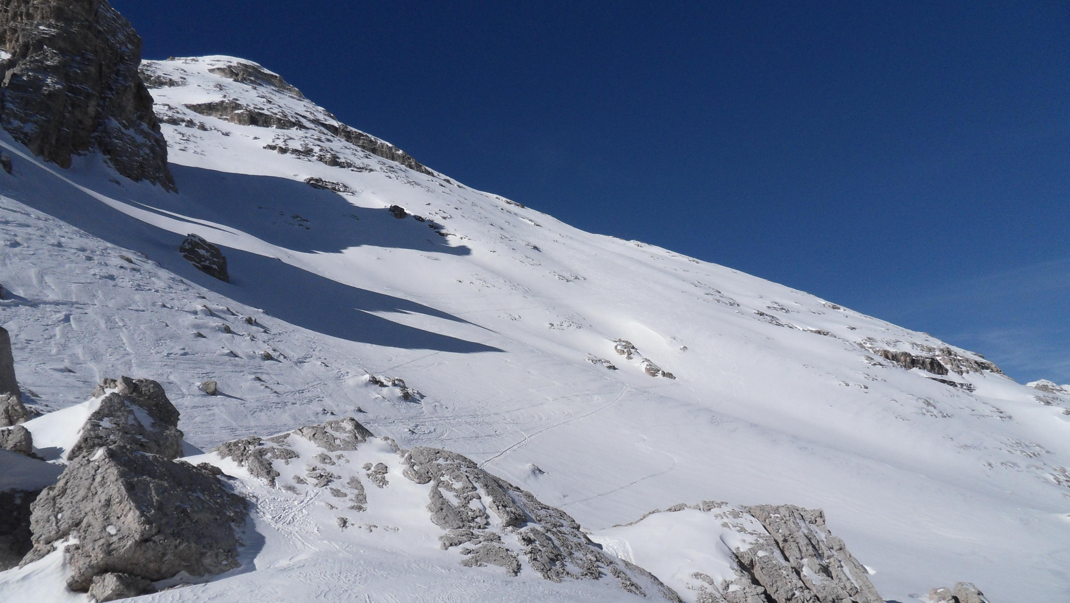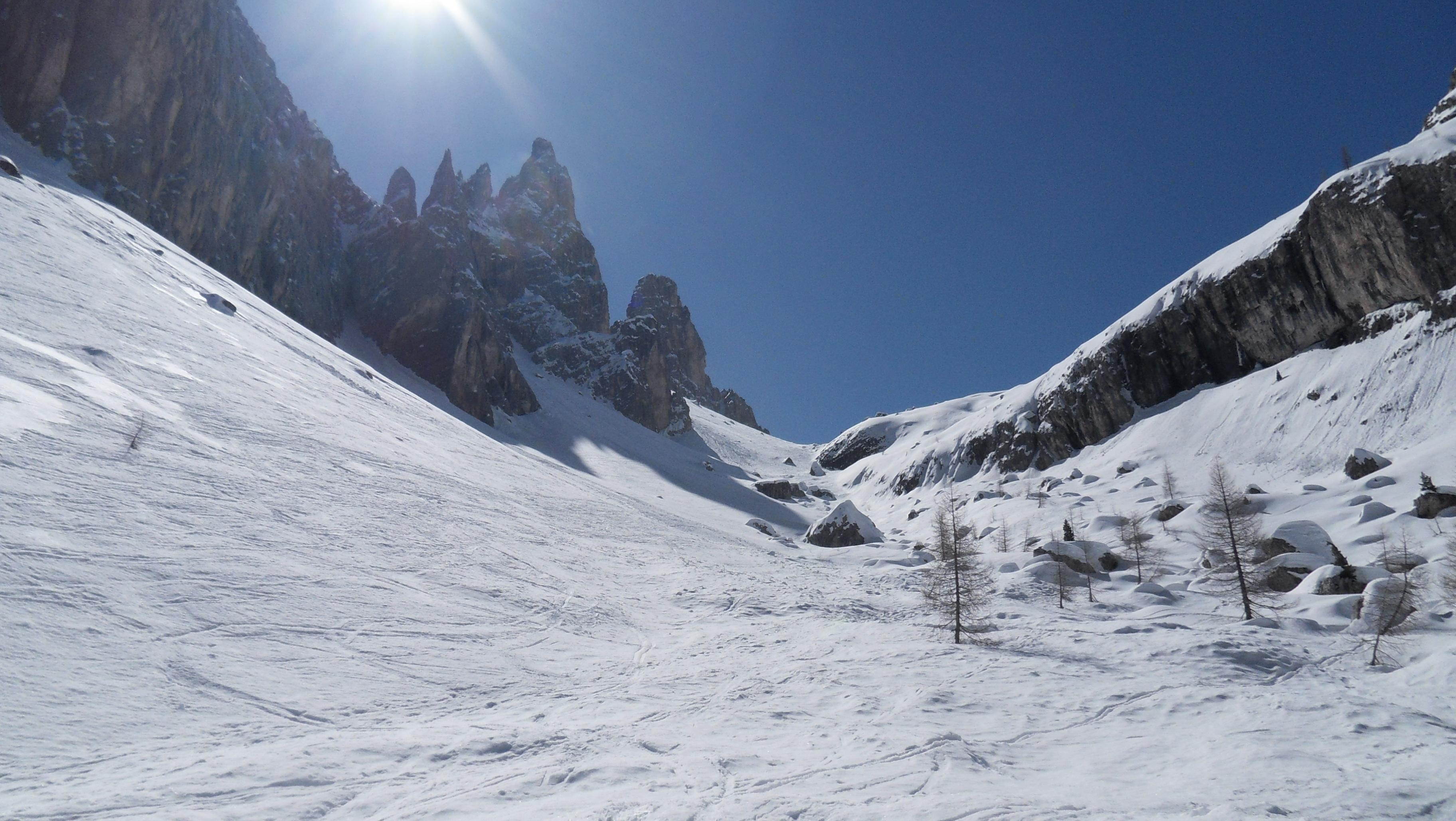 Im "Valon De Tofana" liegt noch genügend Schnee, kein Steinkontakt.