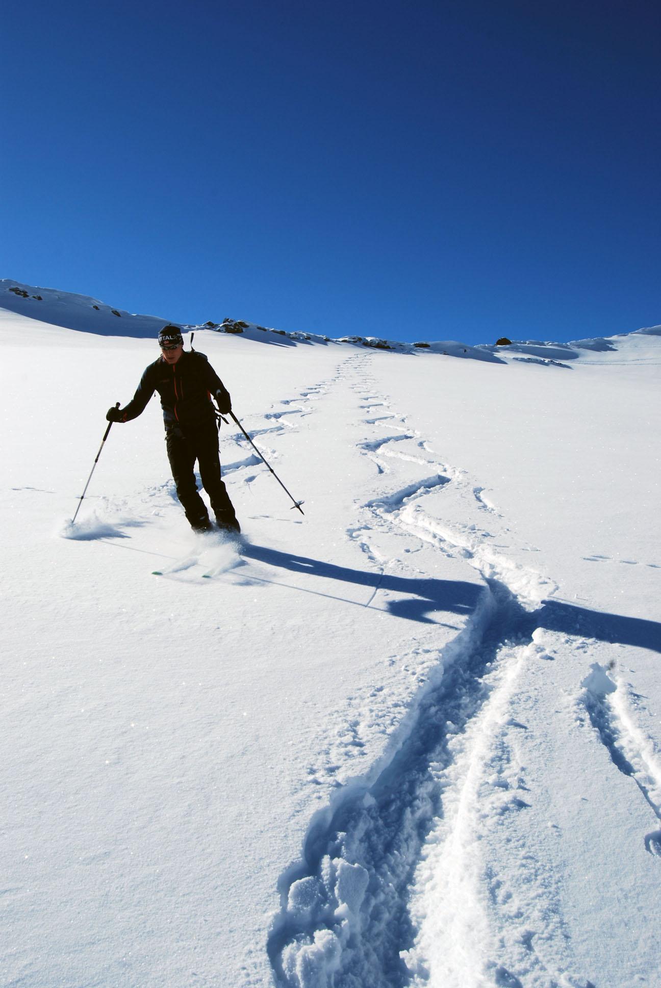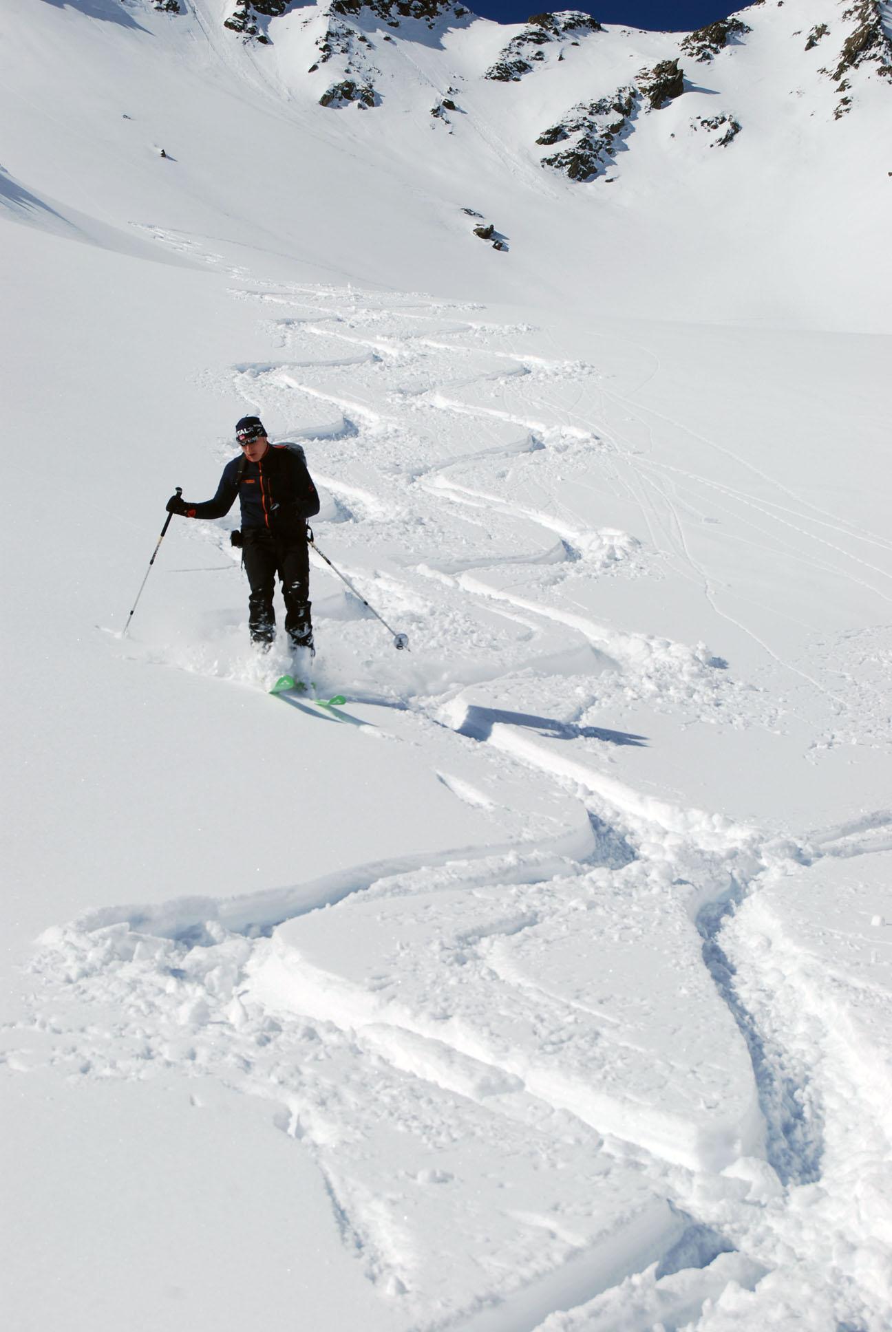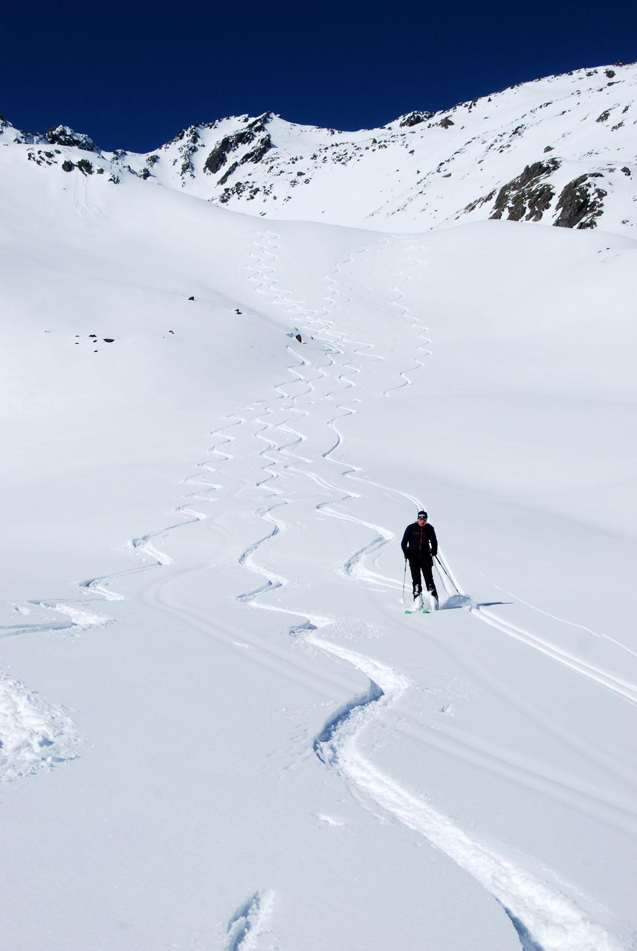 Die Abfahrt war ein einziger Pulvertraum in direkter Falllinie teilweise sehr steil in den Talgrund zur Materialseilbahn der Pforzheimer Hütte. Im Tal lief es dann gemütlich bis zum Parkplatz auf dem gewalzten Hüttenweg.