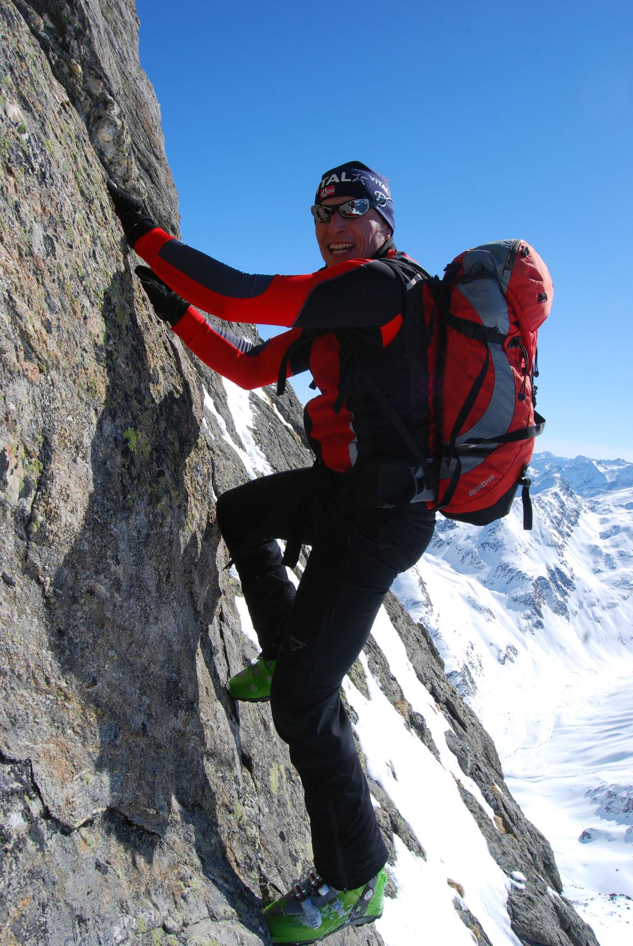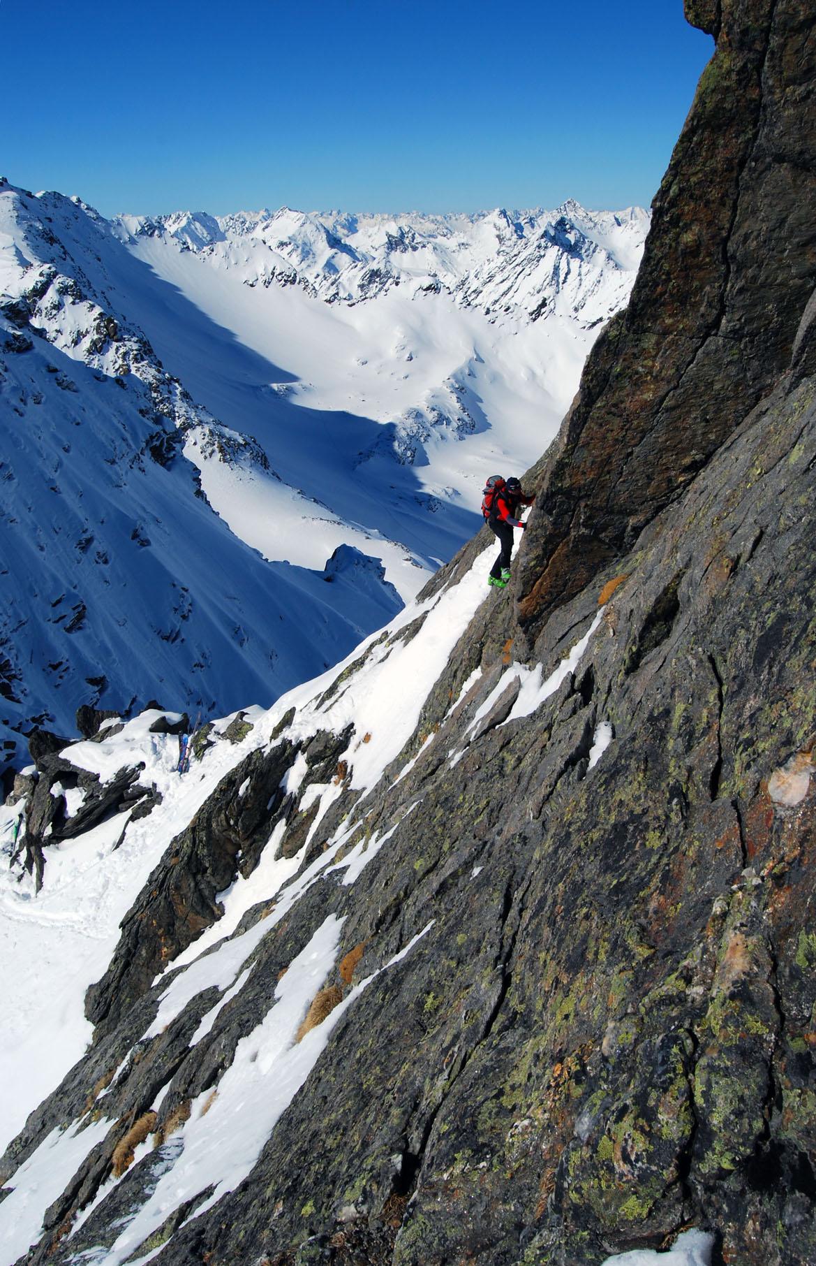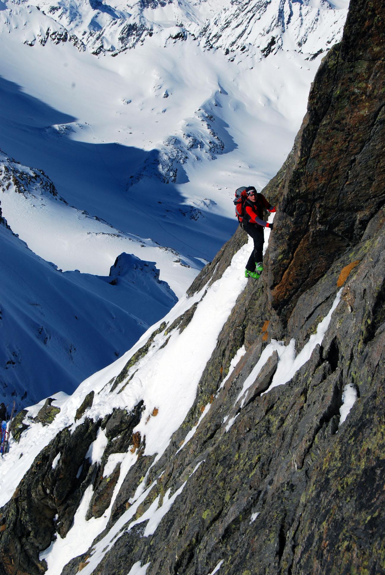 2. Tag: Aufstieg durch´s Kraspestal vor dem Massenandrang unzähliger Tourenfreunde auf den Zwieselbacher Roßkogel. Abfahrt über den Kraspesferner zu einer kleinen Einschartung. Der Aufstieg zur Rotgrubenspitze war dann sehr alpin. Wir versuchten erst über die Gratkante hochzuklettern doch ein senkrechter Riss versperrte uns den Weiterweg. Erst als dann zwei Locals zur Scharte kamen zeigten sie uns über eine sehr luftige Plattenquerung den Schlüssel zum Gipfel.